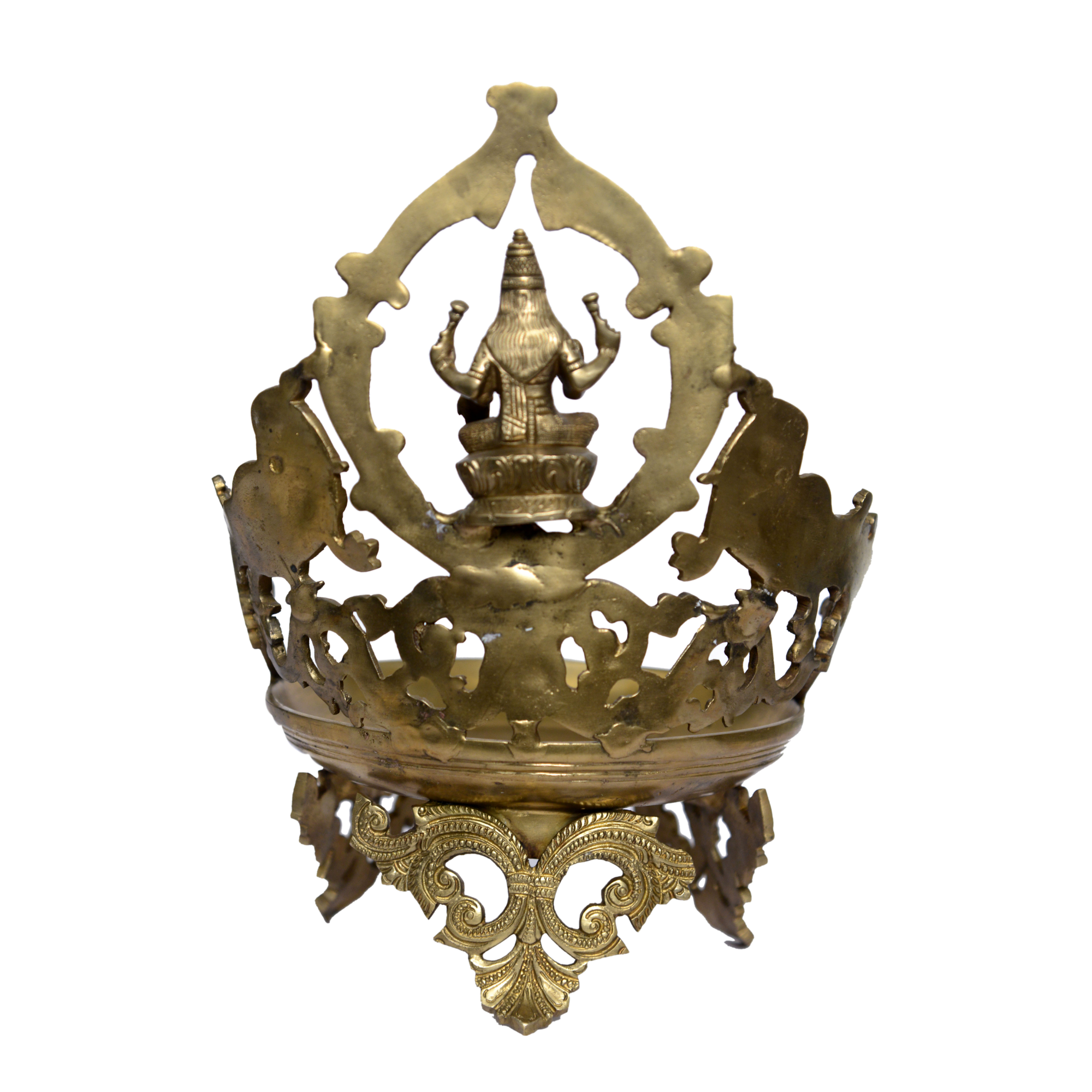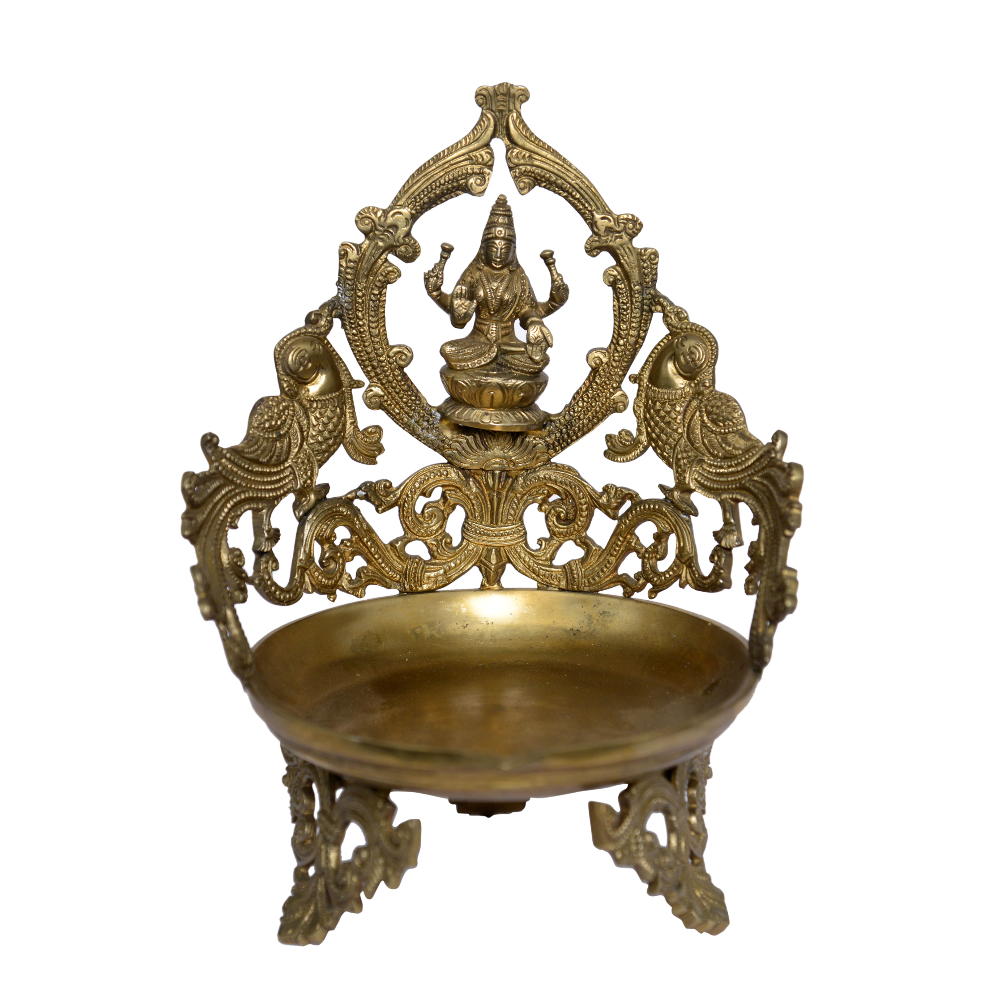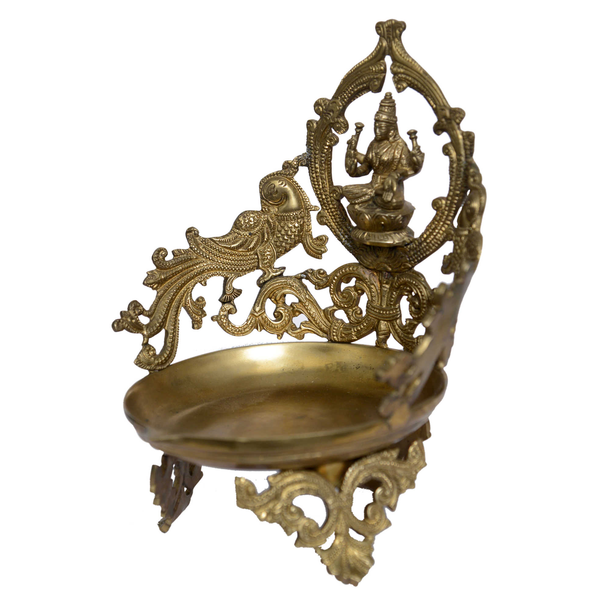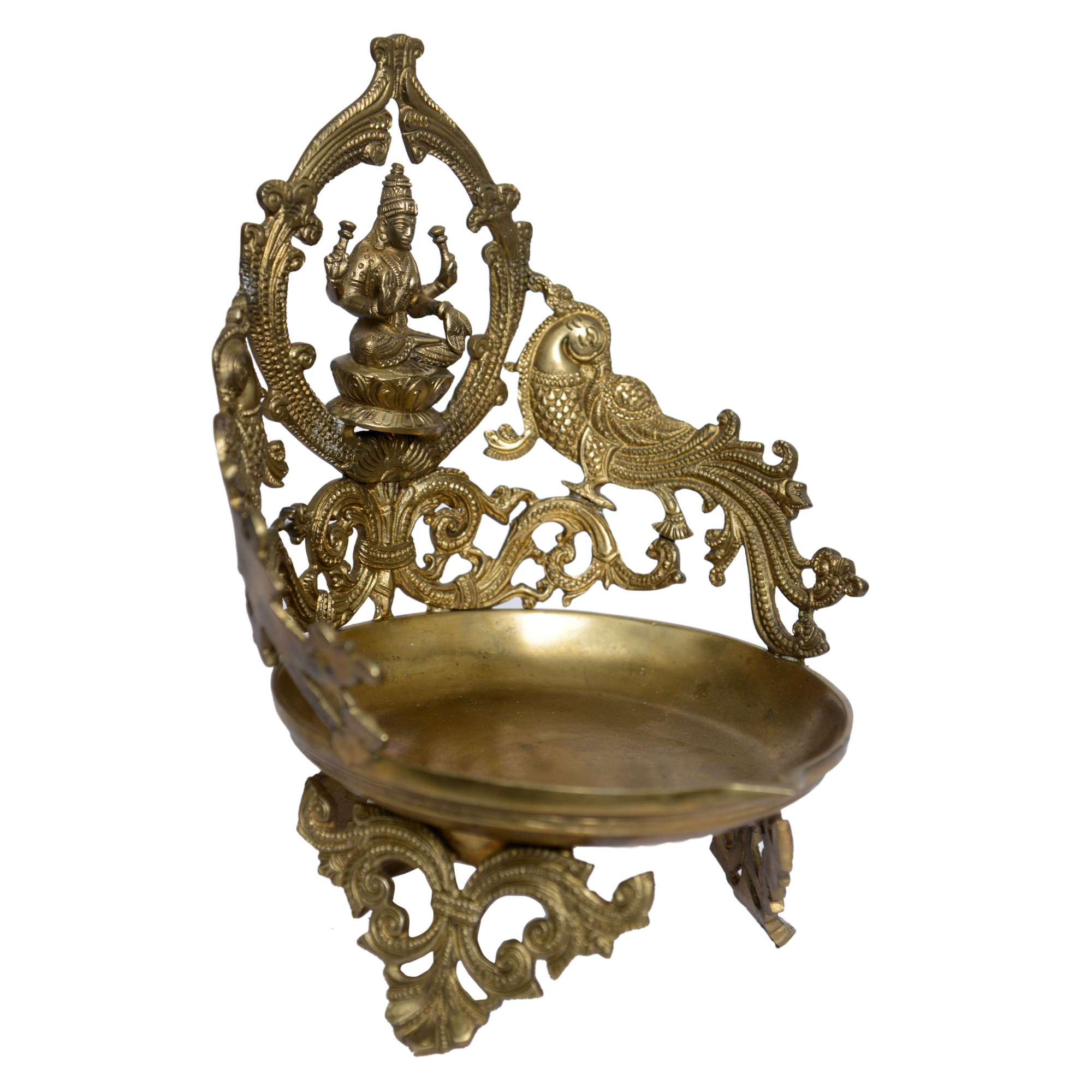 - Goddess Lakshmi Design - Grand brass diya featuring Goddess Lakshmi figure, combining oil lamp with deity for wealth and prosperity