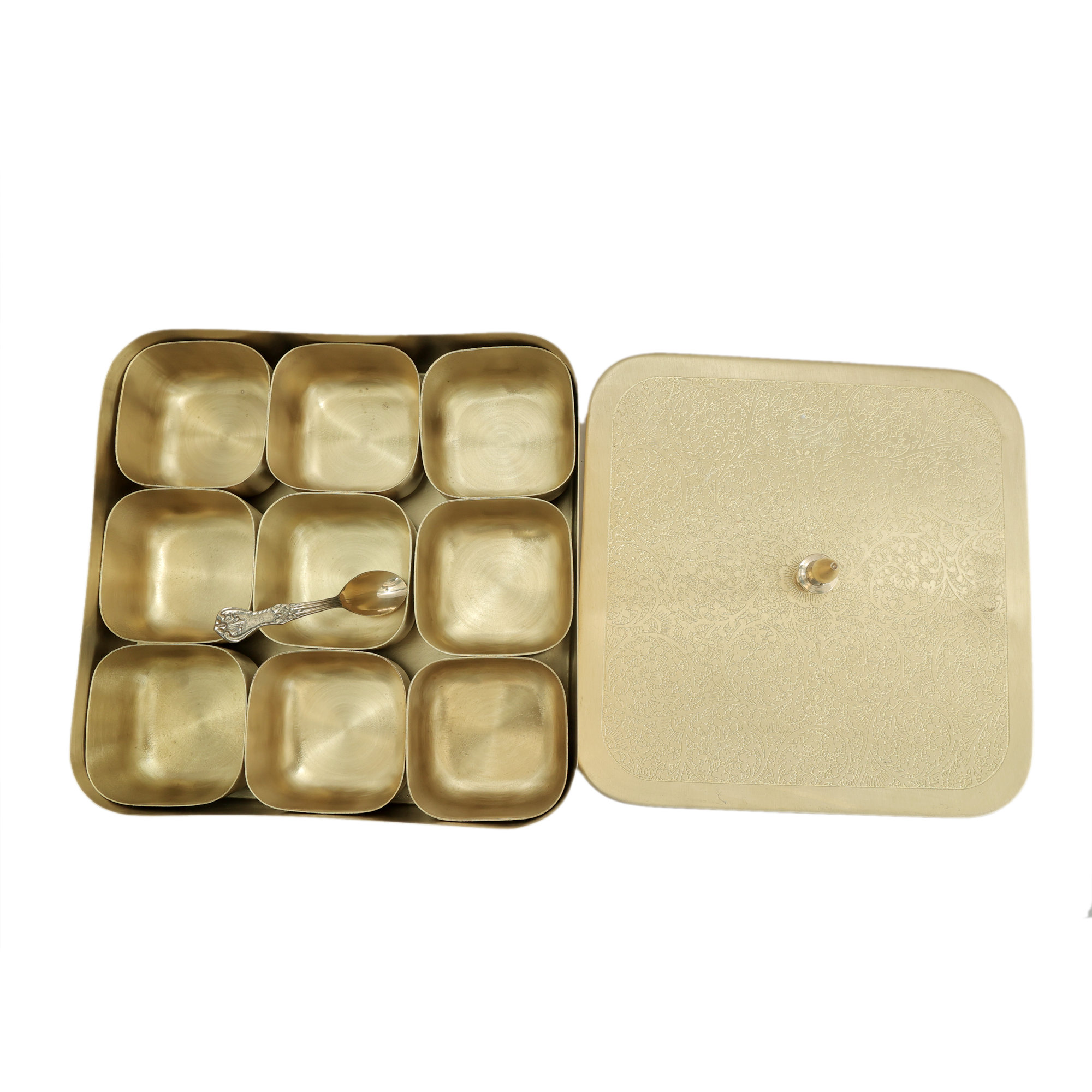 Experience ultimate spice organization with this magnificent extra large brass masala box, perfect for storing extensive spice collections in your kitchen and temple area. Made from pure heavy brass with stunning golden finish, this grand traditional spice container offers maximum storage capacity while maintaining freshness of your precious masalas. The artistic design with fine craftsmanship provides ample space for multiple spices, turmeric, kumkum, vibhuti, and complete pooja essentials collection.