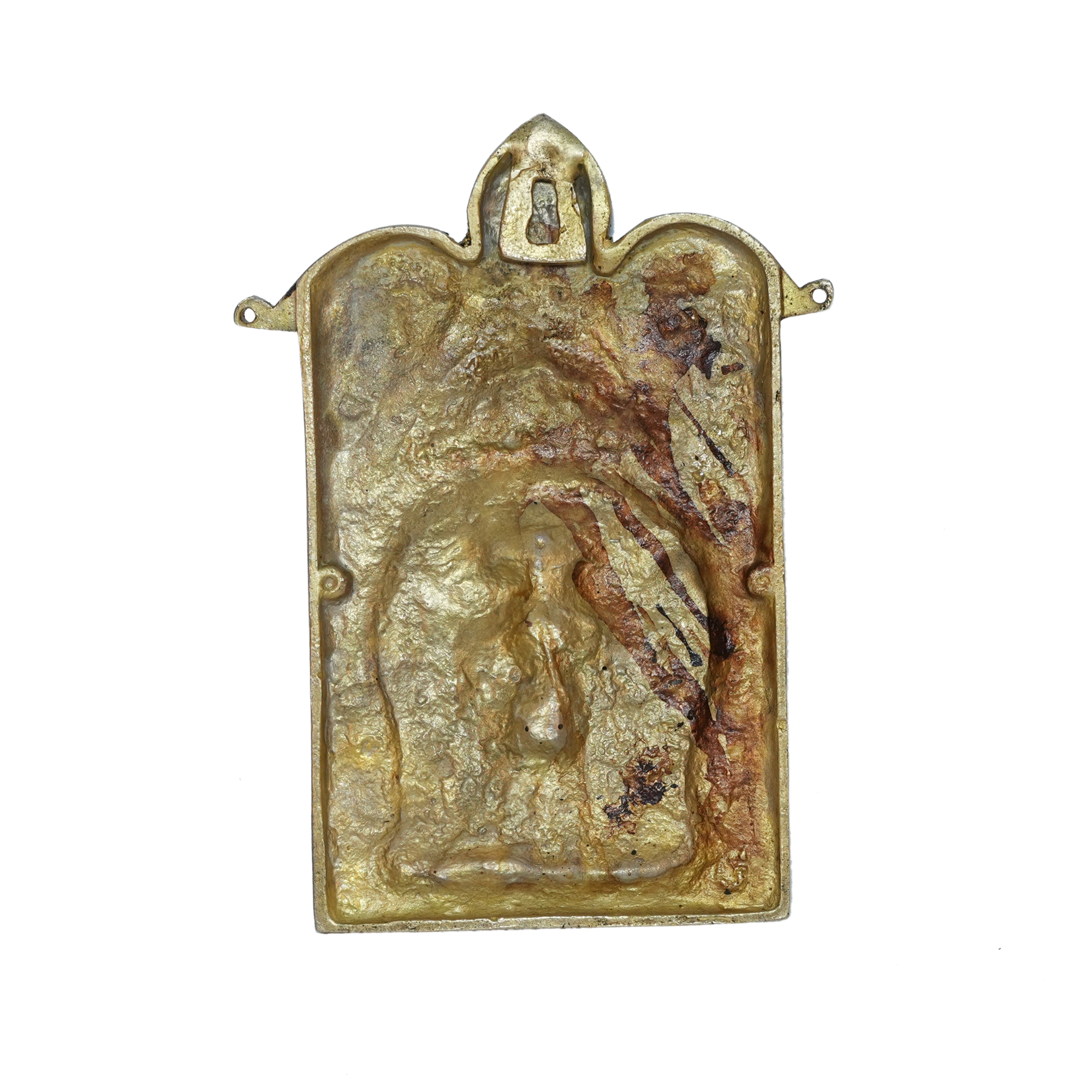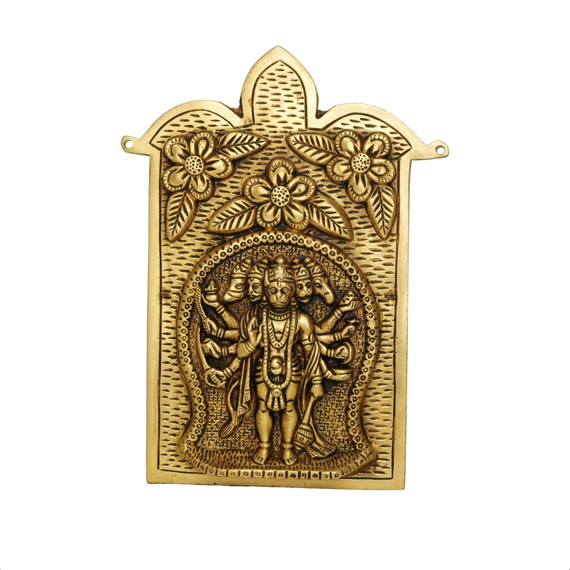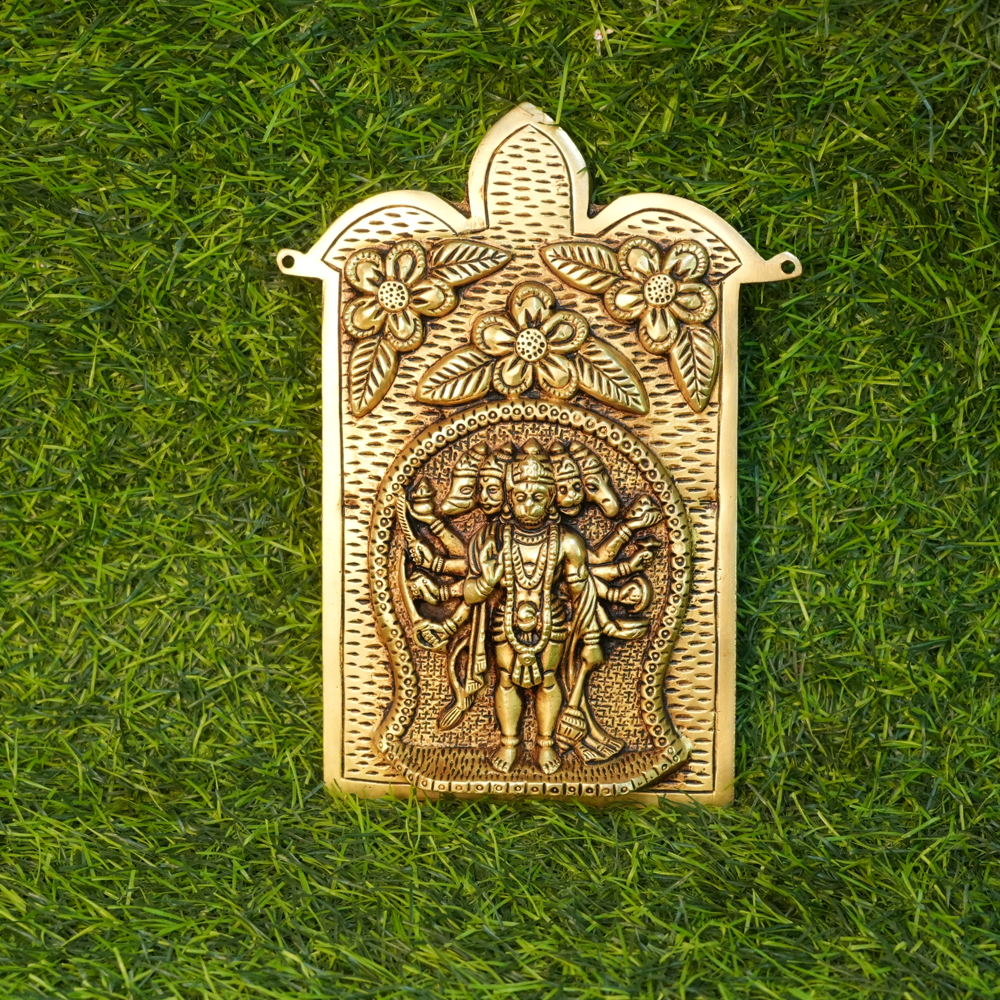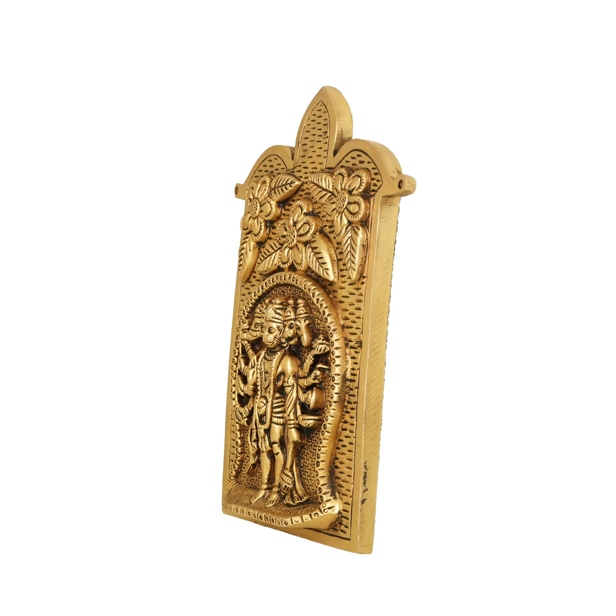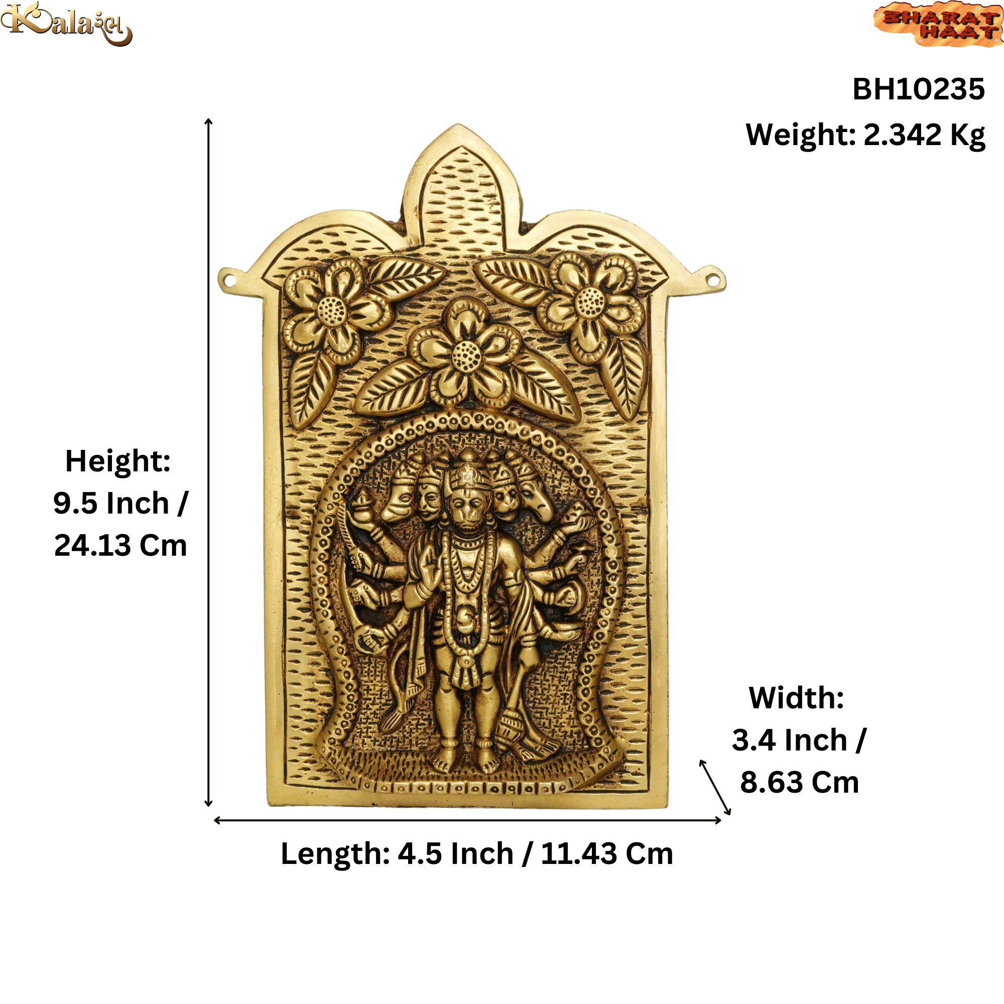 Brass Panchmukhi Hanuman wall hanging, 1 Pc, size 6.4 x 1 x 8.6 Inch, 1.42 Kg. Ideal for walls, home temples, or as a spiritual gift.