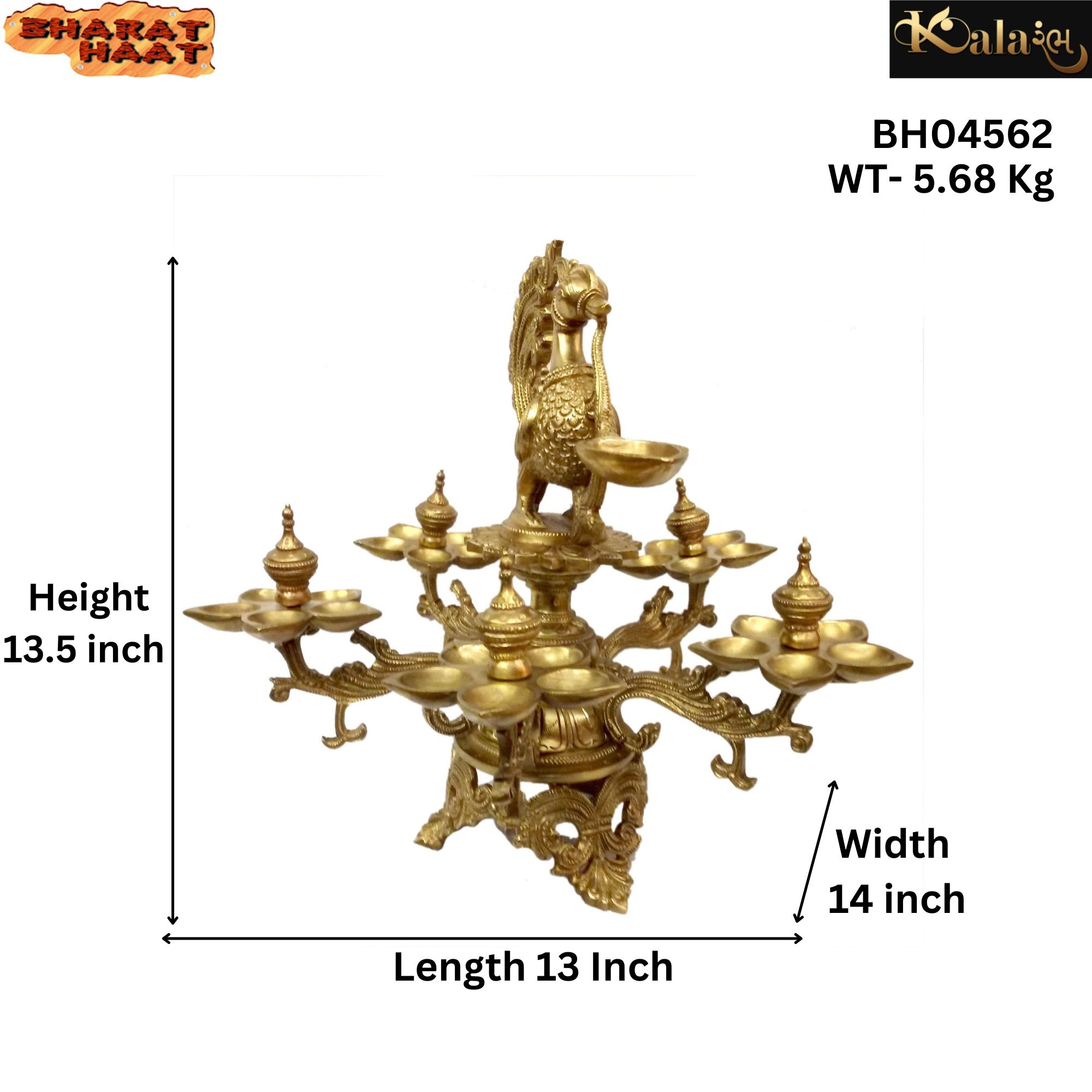 Measuring 13 x 14 x 13.5 Inch (33.02 x 35.56 x 34.29 cm) and weighing 5.68 Kg, this heavy brass lamp ensures durability and long-lasting shine. Perfect for lighting during puja rituals, Diwali, Navratri, or daily worship, it creates a divine aura when lit. The graceful peacock design adds charm, making it a centrepiece for living rooms, temples, or entrances.