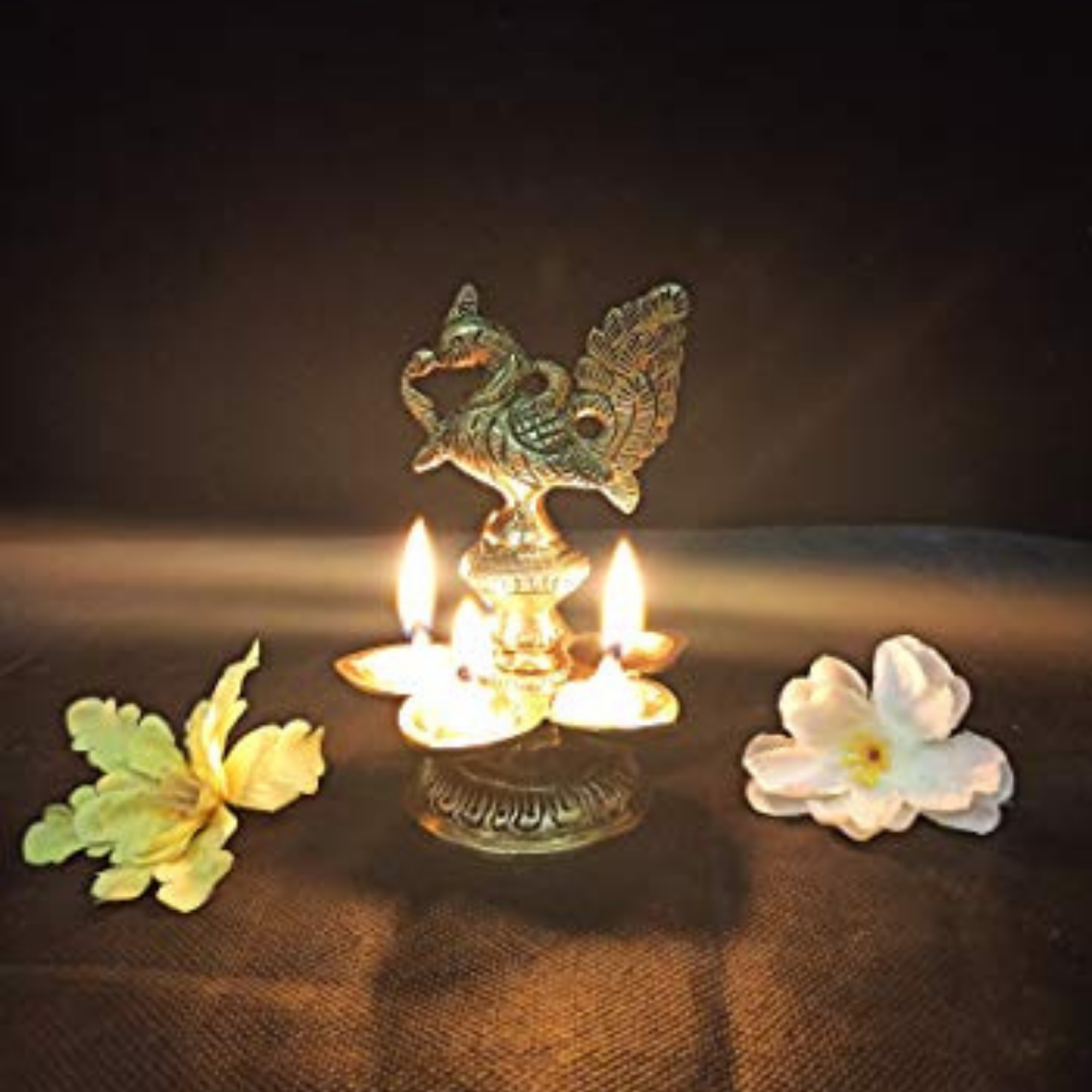 Design: Beautifully handcrafted brass diya featuring a majestic peacock on top — symbolizing beauty, purity, and divine energy.