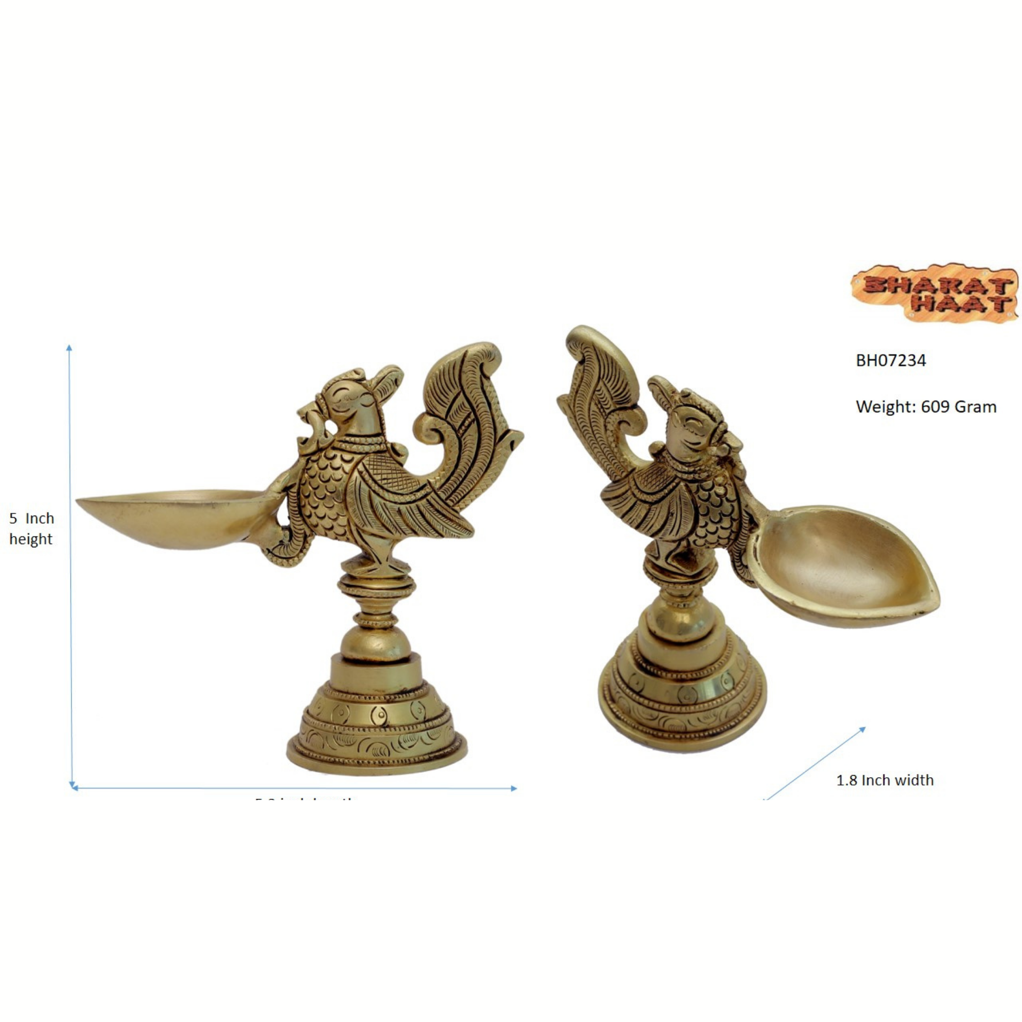 Exquisitely crafted Brass Peacock Diya featuring a detailed peacock design. This 5-inch, 609-gram diya is perfect for spiritual décor, meditation spaces, or gifting, combining tradition and artistic charm.