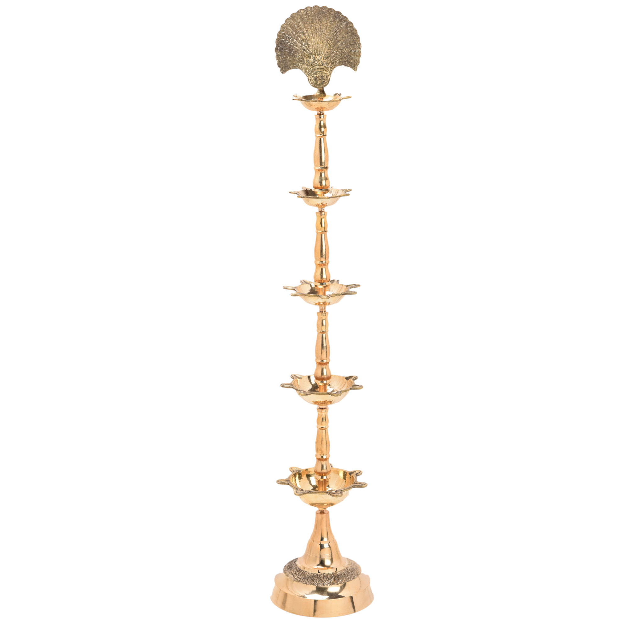 Design:Featuring five beautifully tiered levels for diyas and a royal peacock finial at the top, this divi embodies grandeur, devotion, and cultural artistry.