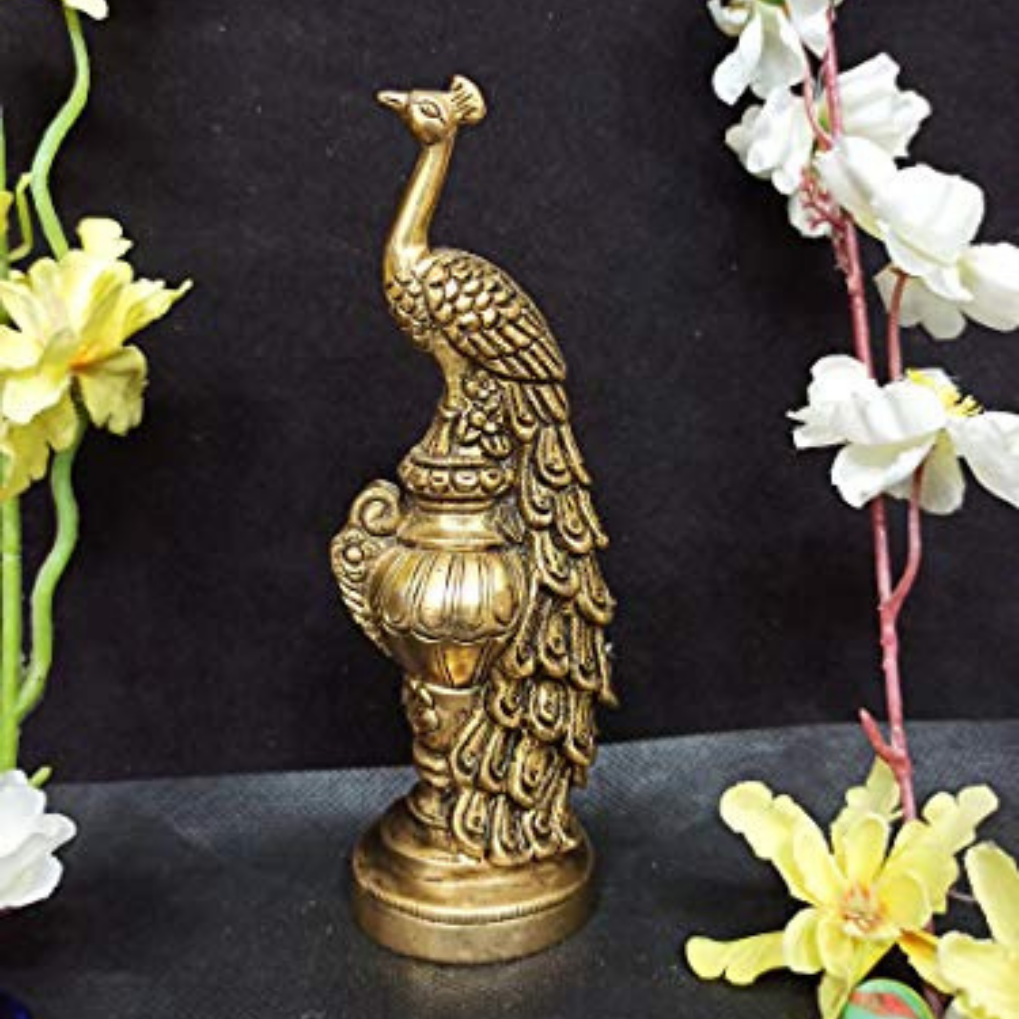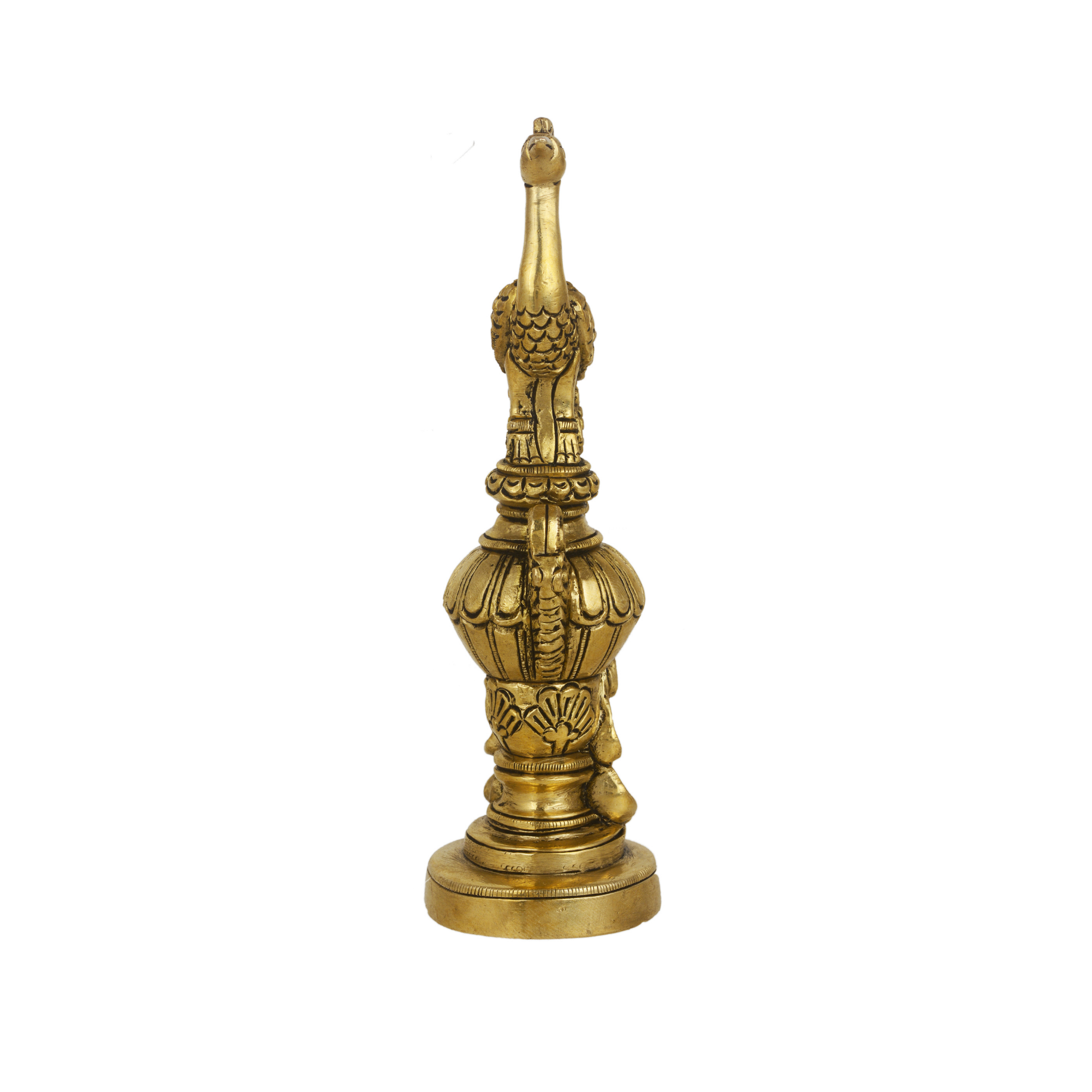 Design: Beautifully handcrafted brass showpiece featuring an elegant standing peacock symbolizing grace, royalty, and prosperity.
