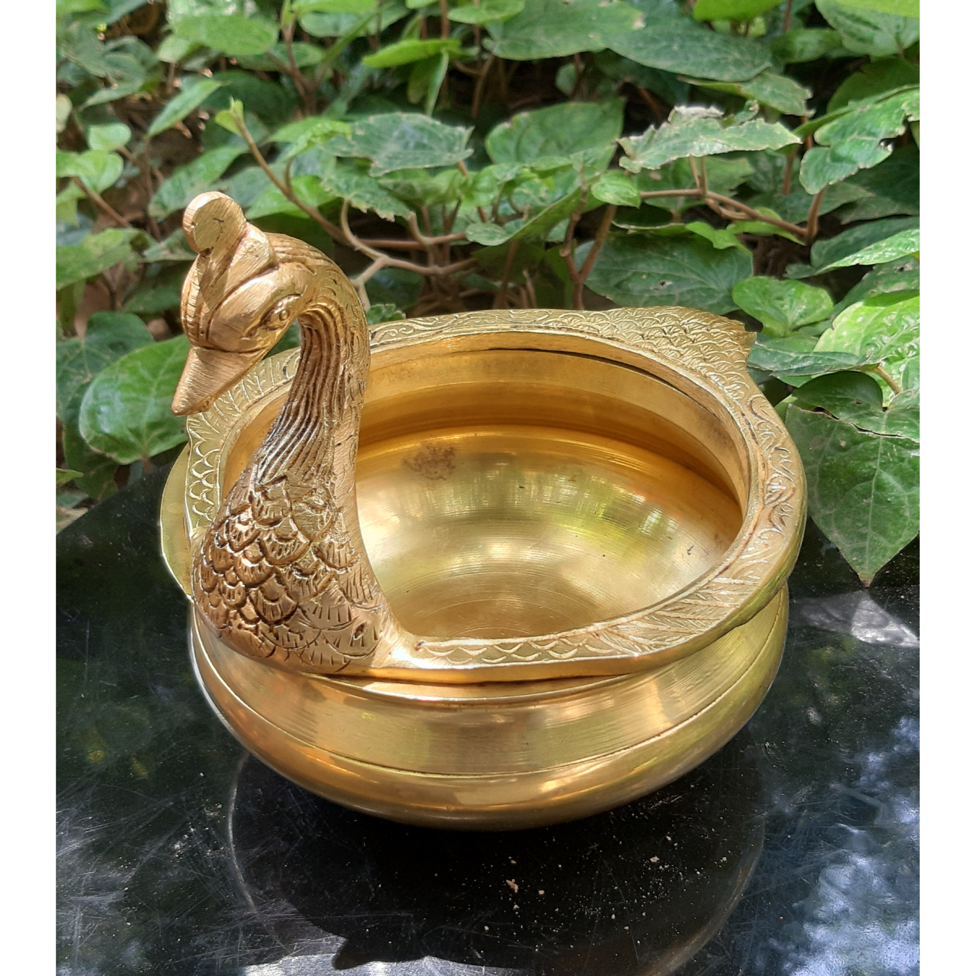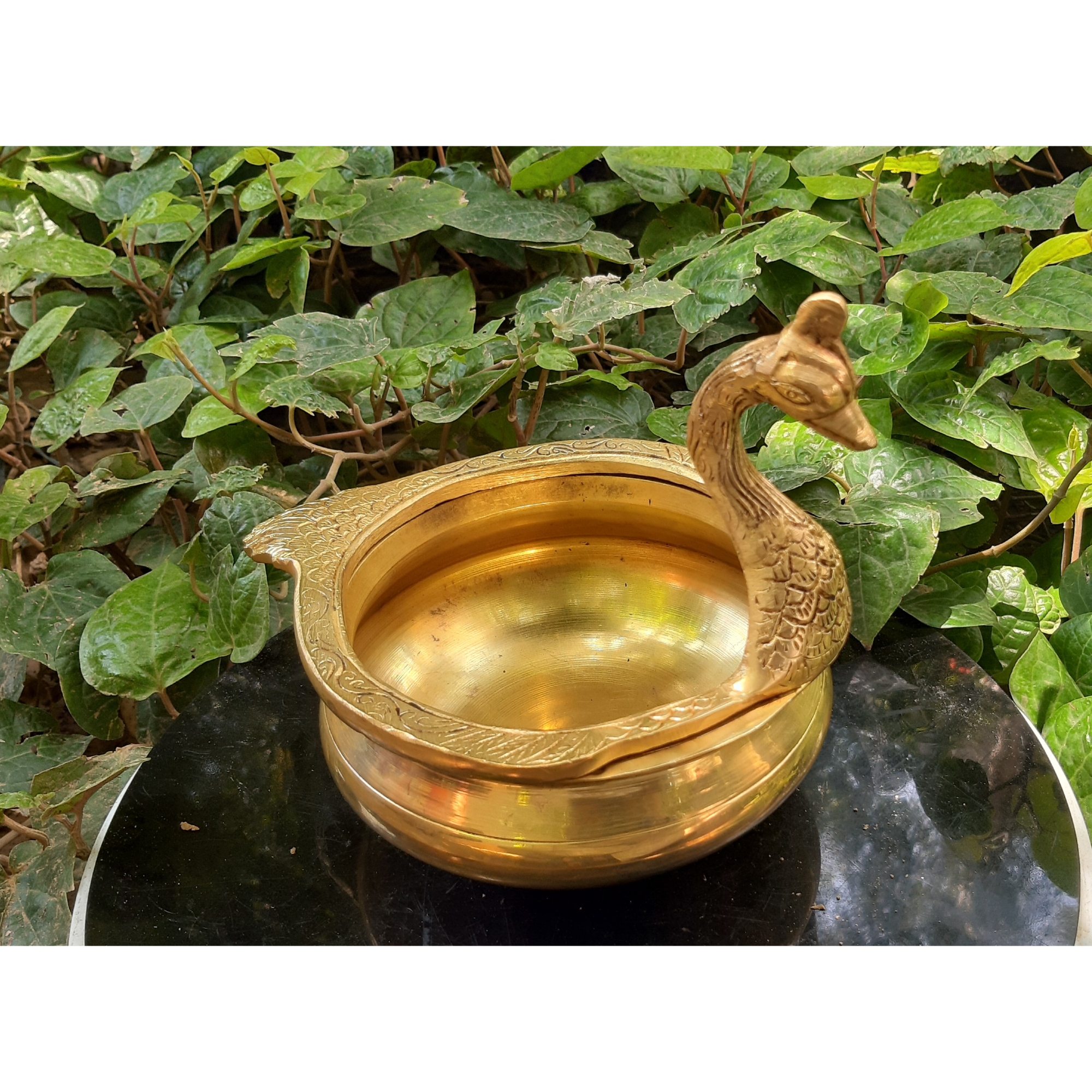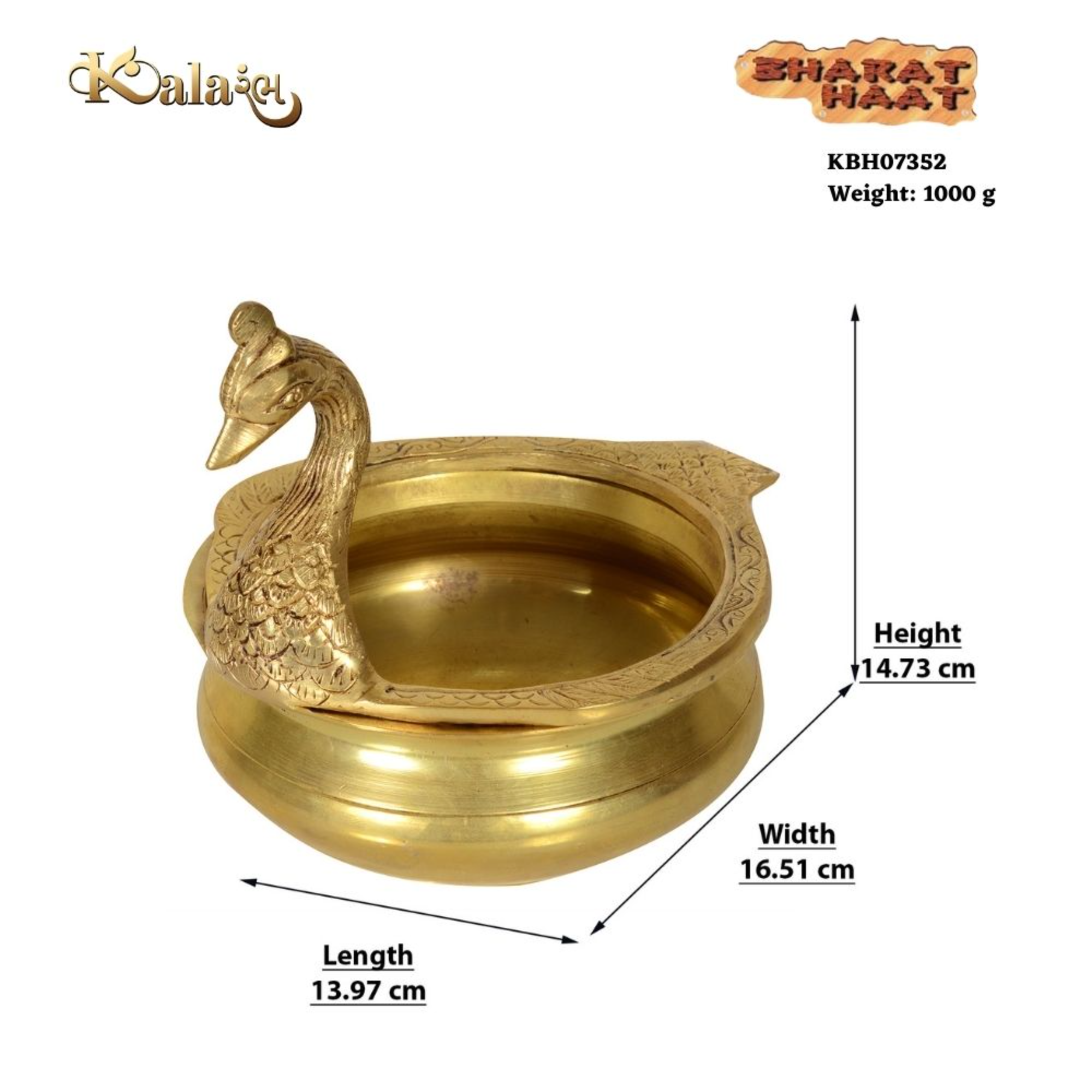 The Brass Peacock Urli blends artistic beauty with divine charm. Featuring detailed craftsmanship and a graceful peacock design, this urli bowl enhances the ambiance of any space — ideal for pooja rooms, entrances, or festive home décor.