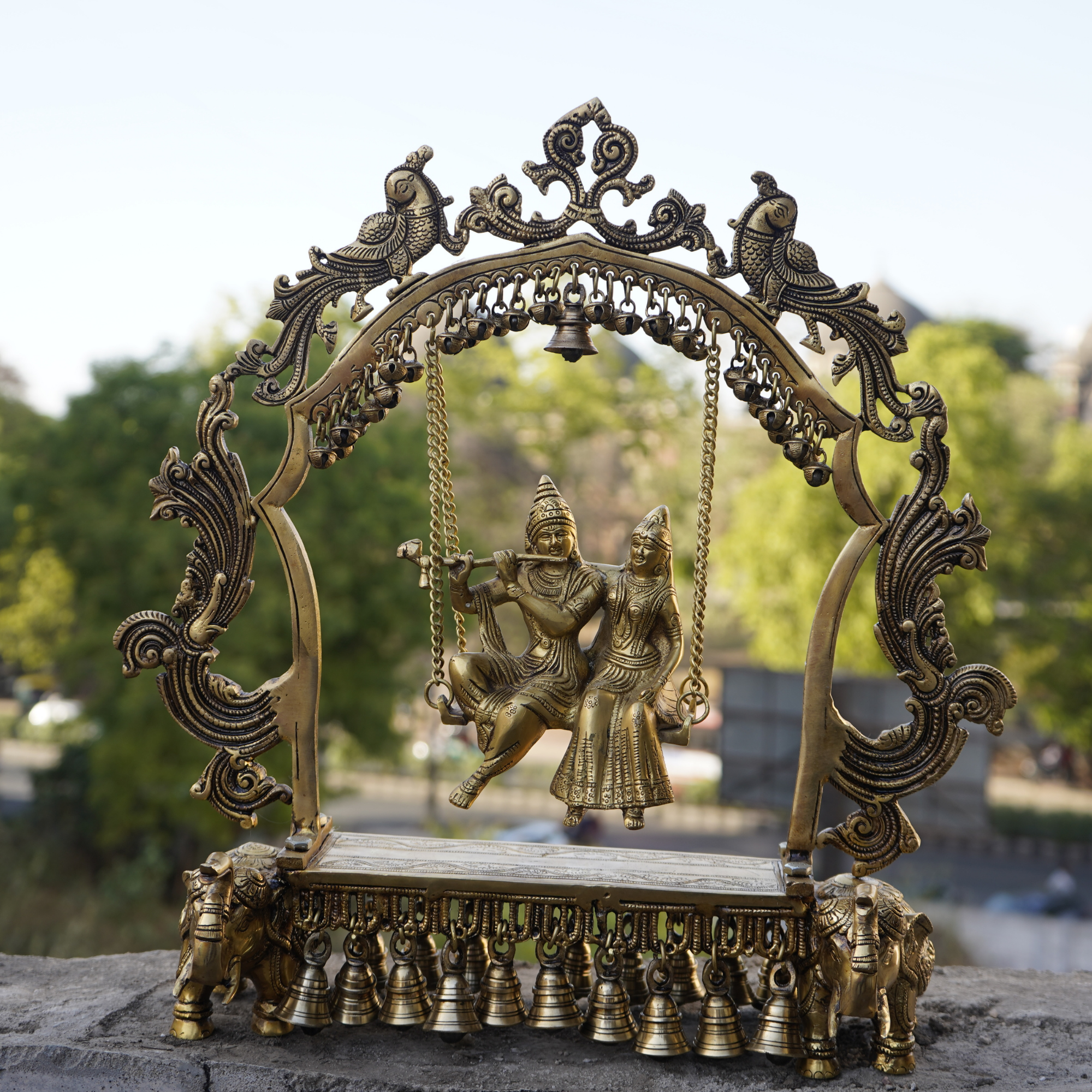 Design: Features Lord Krishna and Goddess Radha on a beautifully carved swing (Jula), symbolizing love, devotion, and divine playfulness.