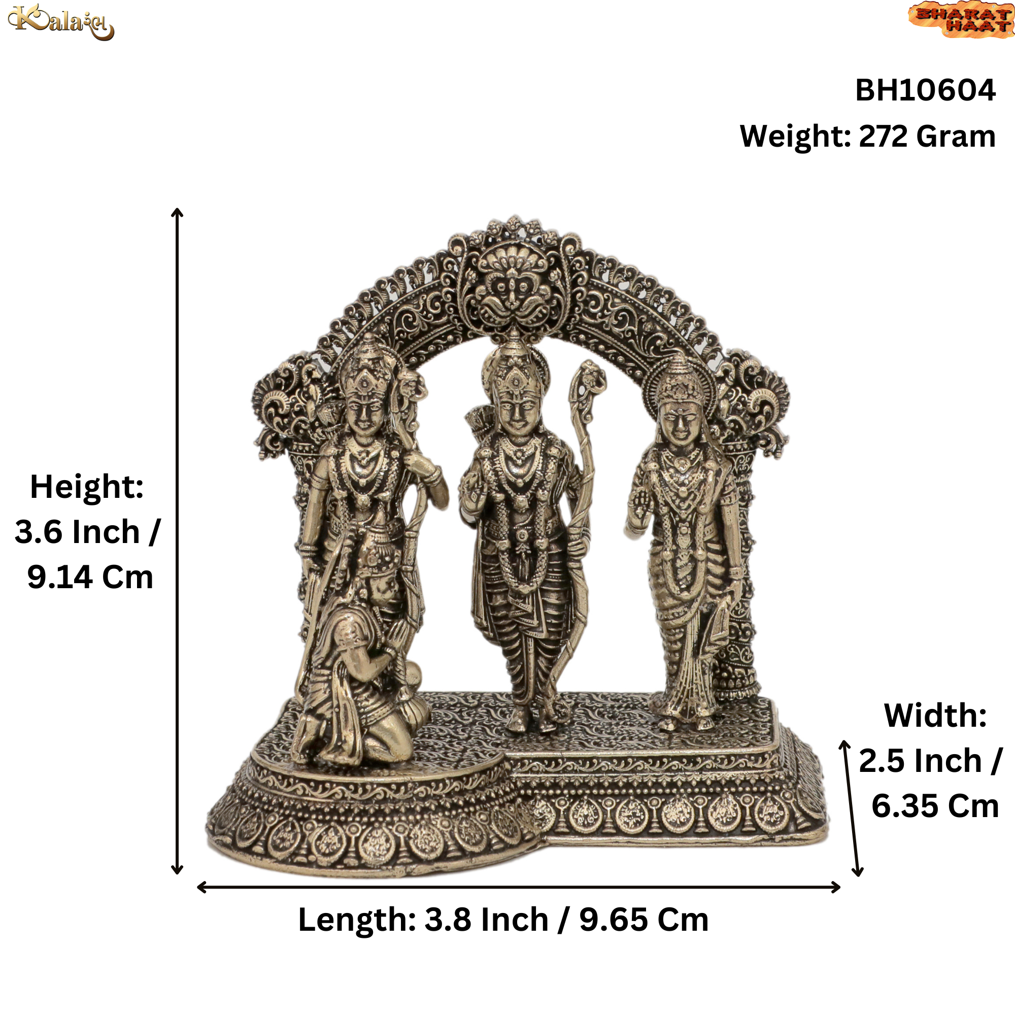 Handcrafted Brass Ram Darbar Idol – 3.8 x 2.5 x 3.6 inches, weighing 272 grams. Ideal for pooja, home décor, or gifting to devotees seeking divine blessings.