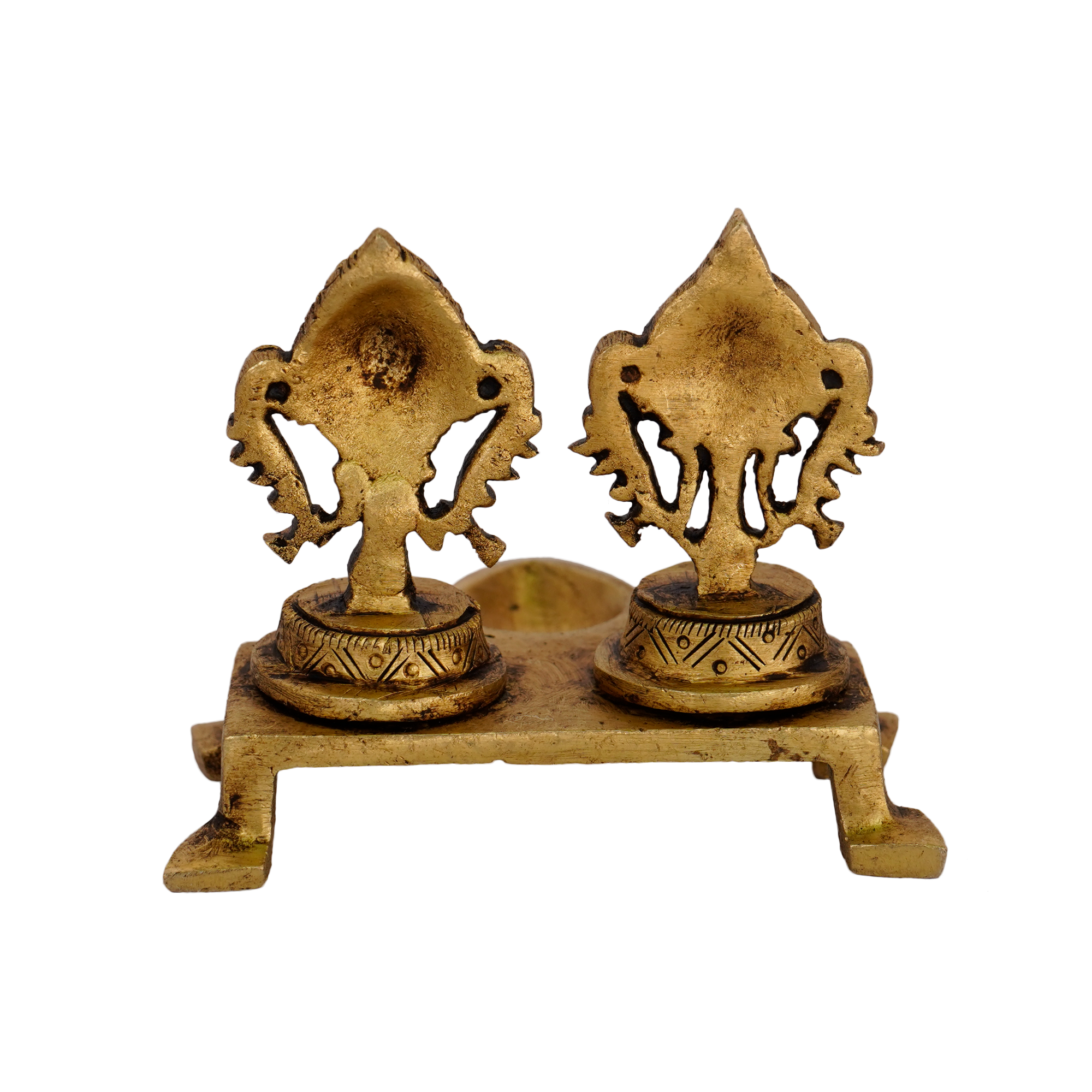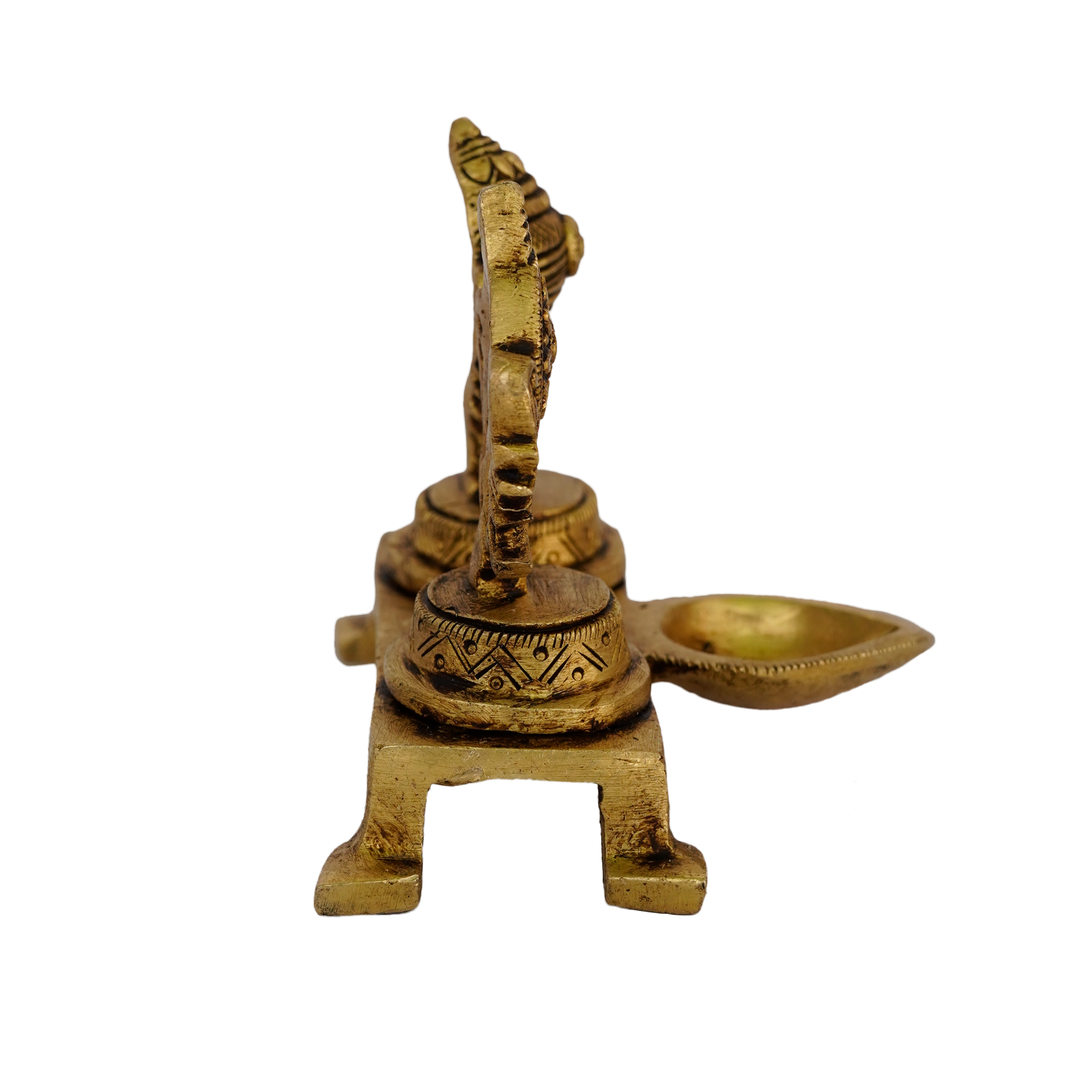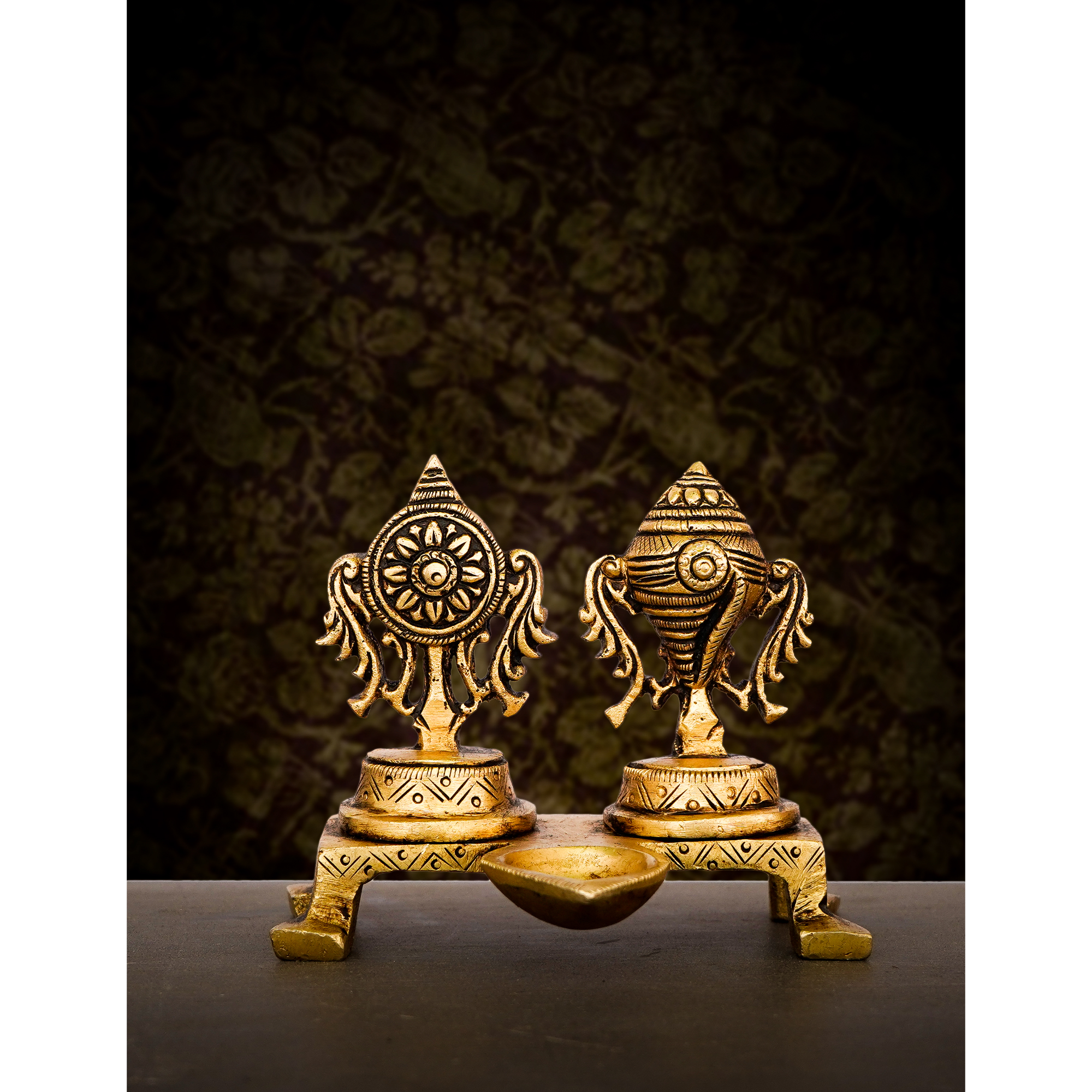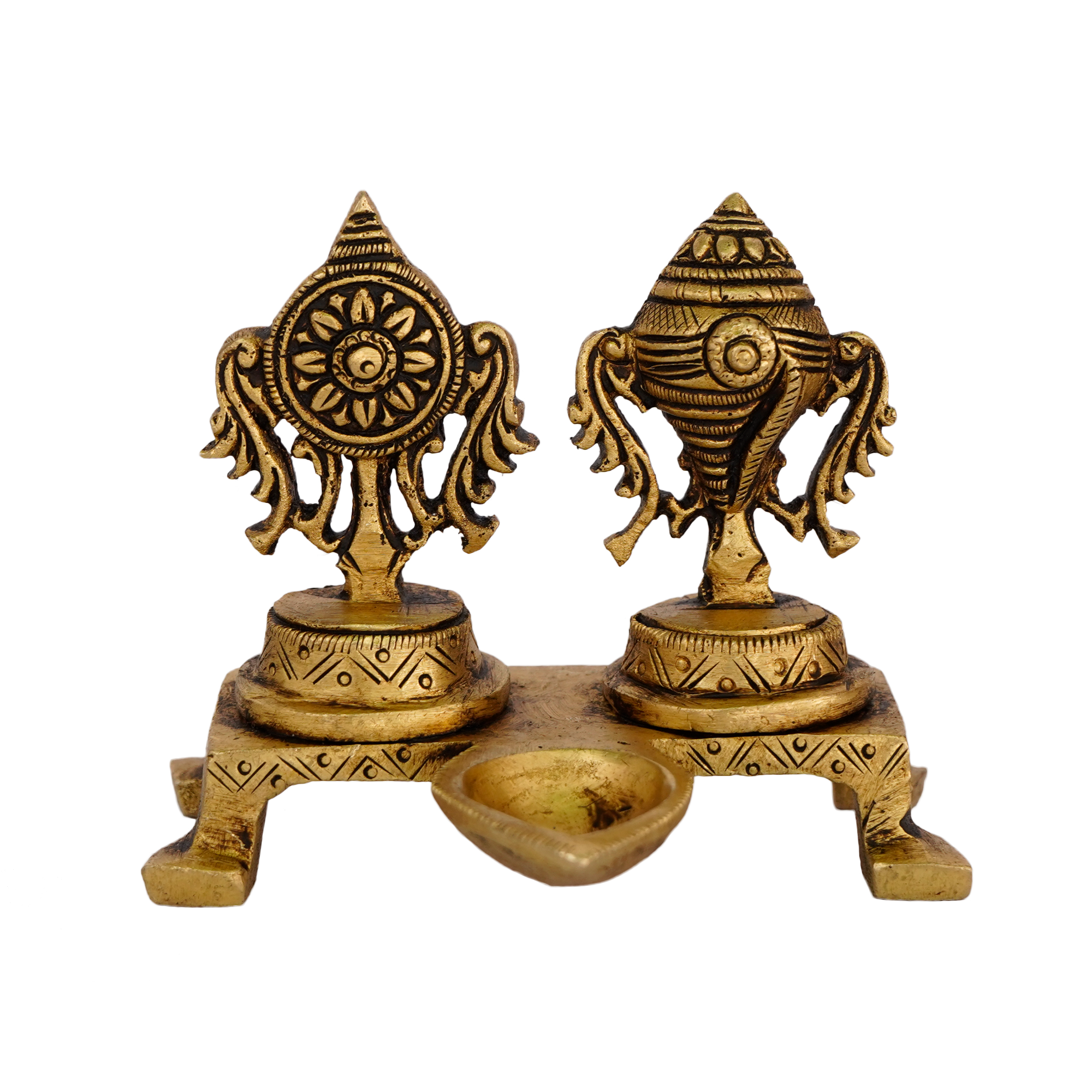 Design: Handcrafted brass diya with Sangu Chakra design featuring intricate detailing