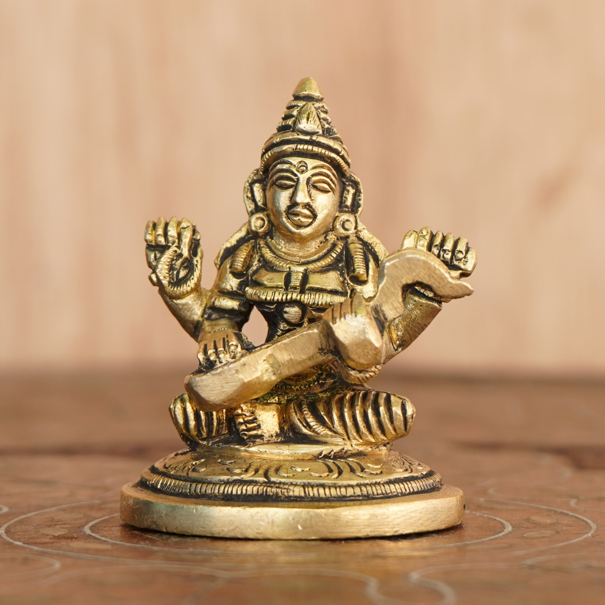 This exquisite mini Brass Sarasvati Goddess Idol by KBHARATHAAT measures 1.8 x 1.4 x 2.3 inches (4.57 x 3.55 x 5.84 cm) and weighs 120 grams. Ideal as a collectible handicraft or for home temples, it symbolizes wisdom, learning, and creativity, making it perfect for gifting or personal devotion.