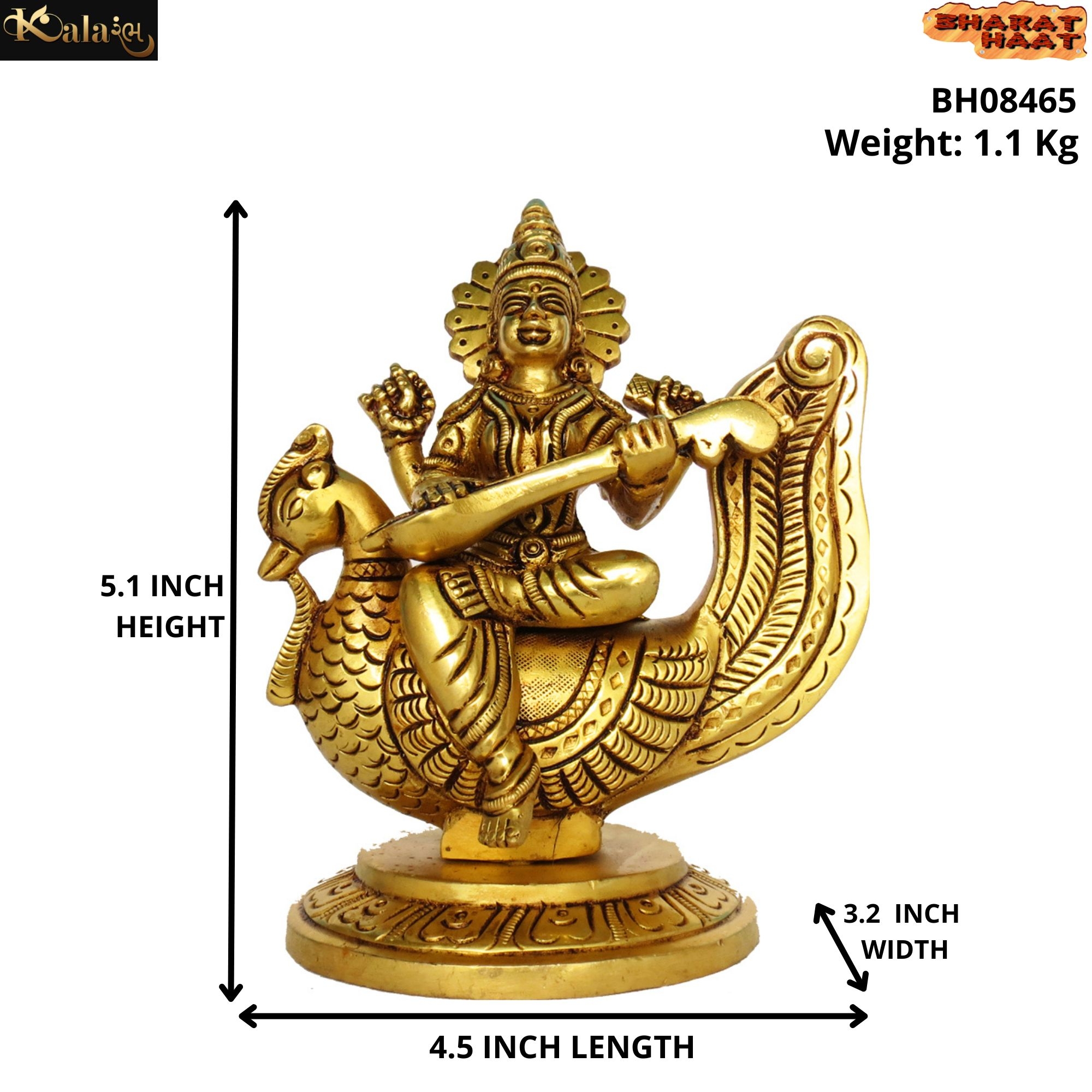 This elegant Brass Saraswati statue depicts the Goddess of Knowledge and Wisdom in a finely detailed design. Made from high-quality solid brass, it stands 5.1 inches tall and weighs 1.1 kg, making it perfect for home temples, study rooms, or as a spiritual décor piece. Ideal for worship and gifting.
