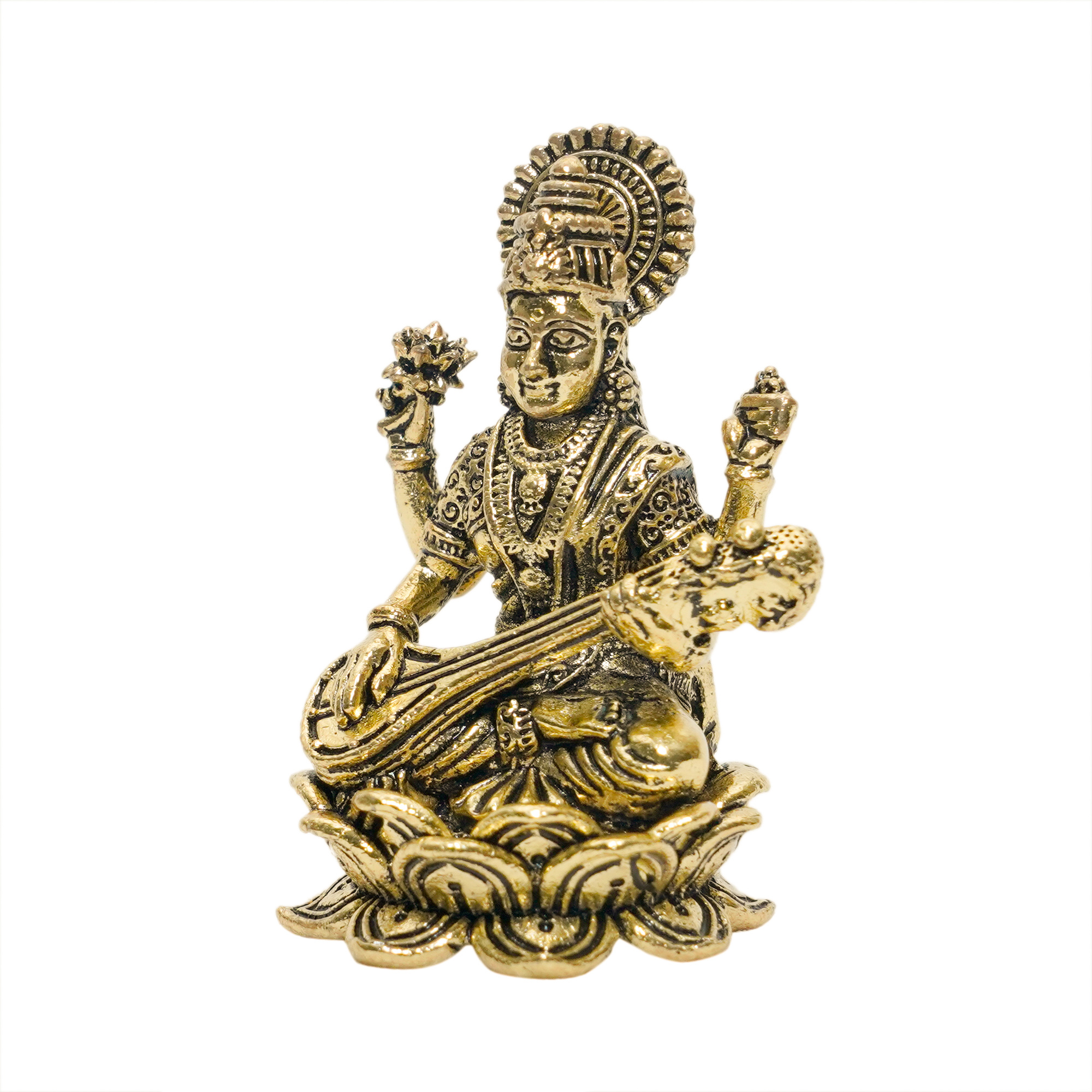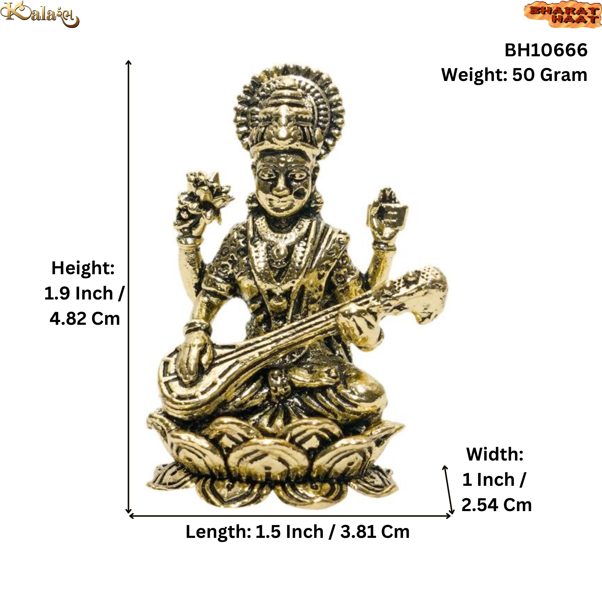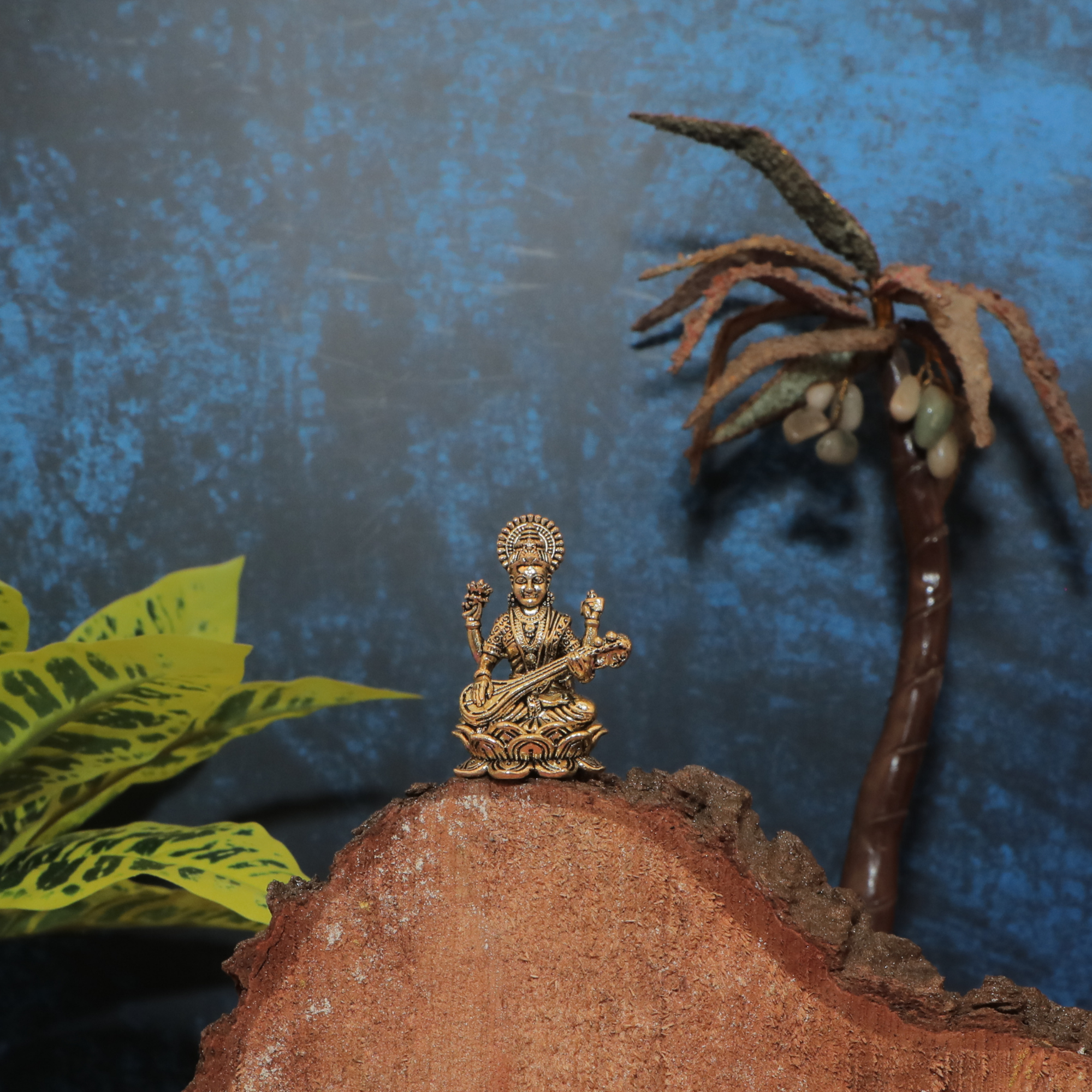 Miniature Brass Saraswati Maa idol, 1.5 x 1 x 1.9 inches, 50g – a handcrafted depiction of Goddess Saraswati, symbolizing knowledge, creativity, and spiritual enlightenment.