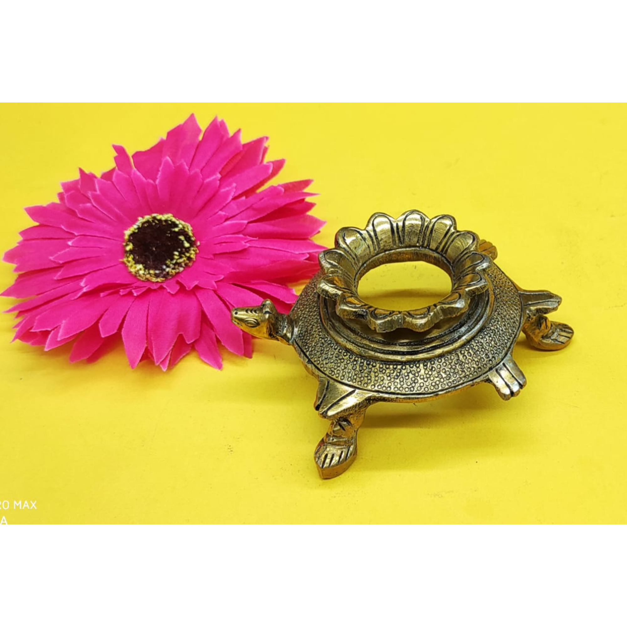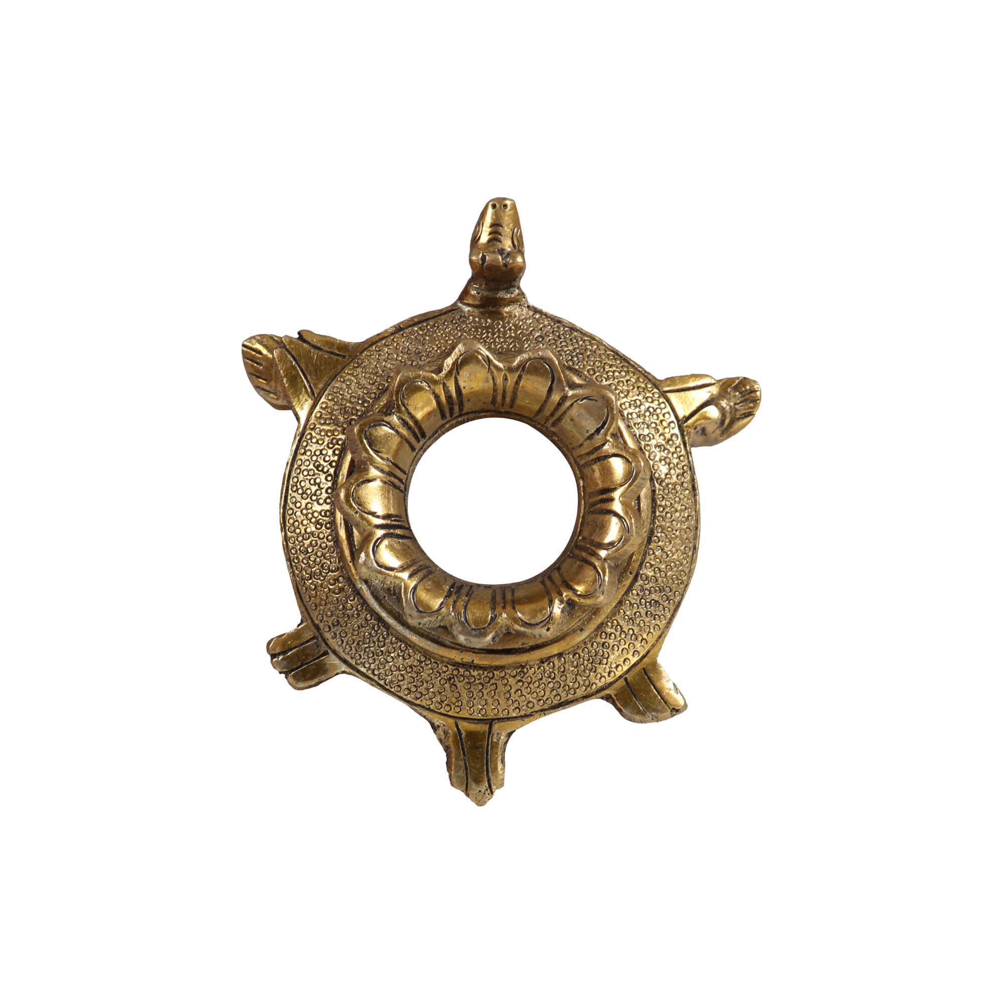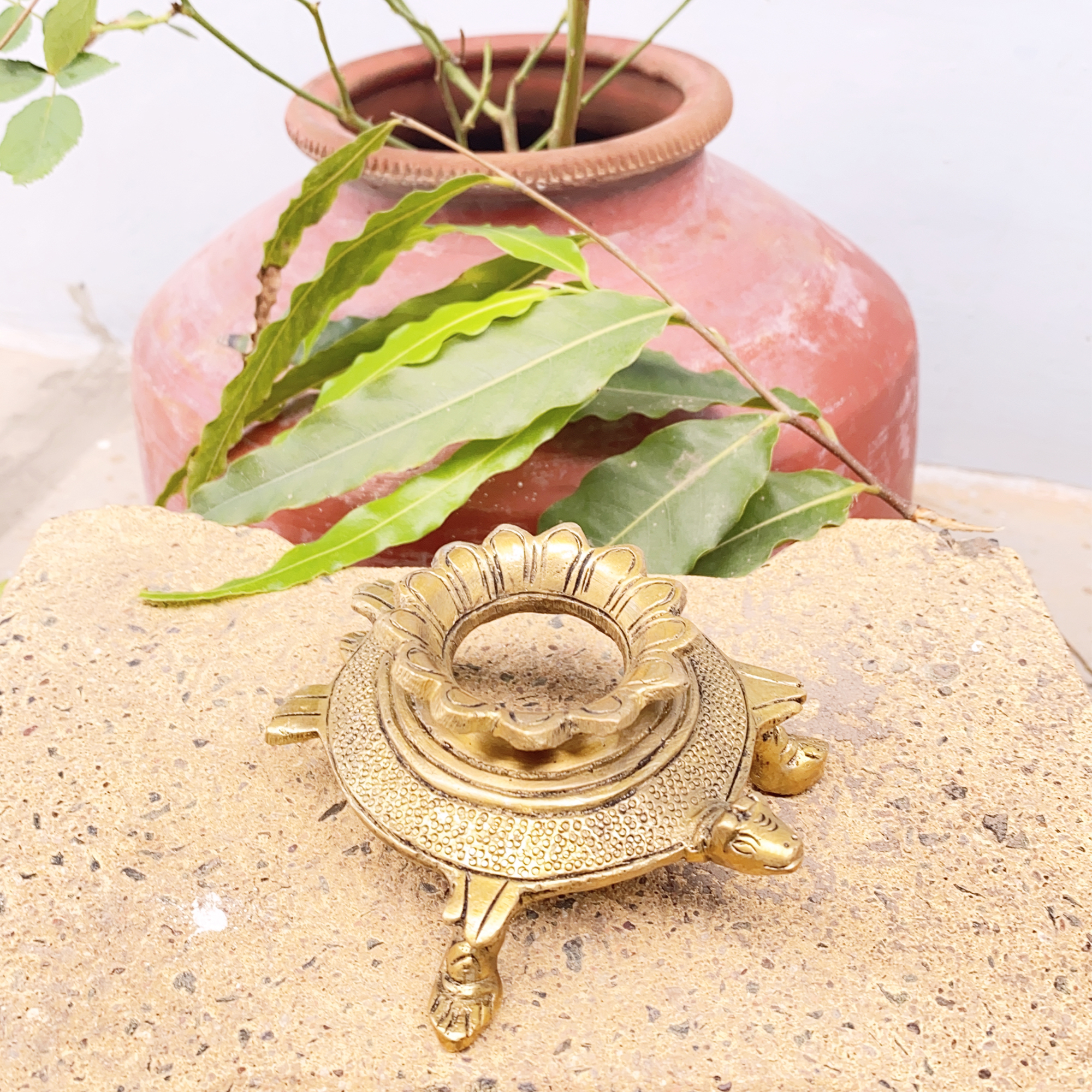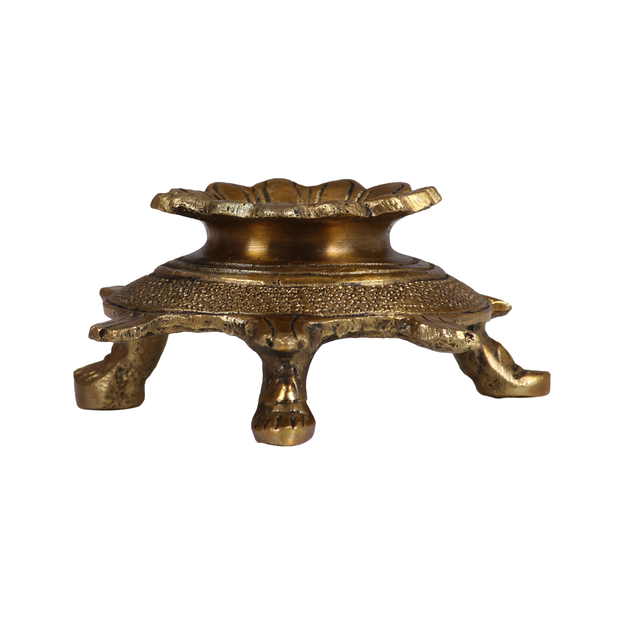 Design: Handcrafted Pure Brass Shankh Stand featuring a beautifully carved tortoise base, symbolizing stability, prosperity, and longevity