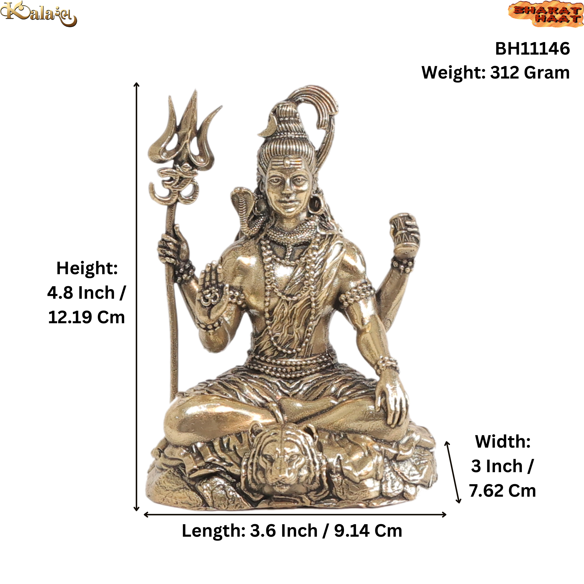 Enhance the spiritual ambiance of your home with this handcrafted Brass Lord Shiv Idol, measuring 3.6 x 3 x 4.8 inches (9.14 x 7.62 x 12.19 cm) and weighing 312 grams. Made from premium quality brass, this durable statue features intricate craftsmanship that highlights Lord Shiva’s divine form.