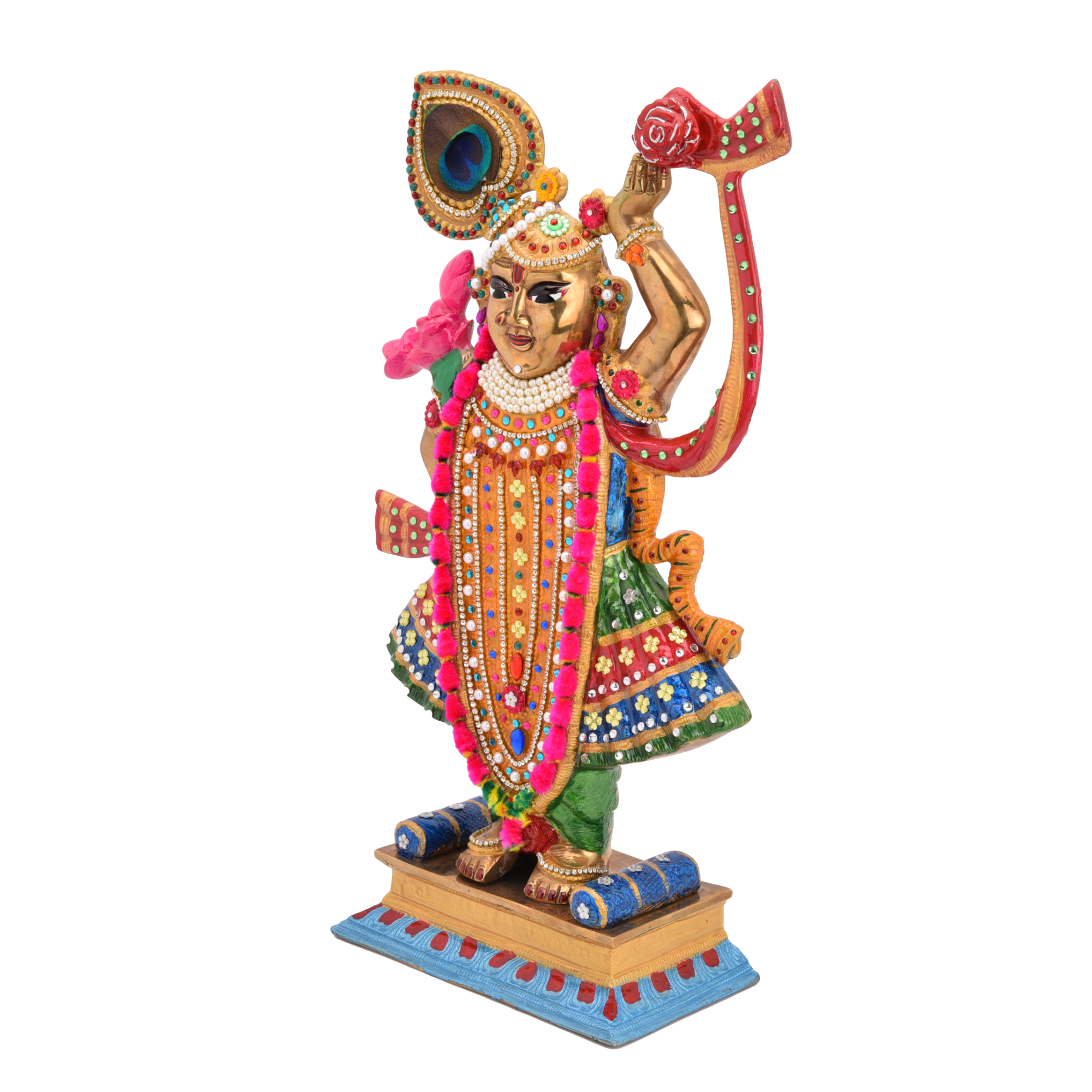 Design:The Brass Shreenathji Idol is a magnificent representation of Lord Krishna in his divine Shreenathji form. The statue features vibrant color detailing and fine ornamentation that reflect devotion, artistry, and spiritual richness.