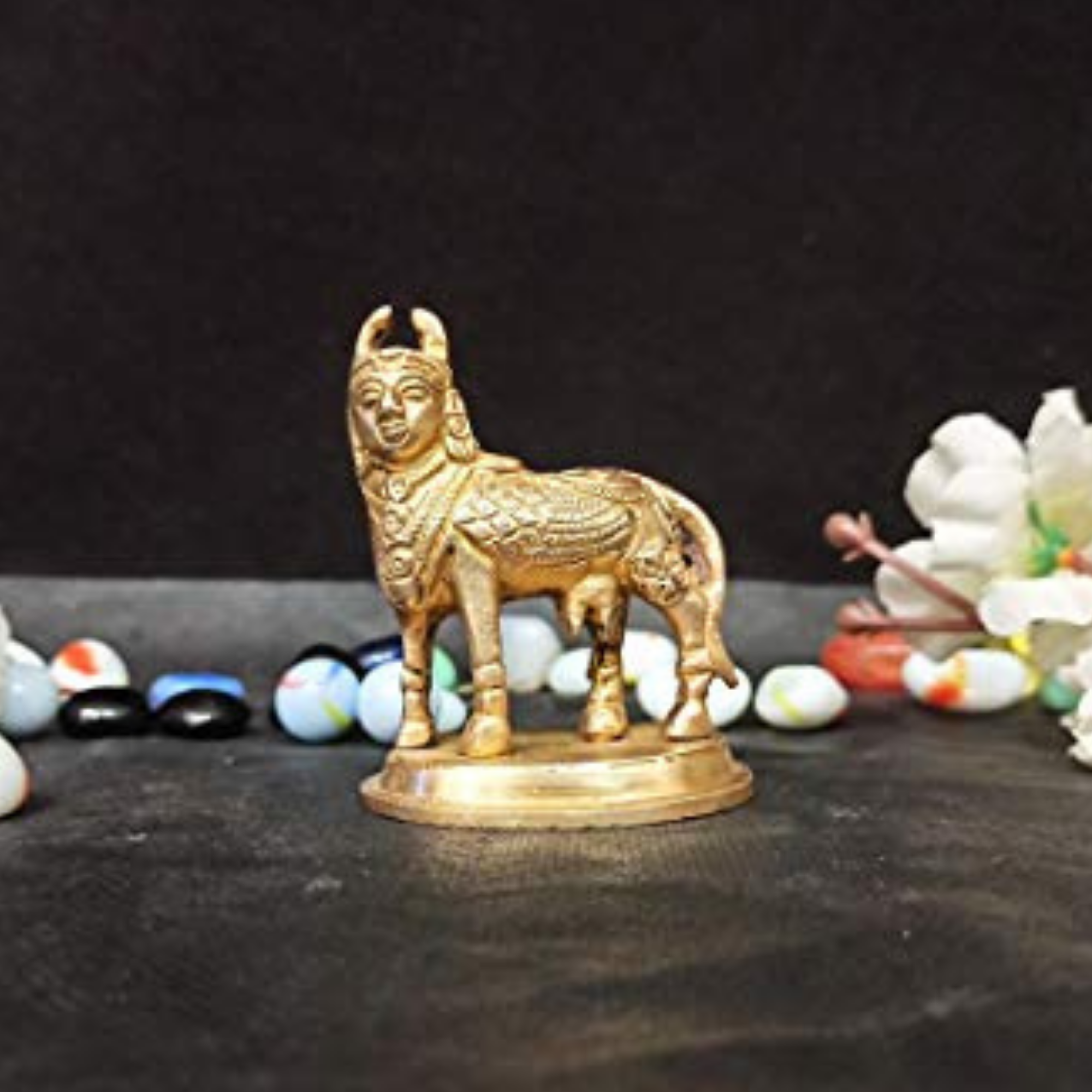 Design: Exquisitely handcrafted brass idol of Kamdhenu (holy cow) with her calf, symbolizing prosperity, purity, and motherhood.