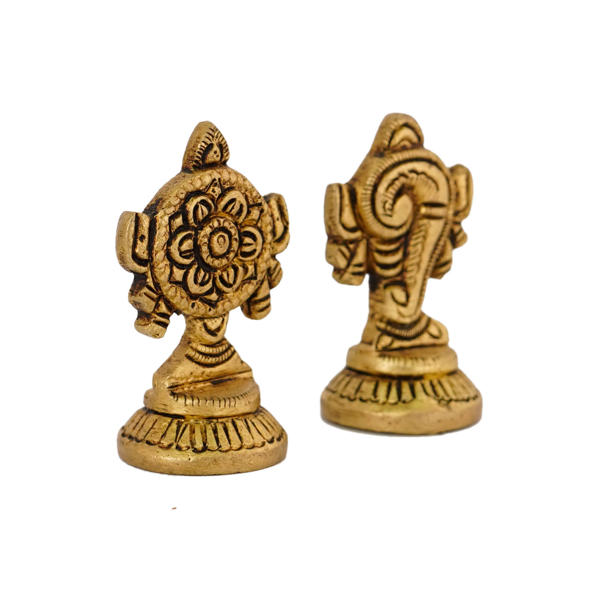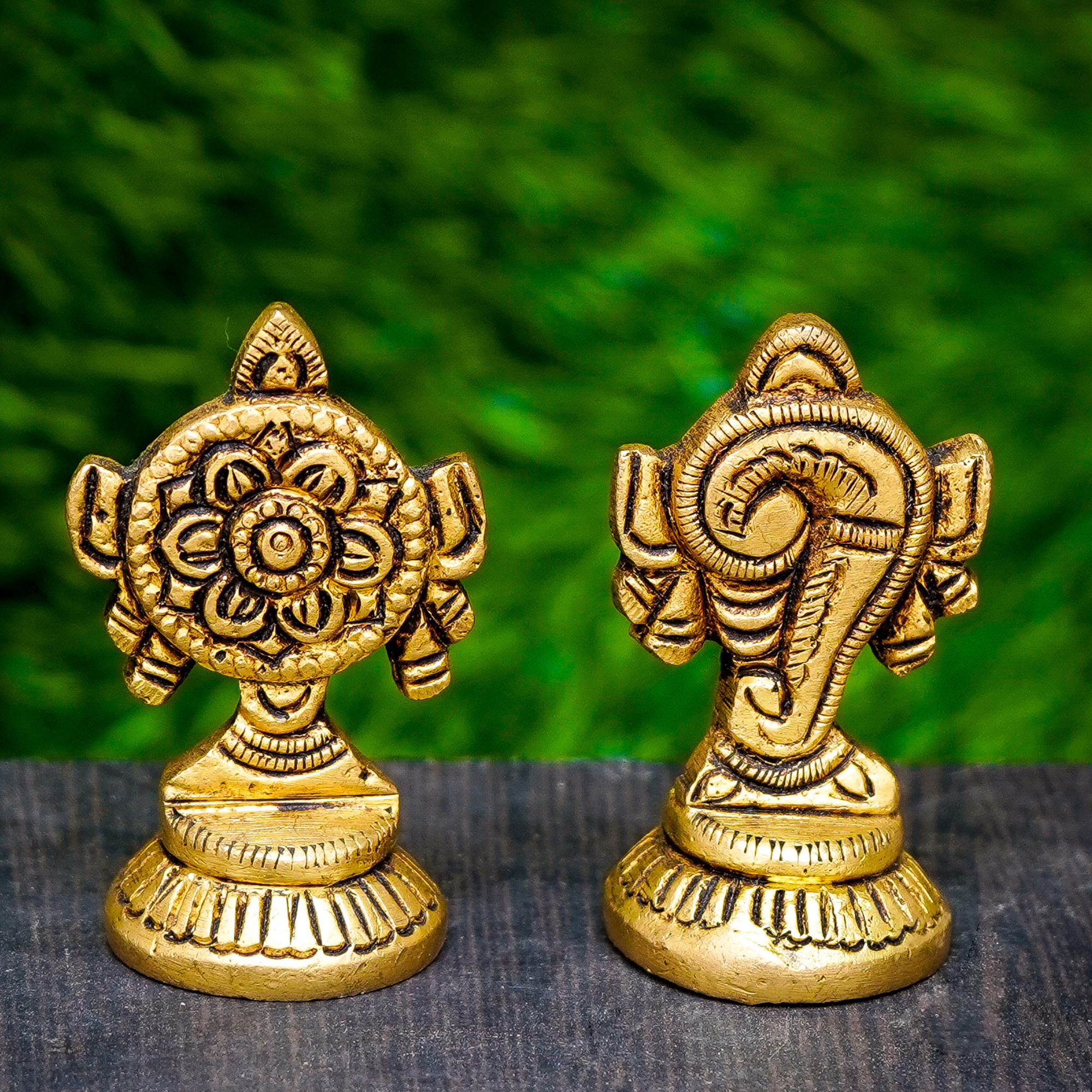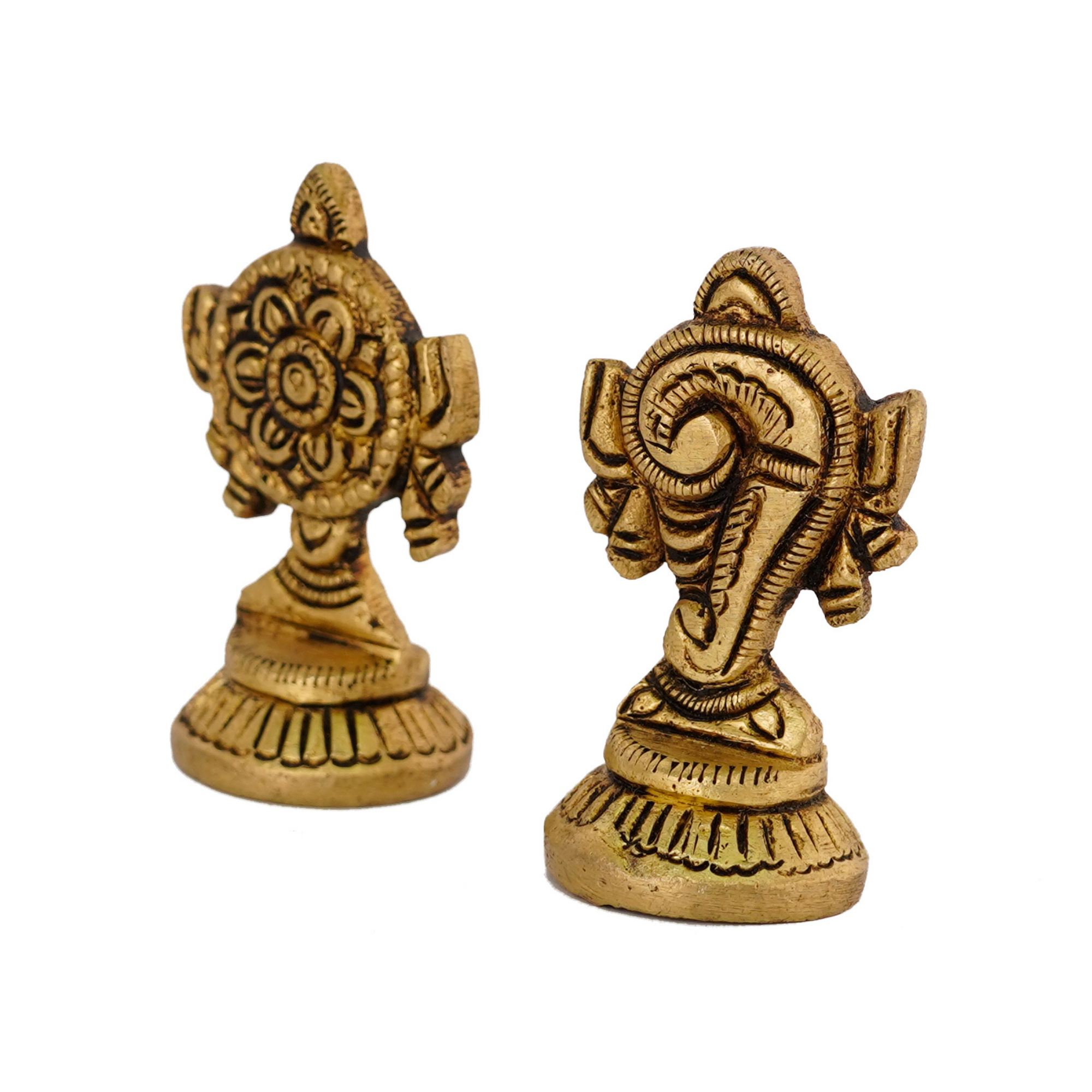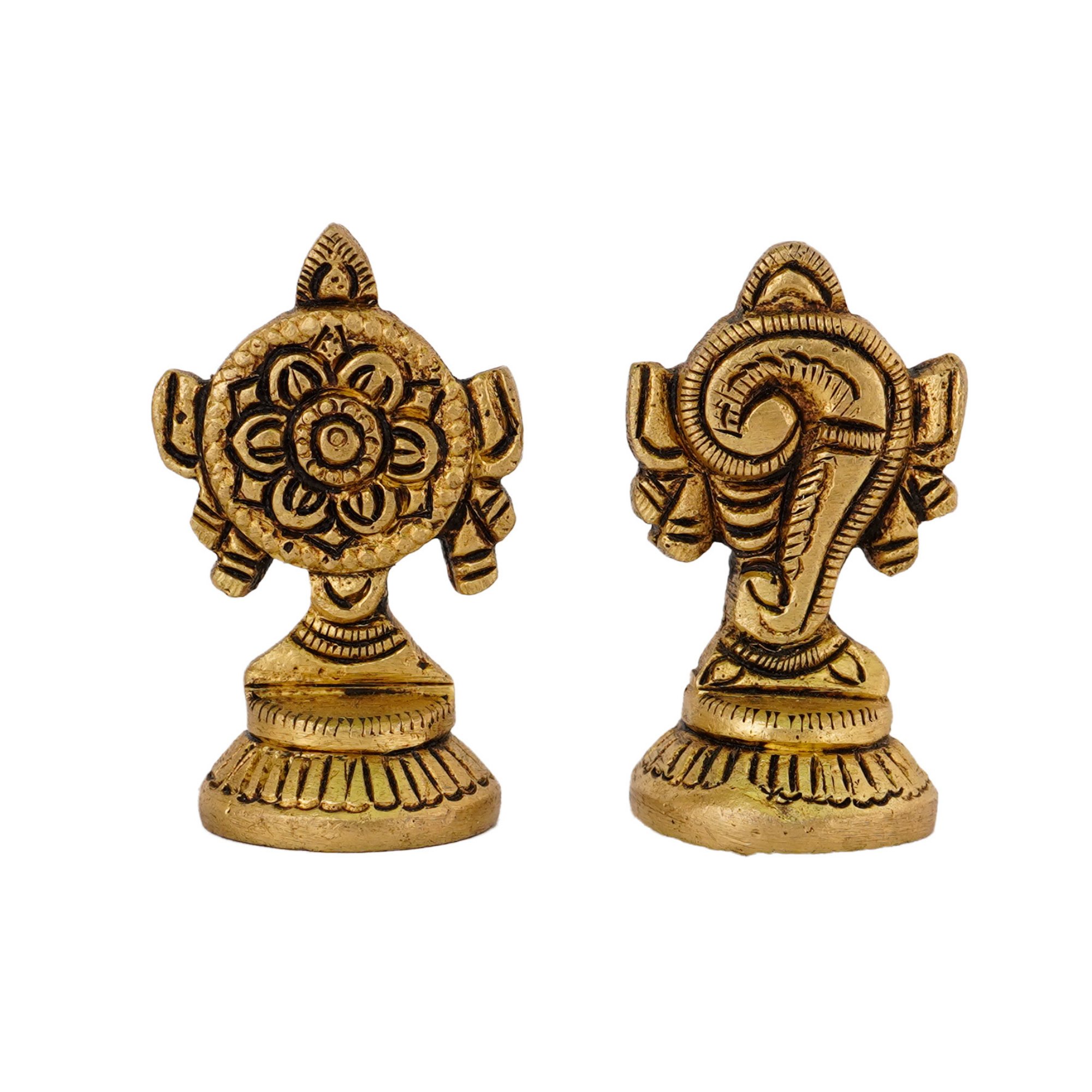 Handcrafted Brass Small Sangu Chakra Set – 2.4 x 1 x 2.1 inches, 140g. A miniature spiritual set featuring sacred Sangu (conch) and Chakra, ideal for home pooja rooms or as a devotional gift.