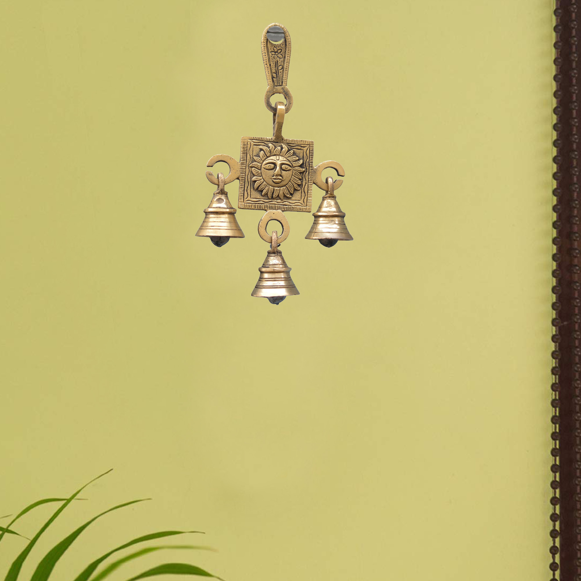 Elegant Brass Sun Belt Wall Hanging Bell featuring a radiant sun motif. Lightweight, durable, and perfect for doors, walls, pooja areas, and gifting.
