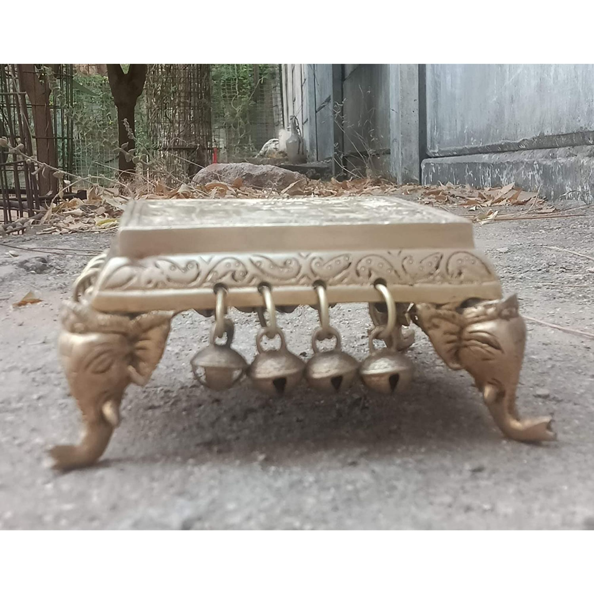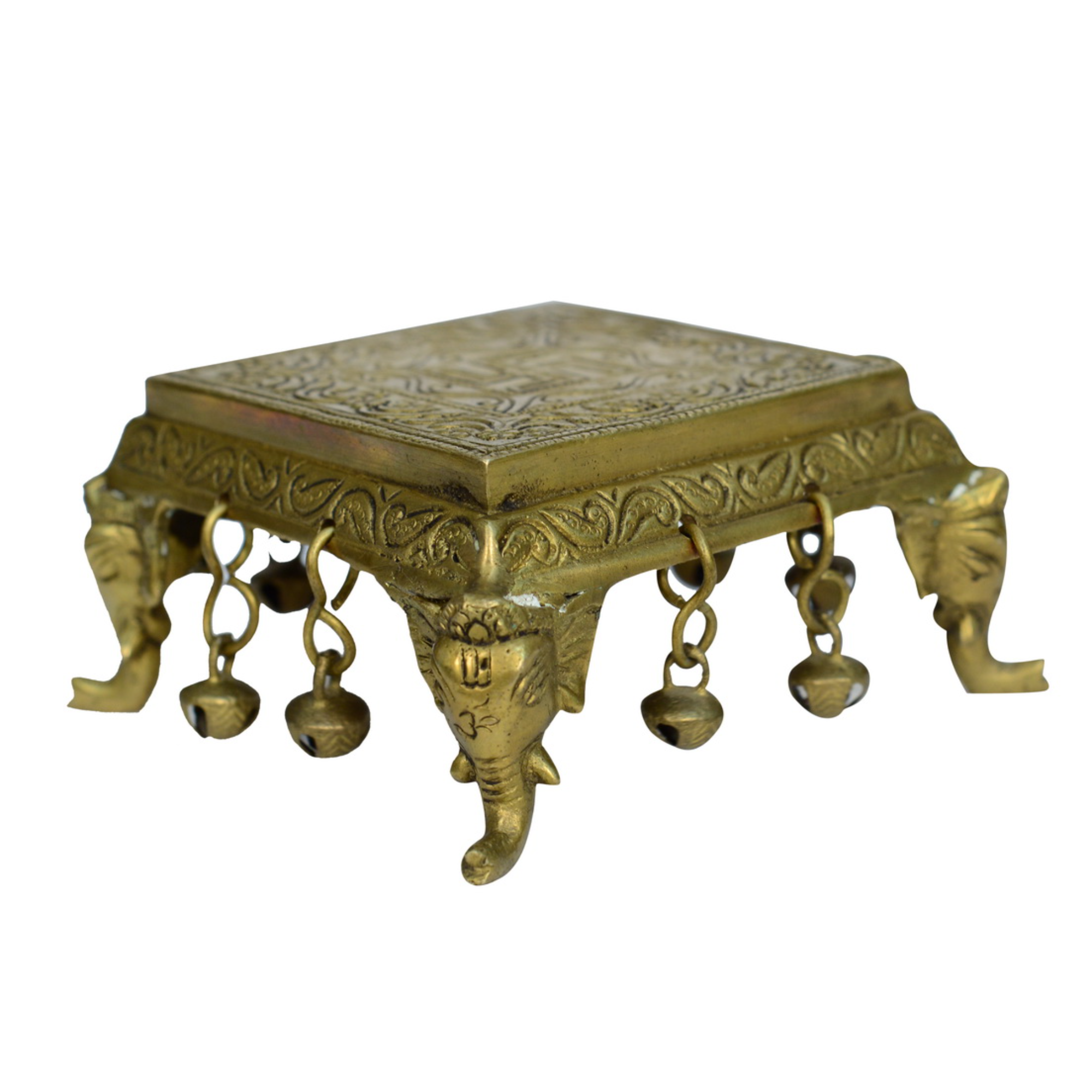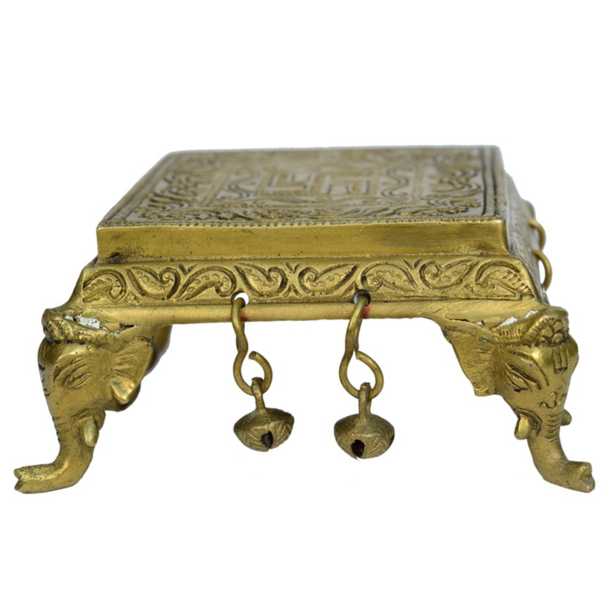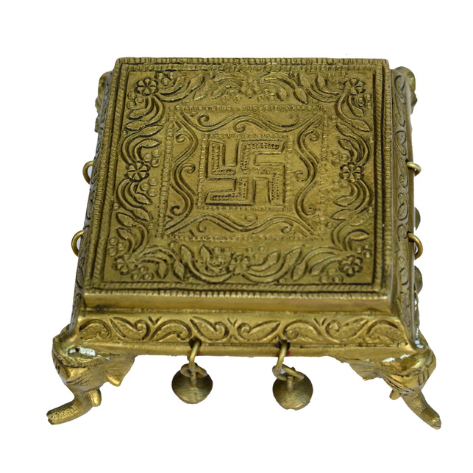 Elegant Brass Swastik Square Bajath featuring auspicious design and hanging bells, adding sacred sound and charm to your pooja setup.