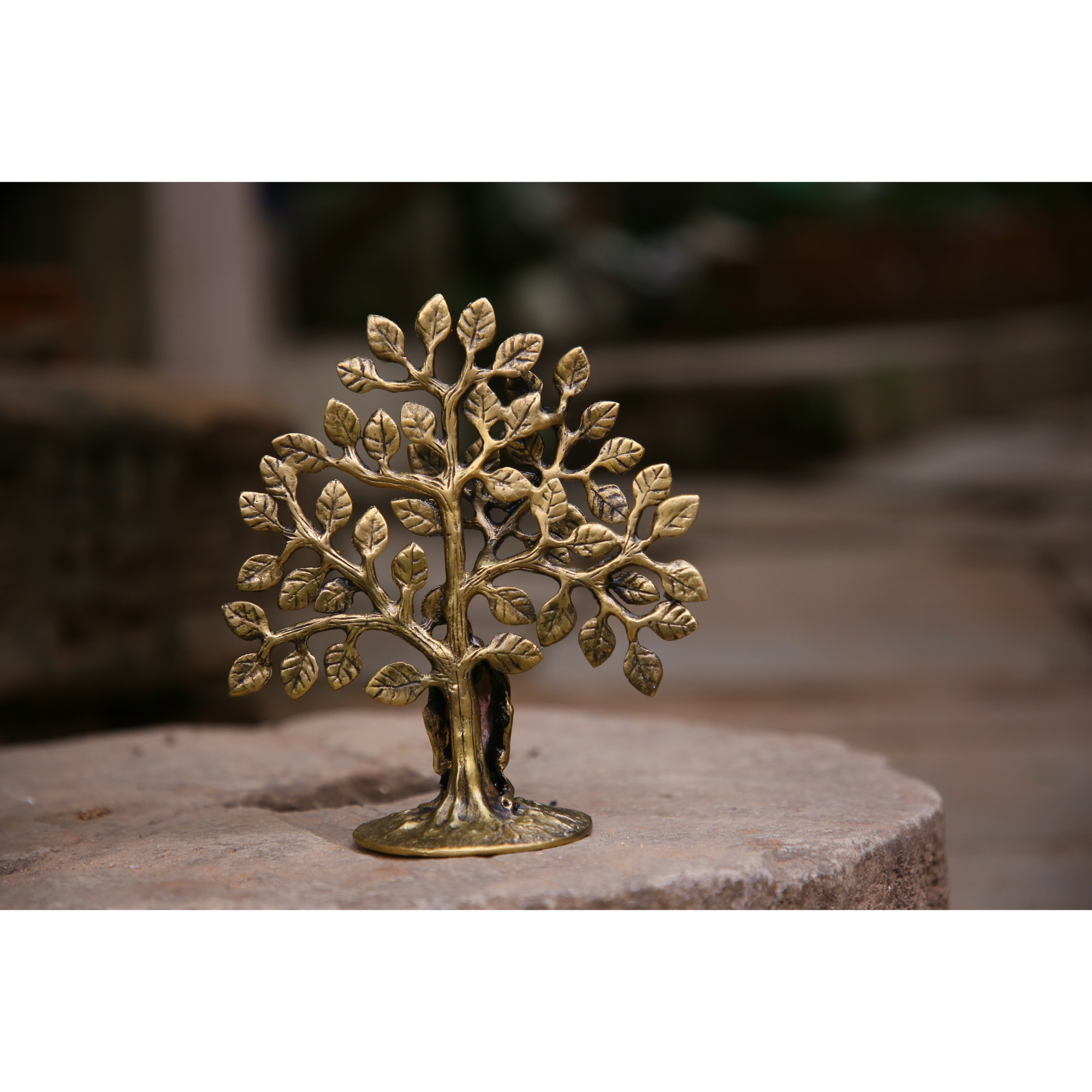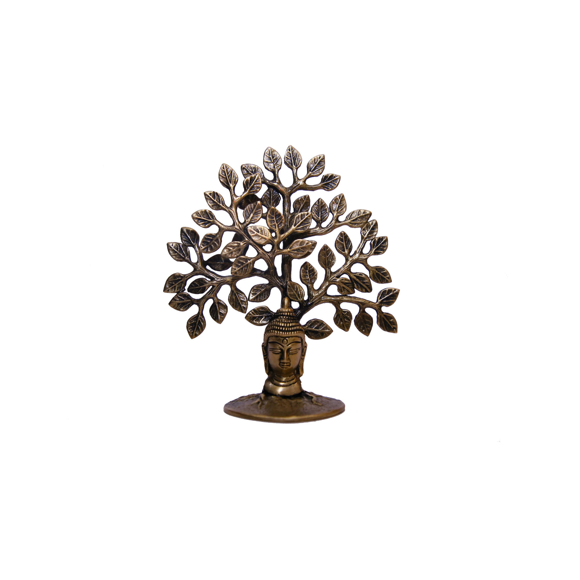 Design: Handcrafted brass tree sculpture with Buddha face, sitting on a small round base, symbolizing peace, mindfulness, and spiritual growth.