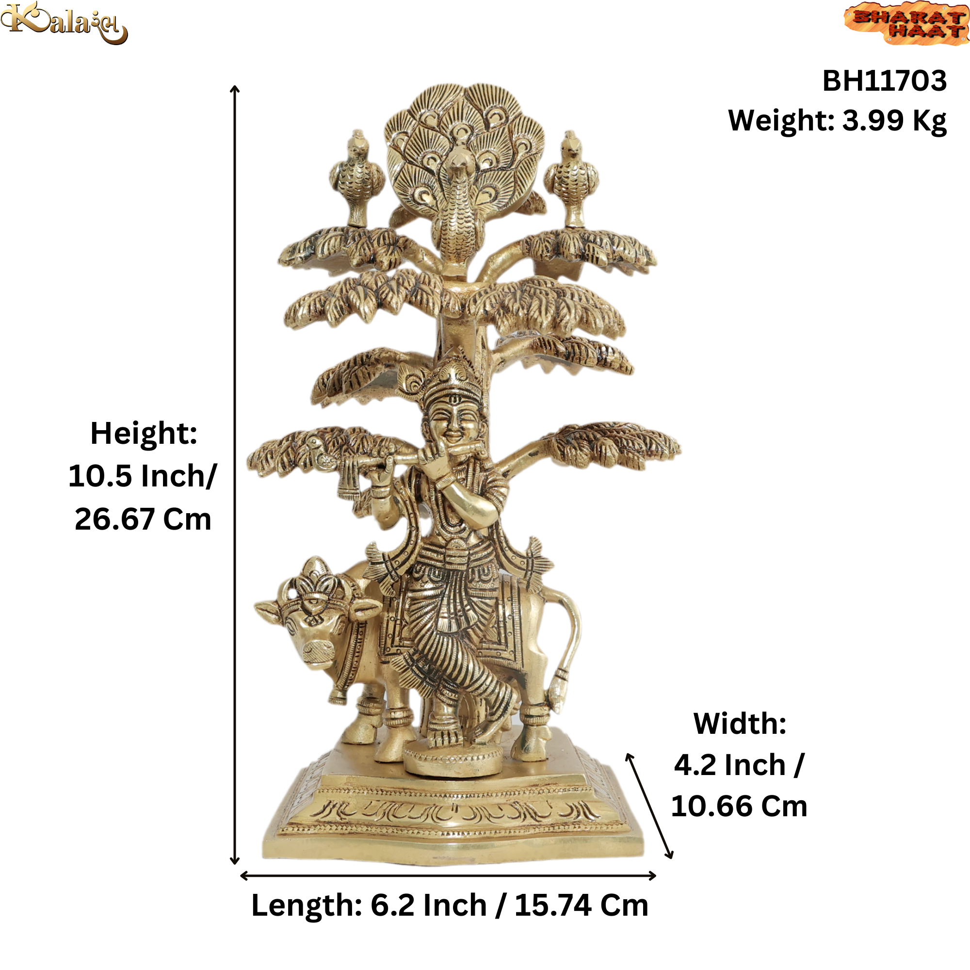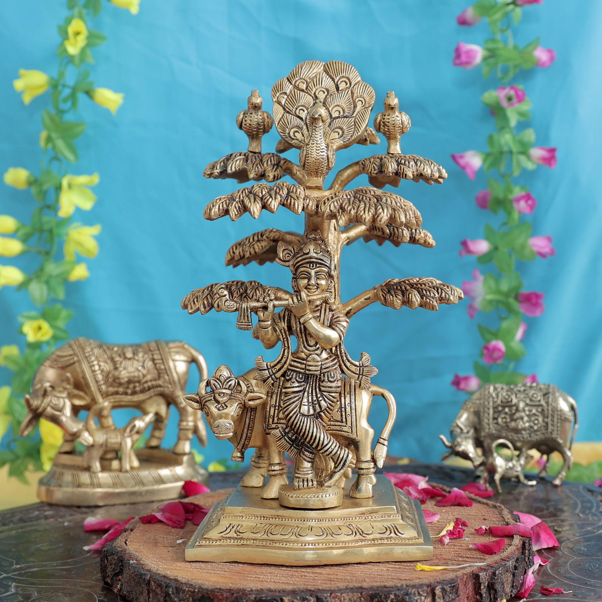 Brass Kamdhenu Tree with Krishna Idol - Wish Fulfilling Cow Statue with Gopal