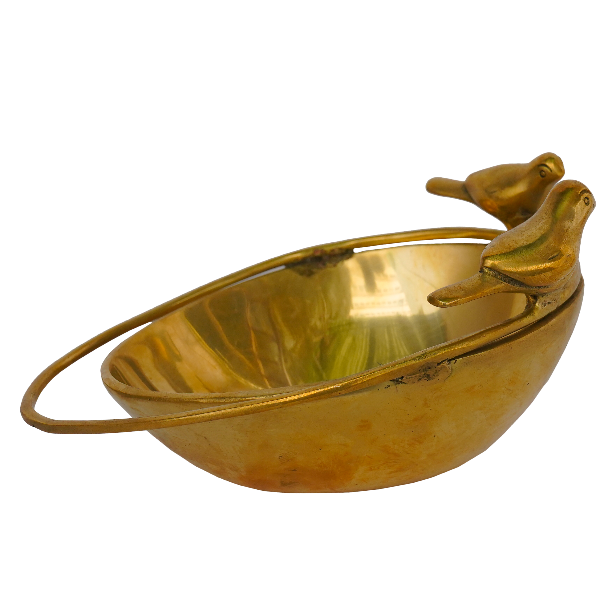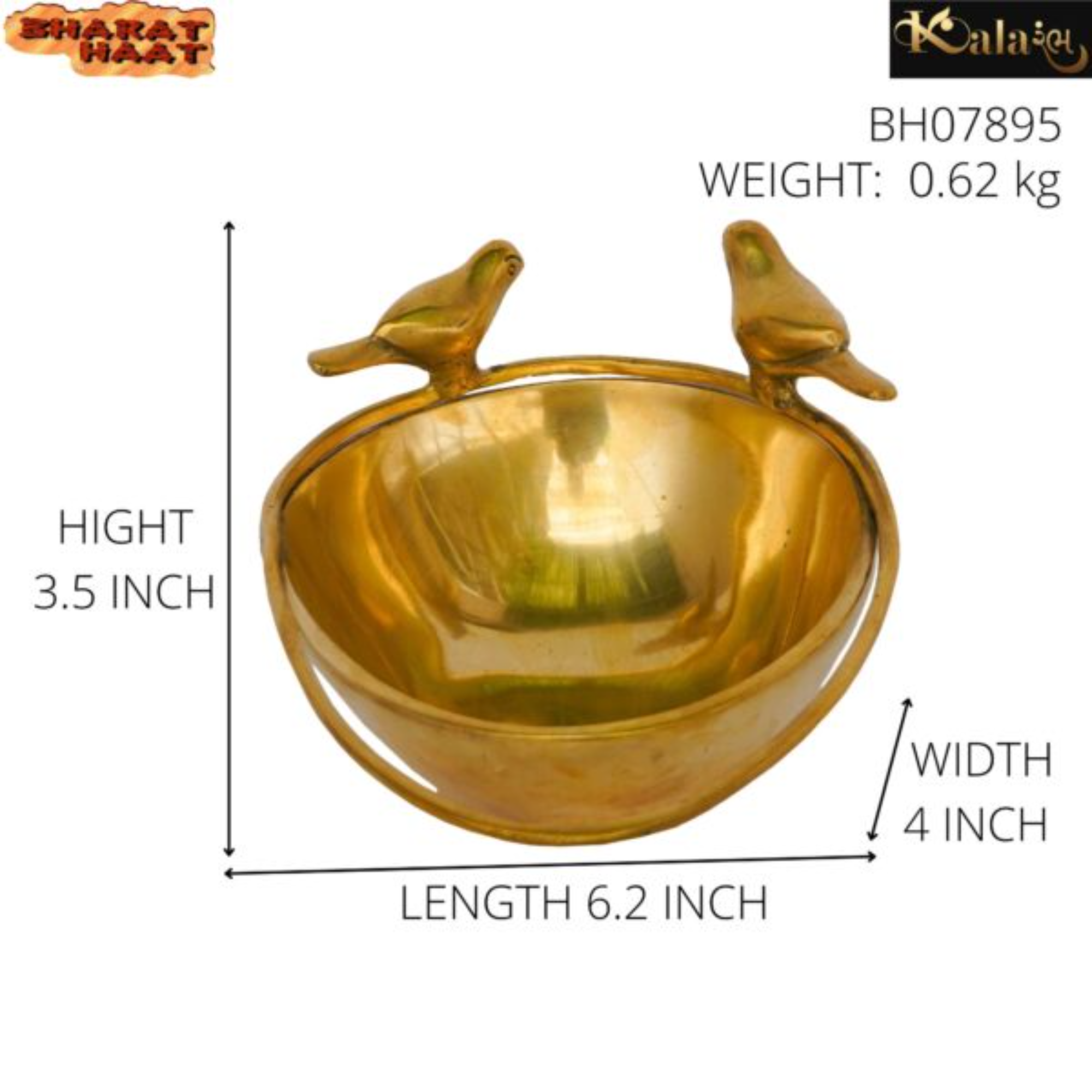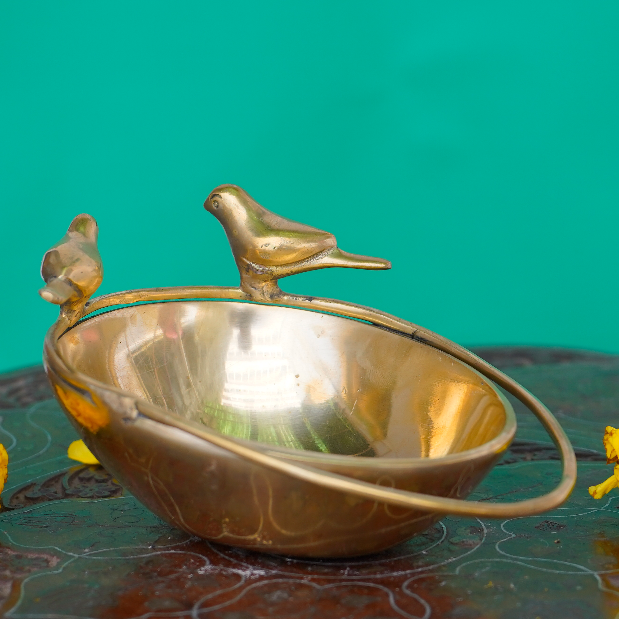 Design: Handcrafted brass urli featuring two birds with intricate detailing