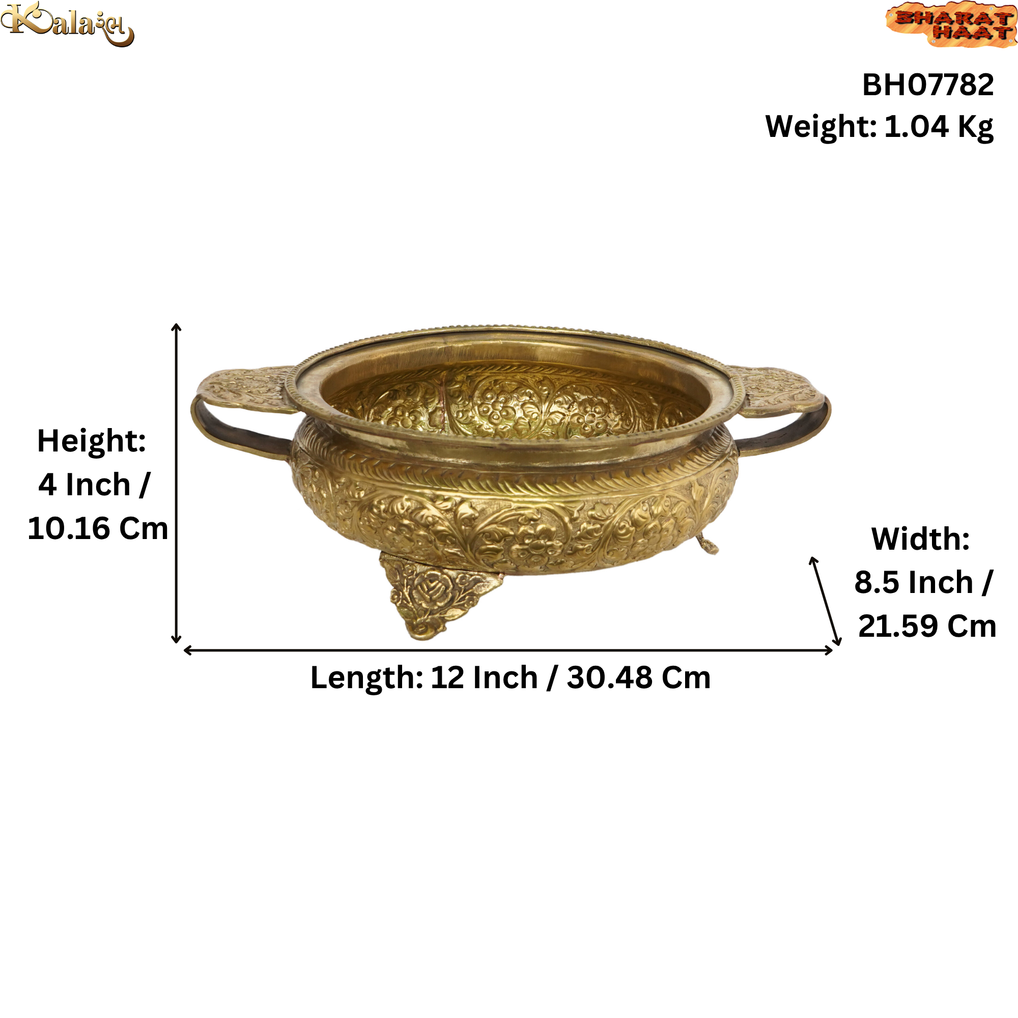 This brass uruli measures 12 x 8.5 x 4 Inch (30.48 x 21.59 x 10.16 cm) and weighs 1.04 Kg, making it a sturdy yet elegant piece. The high-quality brass construction ensures durability, timeless shine, and long-lasting use. Its traditional design makes it suitable for daily rituals, festivals, and special occasions.