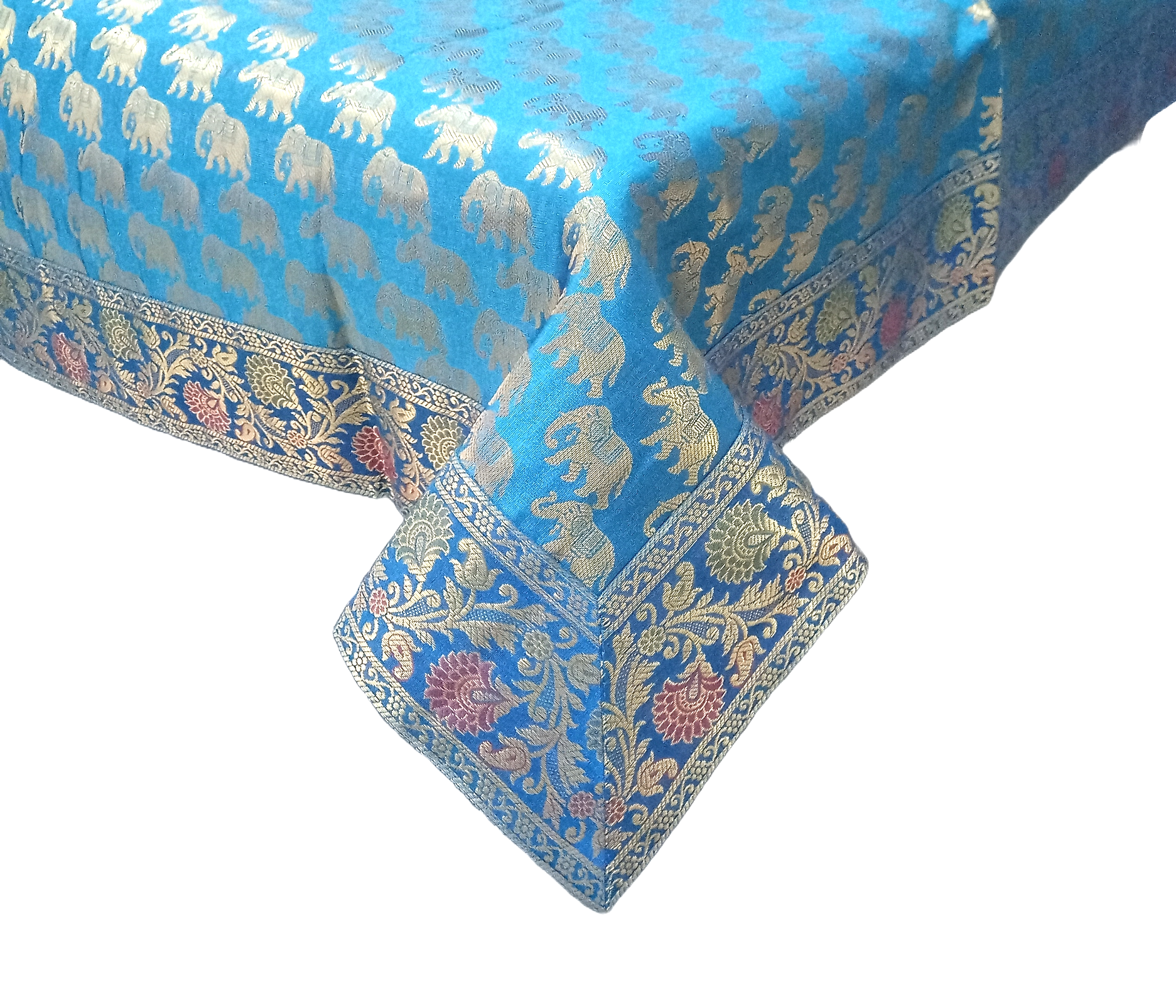 Brocade Silk Table Cloth Square 1 Meter x 1 Meter | Decorative Dining Table Mat with Golden Jacquard Weave | Elegant Home Decor for Festive & Special Occasions - Turquoise