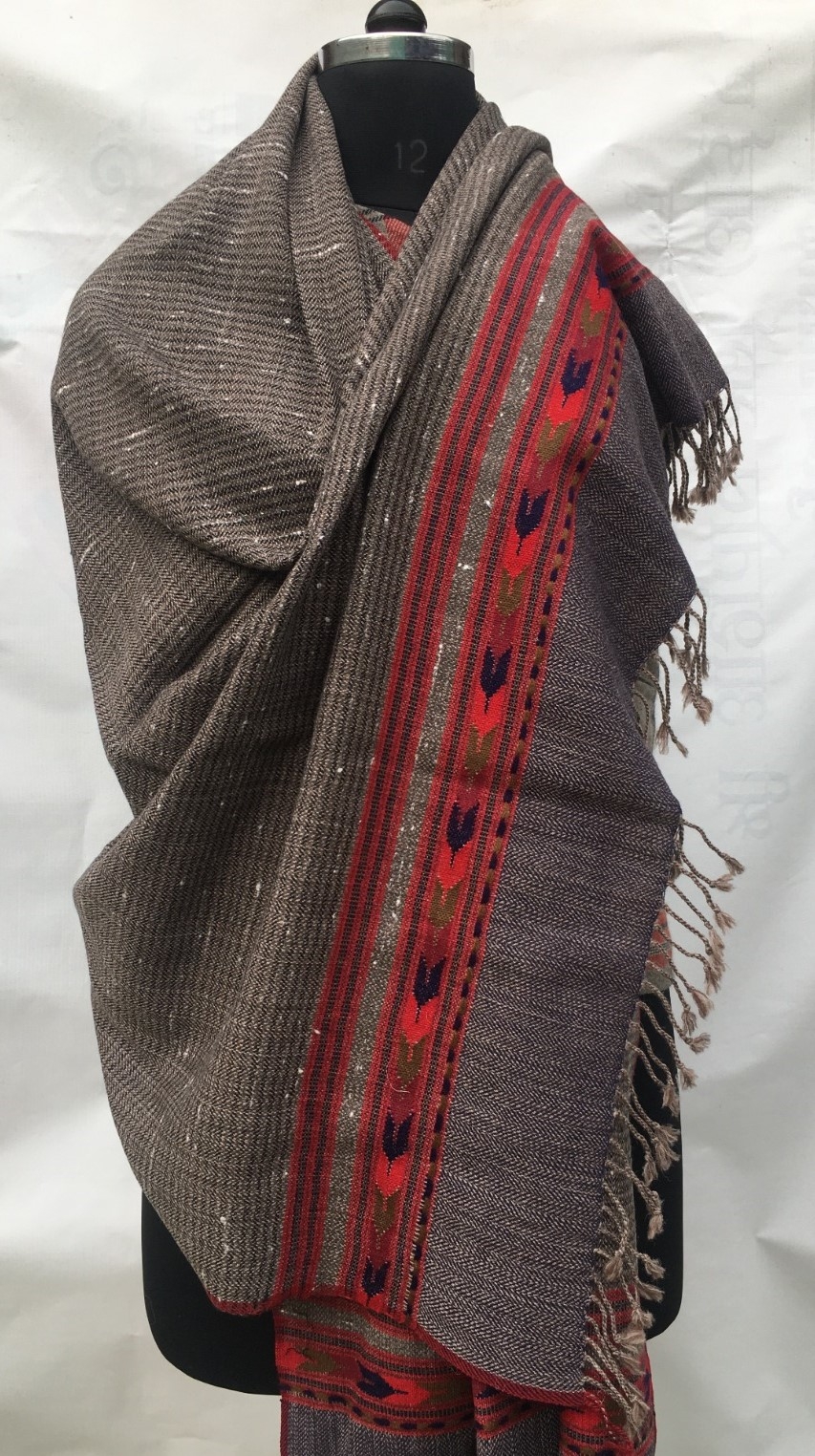Brown Kullu shawl woven in wool with traditional Kullu design on both ends. Addition of multi color stripe enhances its beauty. Simple yet elegant design makes it worth buying for its visually appealing outlook. This elegant shawl is ideal choice for warm cover for any social occasion especially during winter. Great women’s accessory for casual wear.
