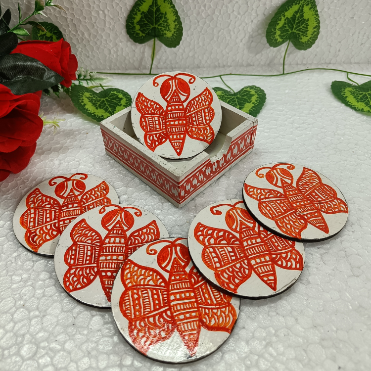 Add a touch of traditional elegance to your space with this beautifully handpainted Madhubani coaster set. Crafted on durable MDF wood, each coaster features intricate artwork inspired by folk art, bringing vibrant colors and cultural charm to your table. The set includes 6 coasters with a matching holder for neat storage. Perfect for protecting surfaces from heat and stains while enhancing your home décor, it also makes a thoughtful and artistic gift.