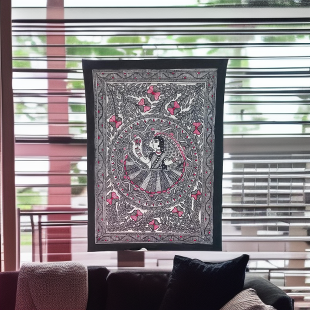 Handcrafted with fine line detailing, the Madhubani art style is one of the oldest and most vibrant art forms of India. The painting features a dancing girl, her movements captured in delicate lines, surrounded by floral motifs. The gold design adds a touch of elegance, bringing a sense of royalty to the piece. Made on premium handmade paper, this painting exudes authenticity and durability, making it perfect for home decor or as a special gift for art lovers.