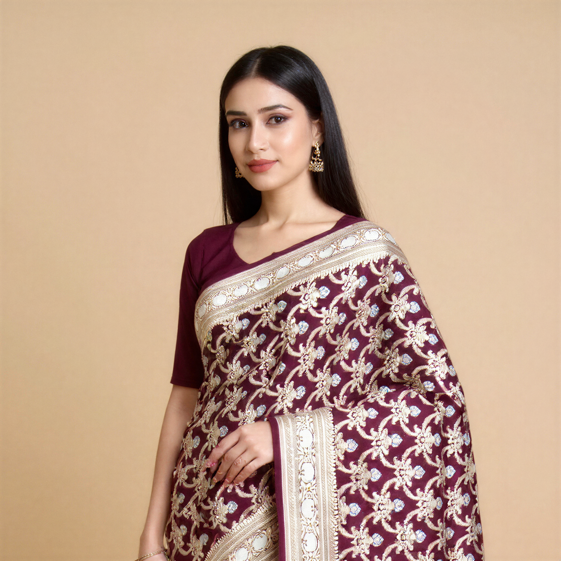 Embrace the richness of Indian tradition with this exquisite maroon Banarasi Silk Karwa saree, a true work of art crafted in the heart of Uttar Pradesh. Ideal for weddings and celebrations, this saree embodies elegance and grace, draping you in the timeless beauty of silk.