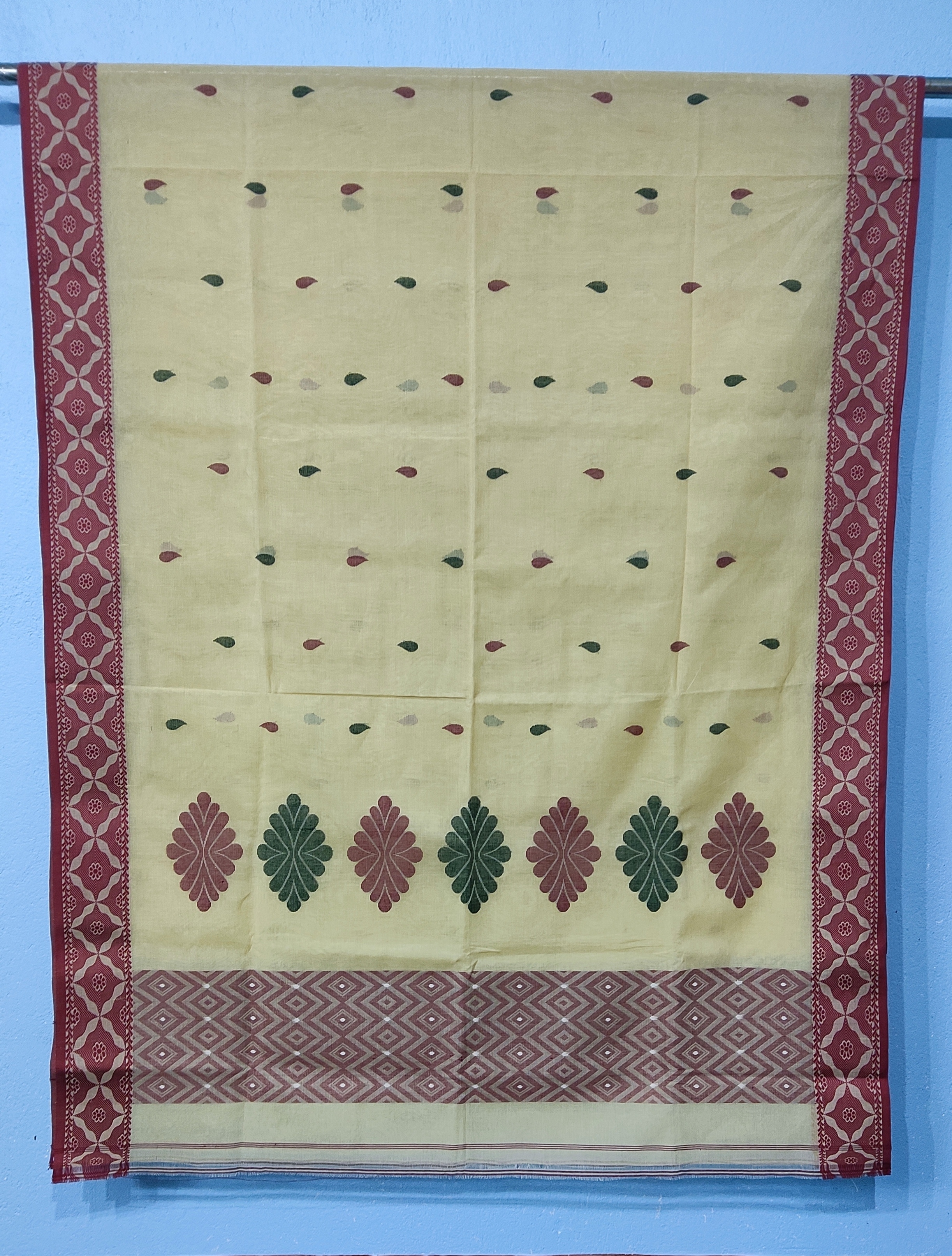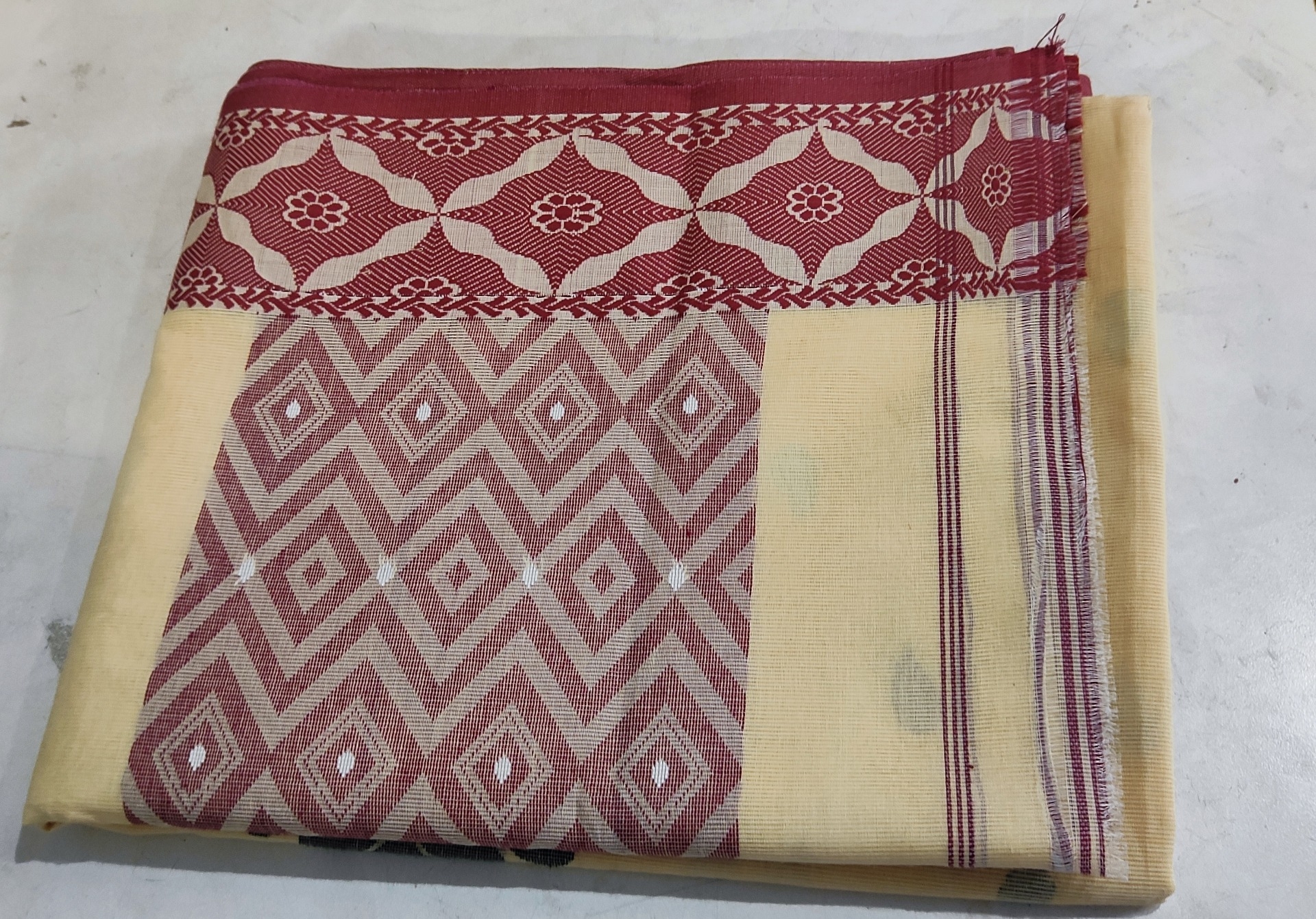 Step into the understated elegance of the Bengal handloom cotton Tangail saree, a garment that carries the soul of West Bengal’s weaving tradition. This cream-coloured saree is more than just fabric; it is a simple formation of 100s cotton, offering an authentic experience of Indian handloom. Reflecting a deep-seated heritage, this traditional saree is a gentle touch of culture and comfort, perfect for the woman who values genuine craftsmanship and subtle sophistication.