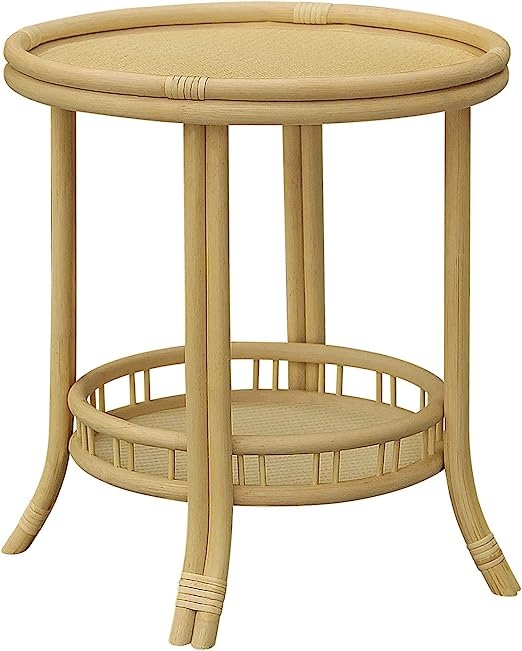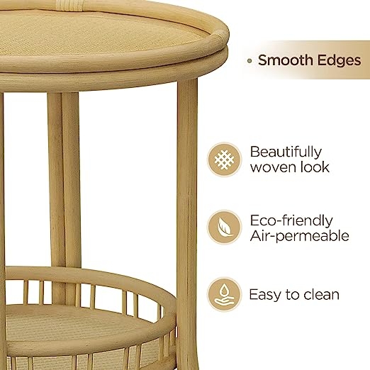 - 【Stable & Safe Design】The frame of the rattan wicker round side table is unique in shape and has a strong sense of design. Its overall frame is polished from rough rattan, which is smooth and durable; The raised table edge and fence are perfect to prevent things from falling; The four feet adopt the rattan leather binding design, which increases stability and beauty.