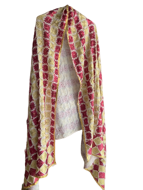 Immerse yourself in the allure of Punjab's cultural heritage with this Cotton Handmade Phulkari Dupatta. Made with love and care, this dupatta is crafted from soft cotton, adorned with intricate floral embroidery, showcasing the exquisite artistry of Punjab.