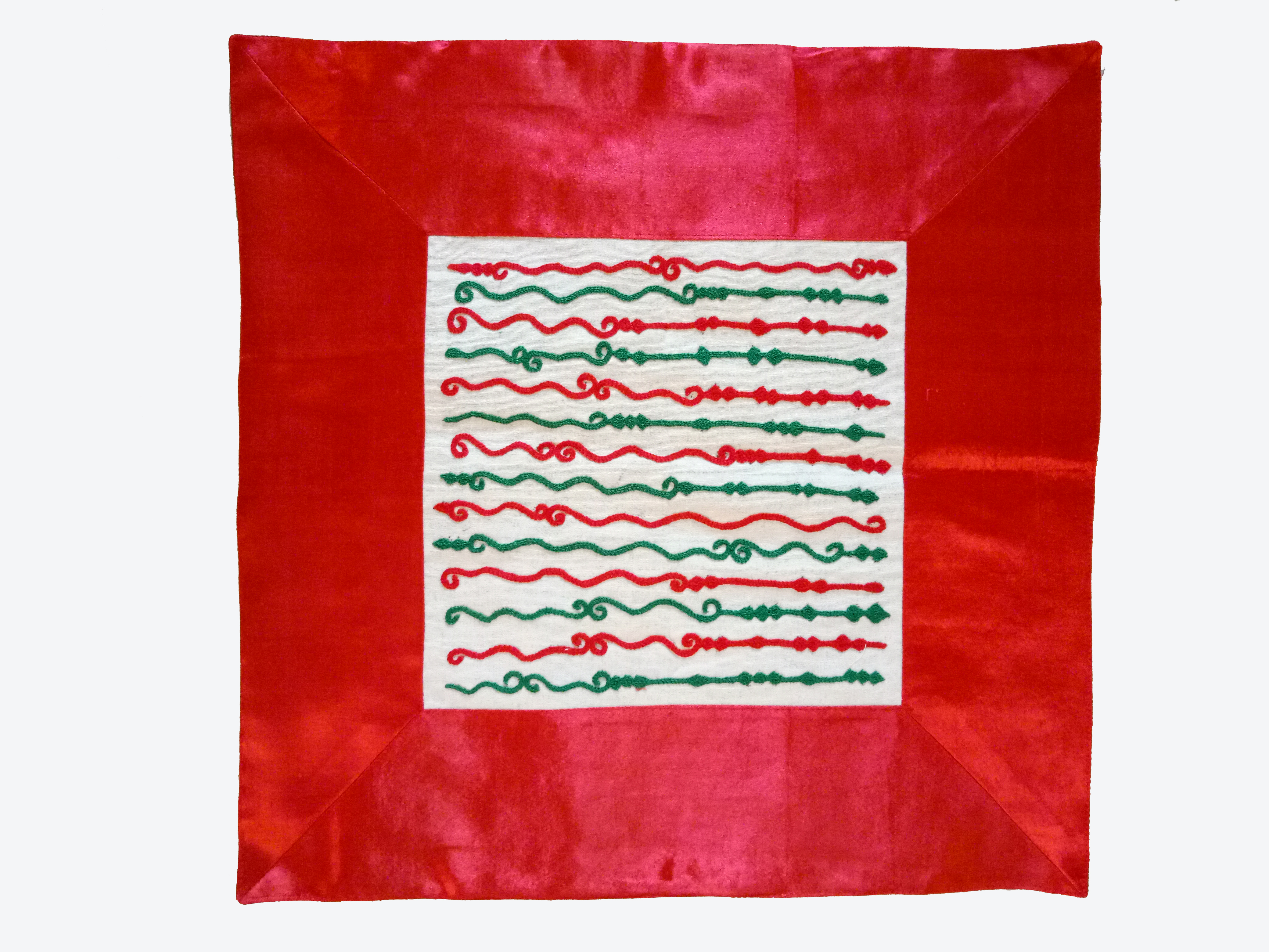 The vibrant red color adds warmth and character to any space. The embroidery pattern features traditional floral motifs with fine finishing and uniformity, reflecting the artist's skilled hands. The cotton silk blend gives the fabric a soft luster while remaining breathable and functional.