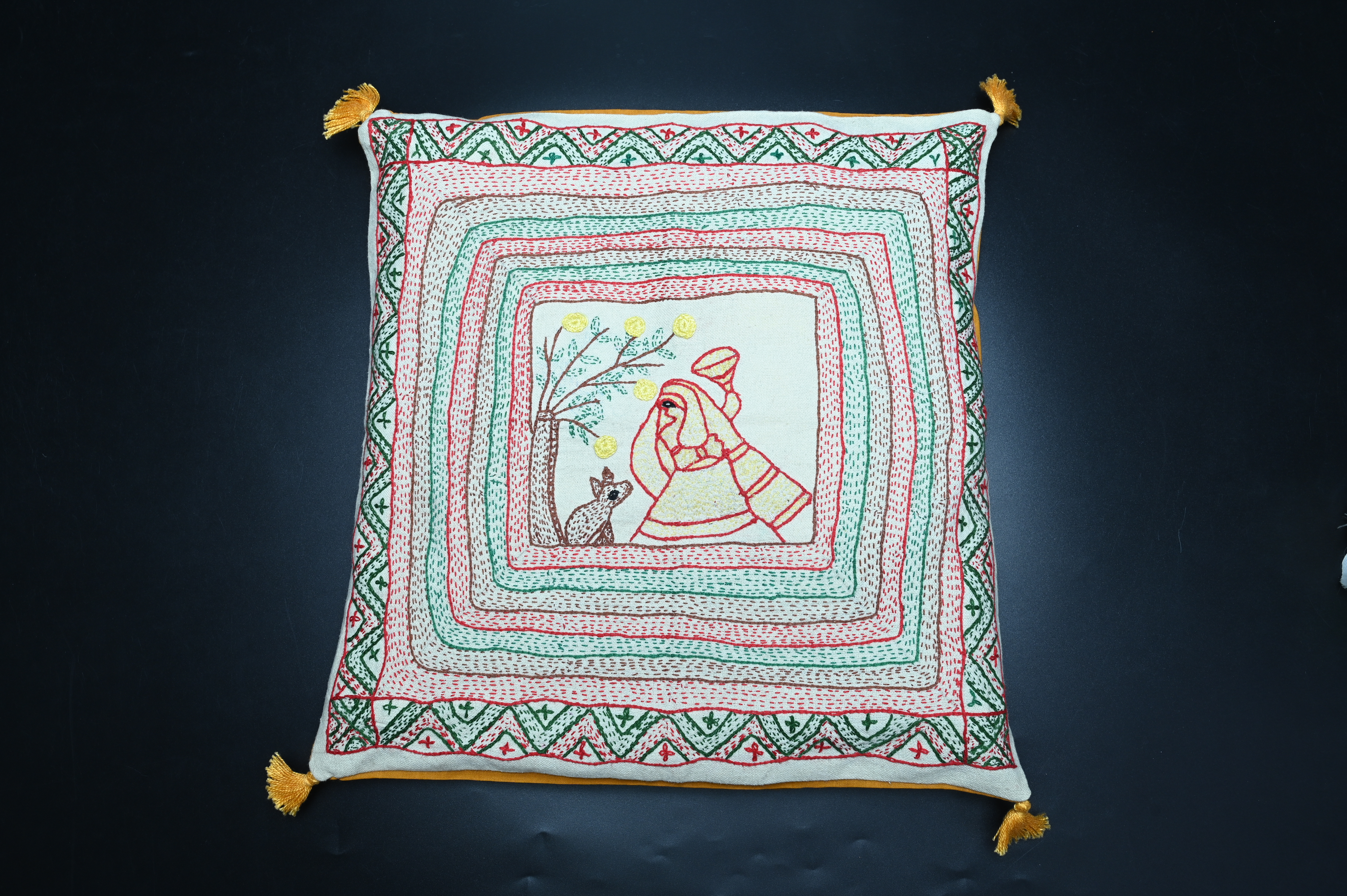 This stunning hand-embroidered cushion cover, handcrafted by the skilled artisans of Aapan Kala in Bihar, is here to be your living room's desi makeover buddy! Forget boring solids – this beauty boasts a riot of vibrant colors and intricate designs, guaranteed to add a touch of desi magic to your space.