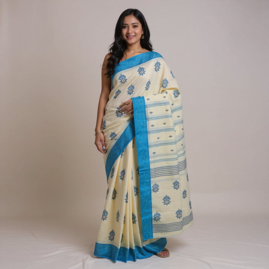 Exclusive Bengal Handloom Cotton Saree| Cream & Blue
