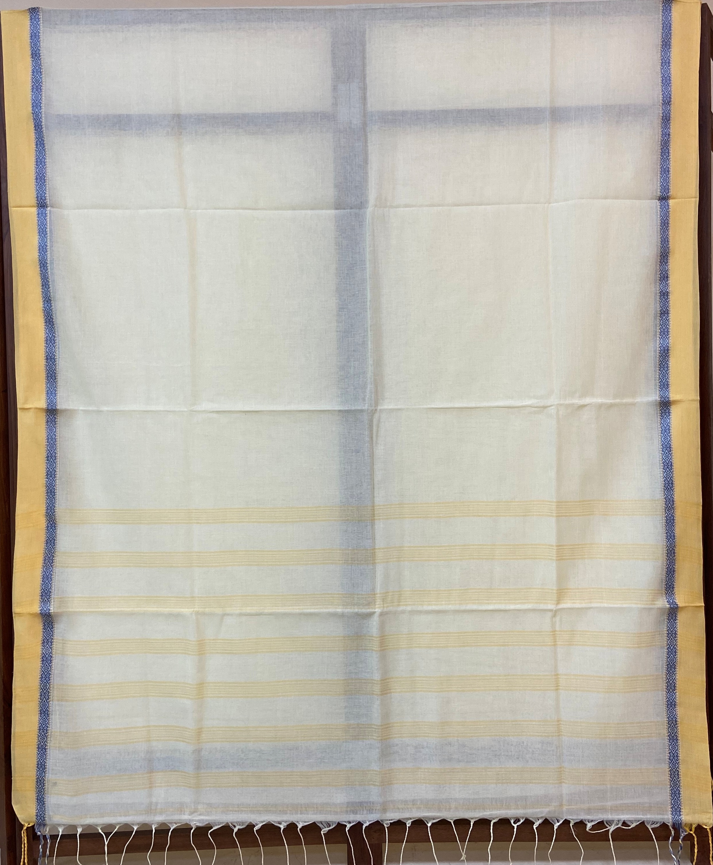 To maintain the integrity of the hand-spun fibres and the delicate border work, this saree requires gentle handling. It is recommended to use a cool wash with a mild detergent. Avoid harsh scrubbing or wringing the fabric. To preserve the natural cream hue and the strength of the 100s count cotton, always dry the saree in a shaded area away from direct sunlight, which can cause the fine threads to become brittle over time.