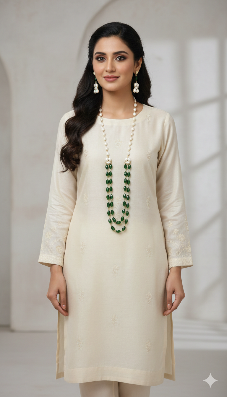 What makes this necklace special is its ability to shift between styles. It works beautifully with sarees, kurtis, dresses, and even simple tops. The emerald green beads add a rich accent, while the pearls keep the look grounded and elegant. Lightweight and easy to wear, the set feels comfortable even during long hours.