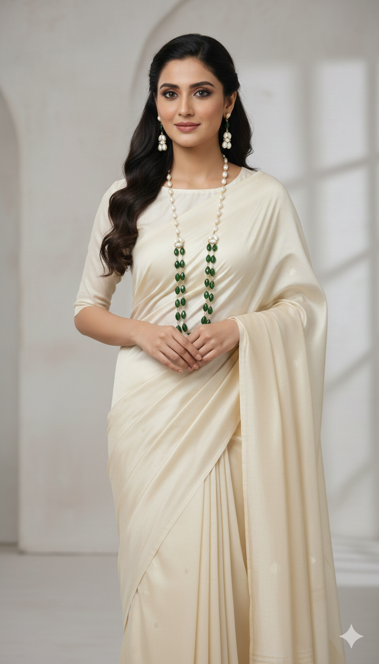 Each necklace begins with the careful selection of glass beads. Artisans first choose smooth, luminous white oval pearls for the upper section, ensuring uniform shape and gentle sheen. As the design flows downward, the necklace transitions into two distinct strands of emerald green faceted beads. These beads are cut to reflect light beautifully, adding depth and movement. Every strand is assembled by hand, bead by bead, with attention to balance and drape so the necklace sits naturally on the neckline. The matching earrings are crafted separately, forming a delicate cluster of one green bead and three pearls, echoing the necklace’s design language.
