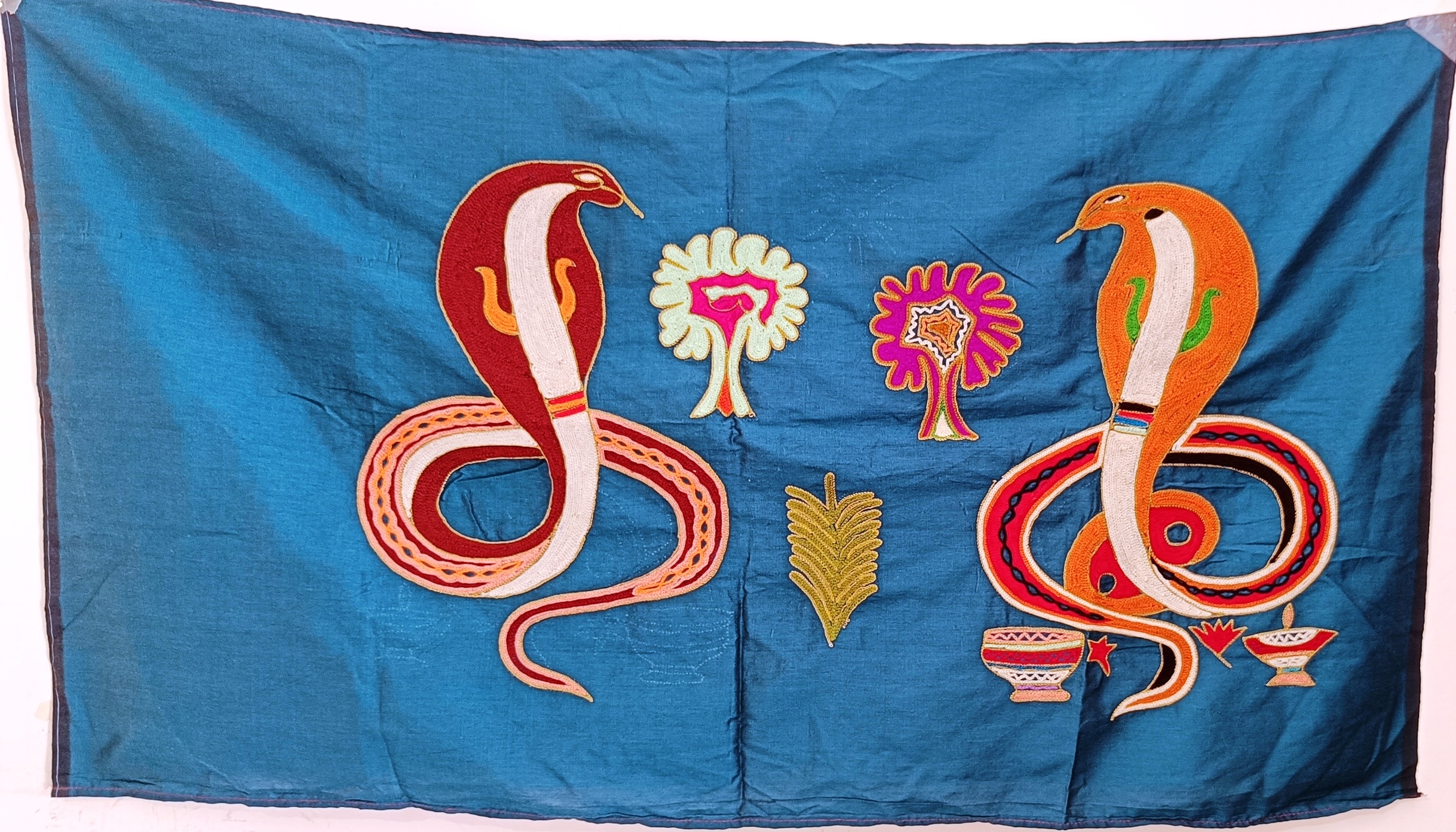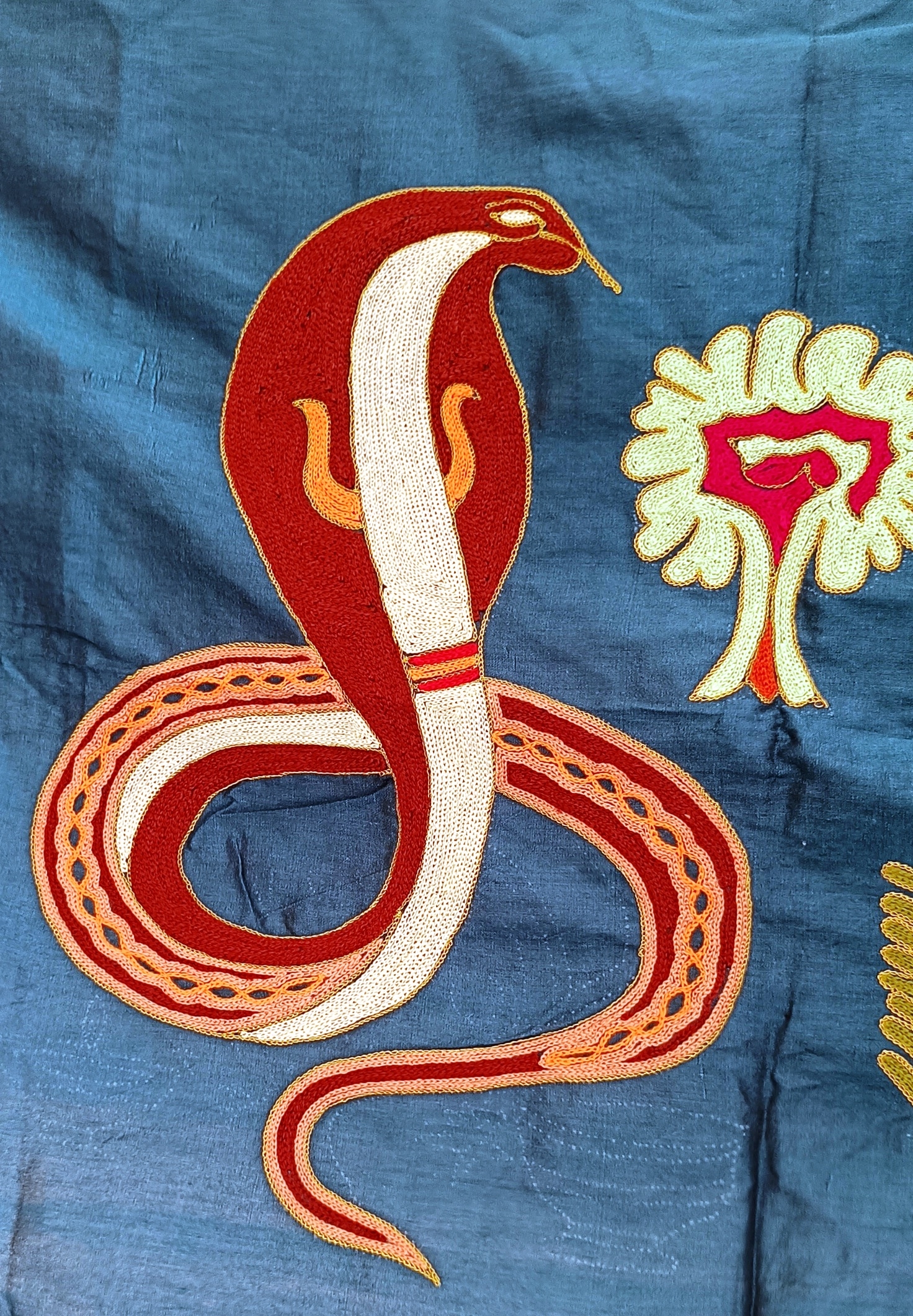 Goga Bapu, a revered folk deity worshipped across parts of Gujarat, Rajasthan, and Madhya Pradesh, is known as the protector against snake bites and a guardian of rural communities. His tales are told through oral traditions, songs, and festivals, deeply rooted in the lives of farmers and villagers. This handcrafted wall hanging pays tribute to his divine presence—stitched in patience and colored with faith.