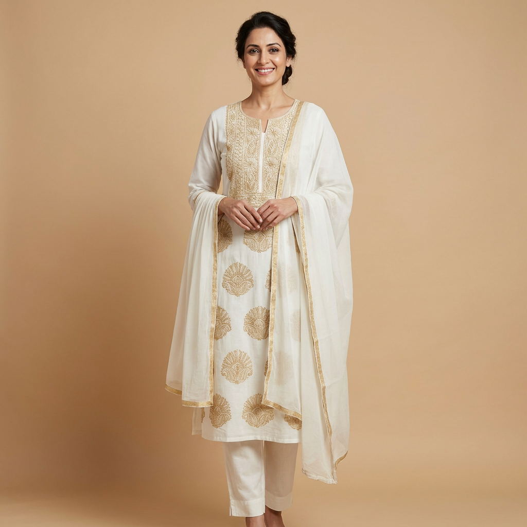 The suit comes complete with a sheer chiffon dupatta, adding a lightweight, flowing layer that elevates the entire ensemble. The combination of the structured cotton kurta fabric and the delicate chiffon dupatta creates a beautiful contrast of textures that is perfect for the discerning Indian woman.