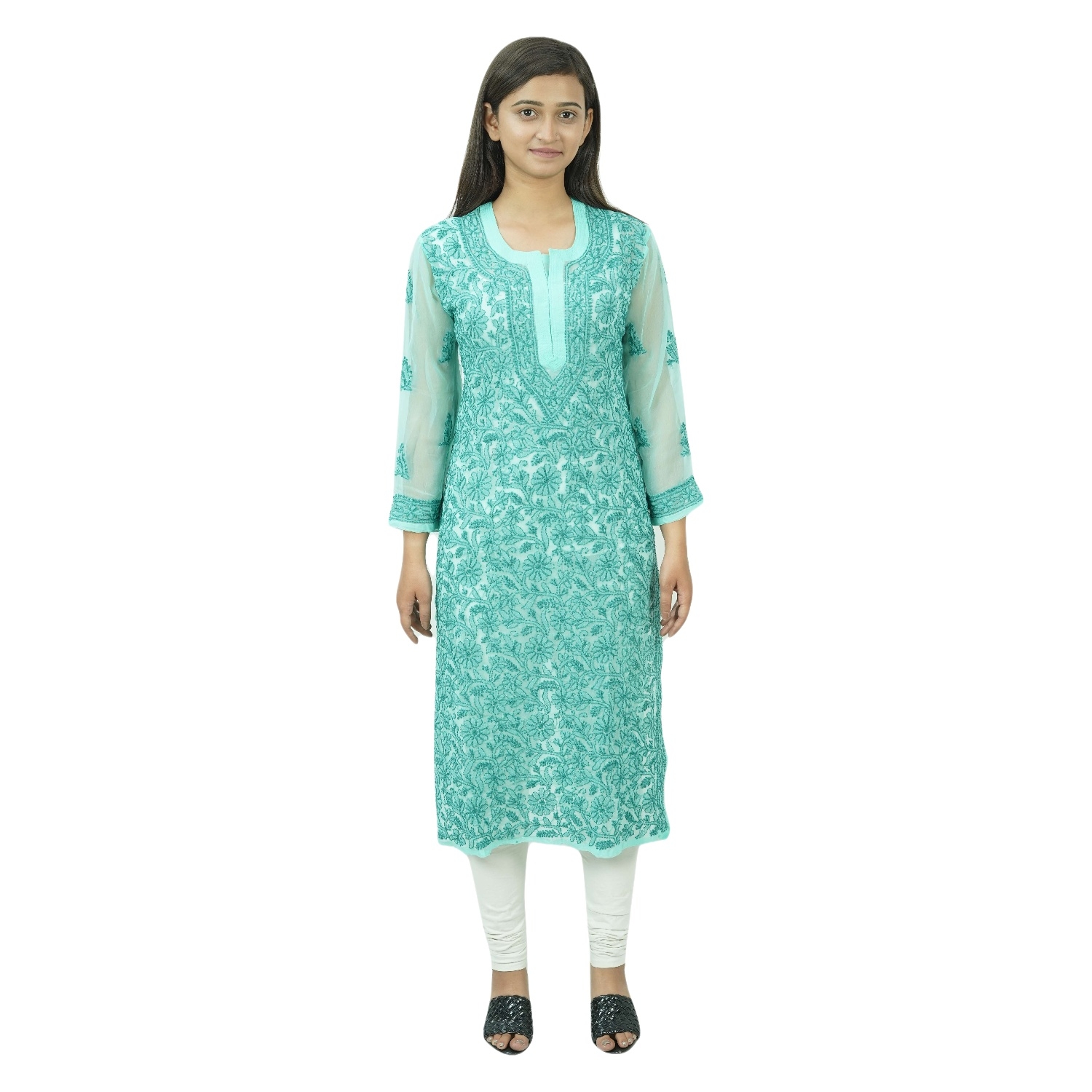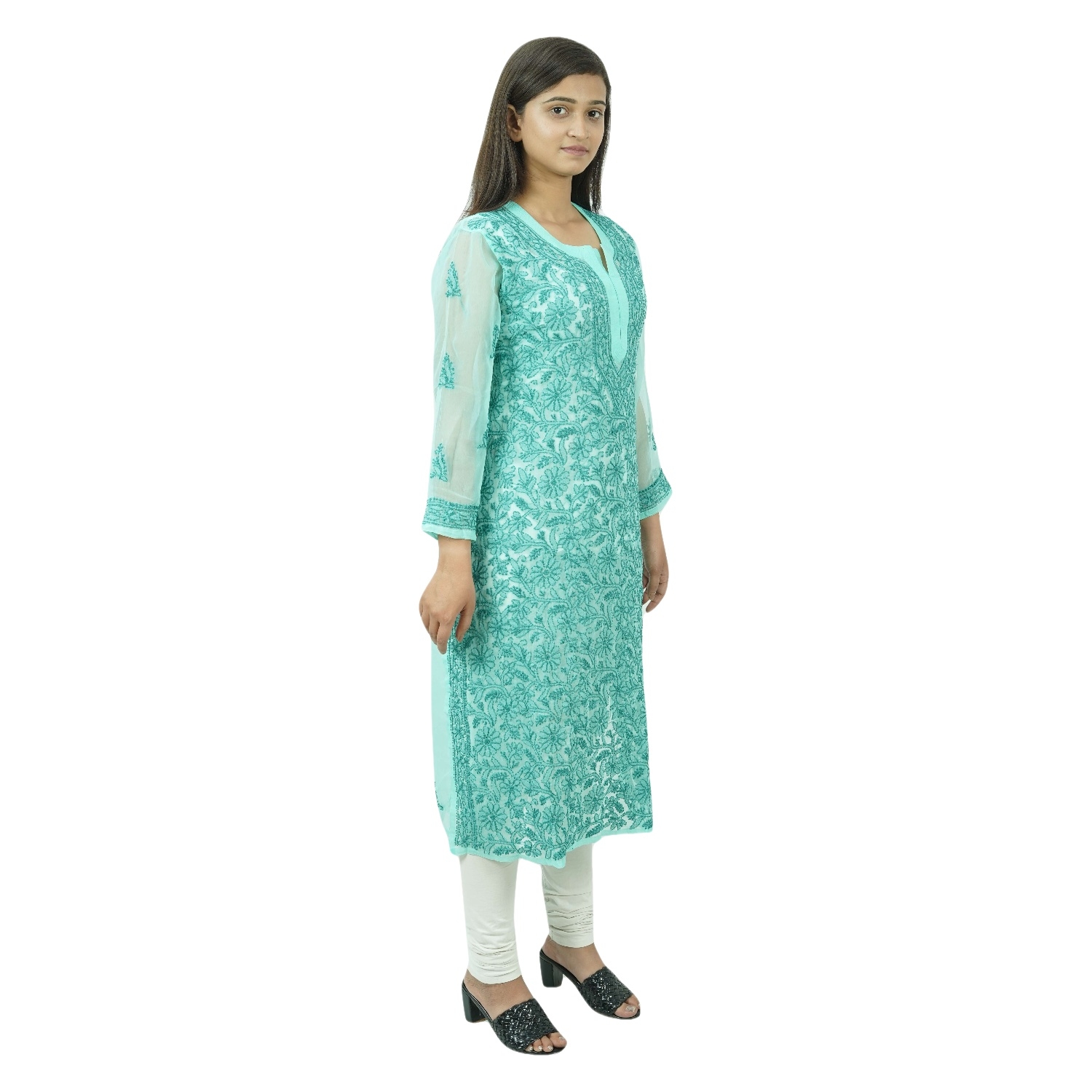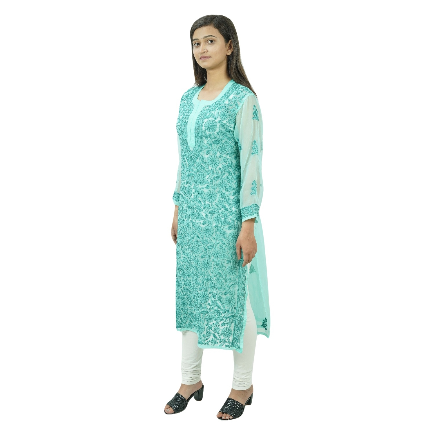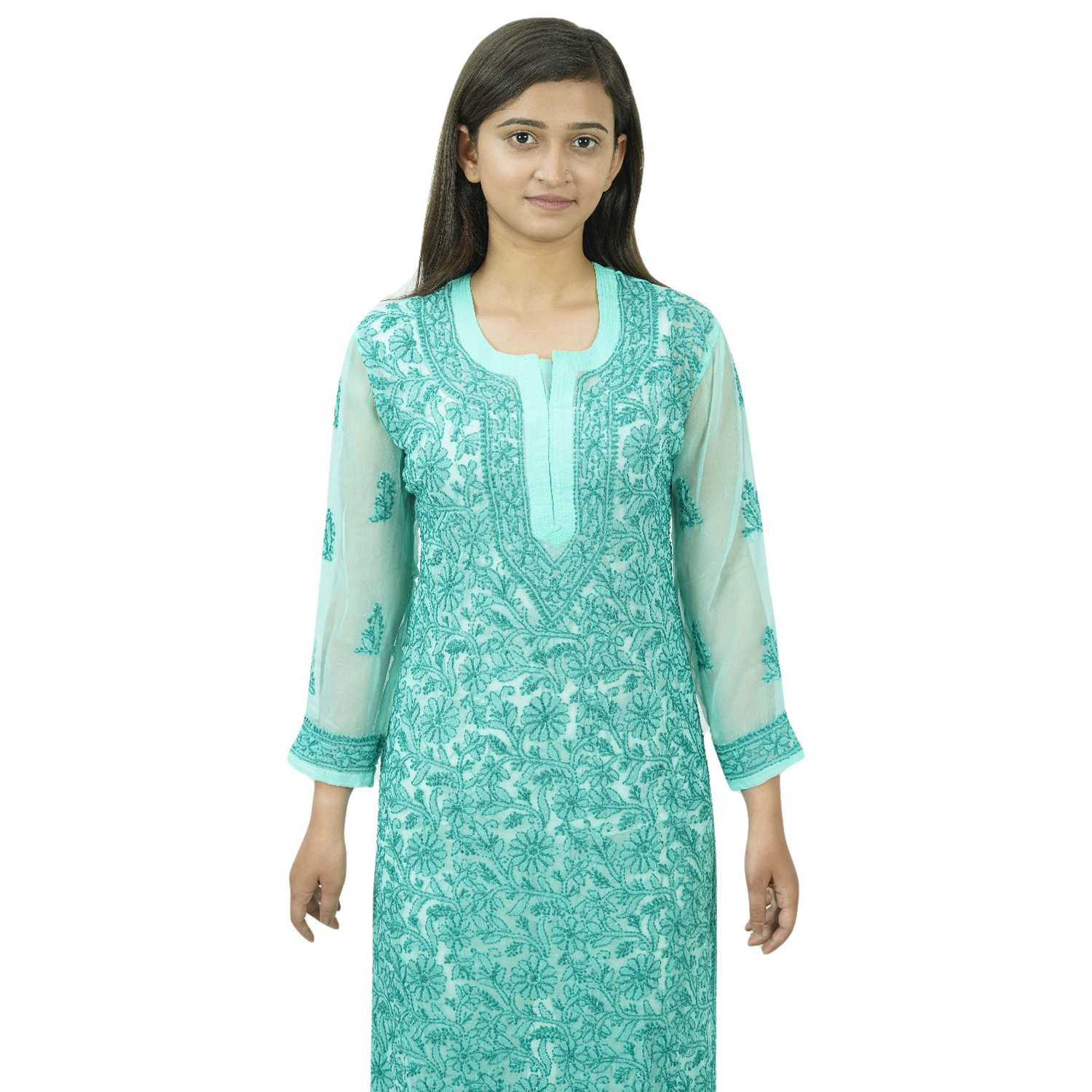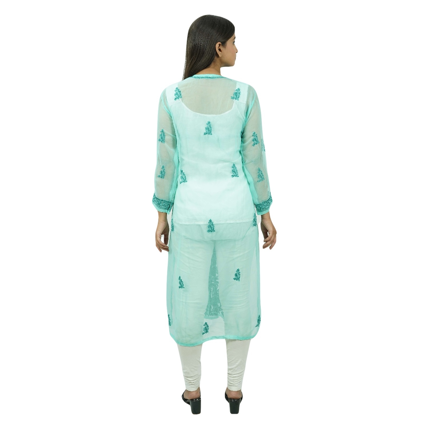 Hand-Embroidered Turquoise Chikankari Kurti | XL