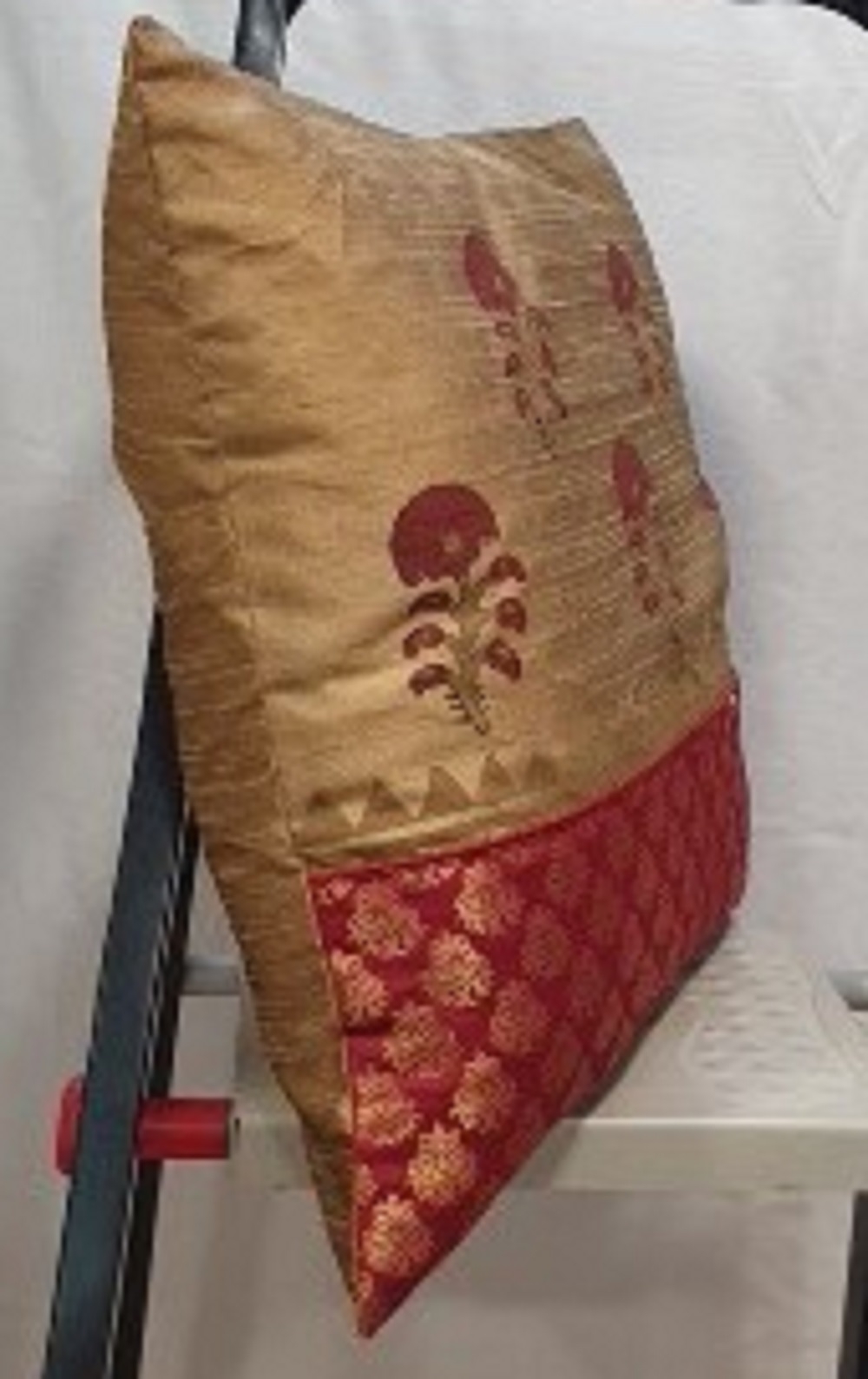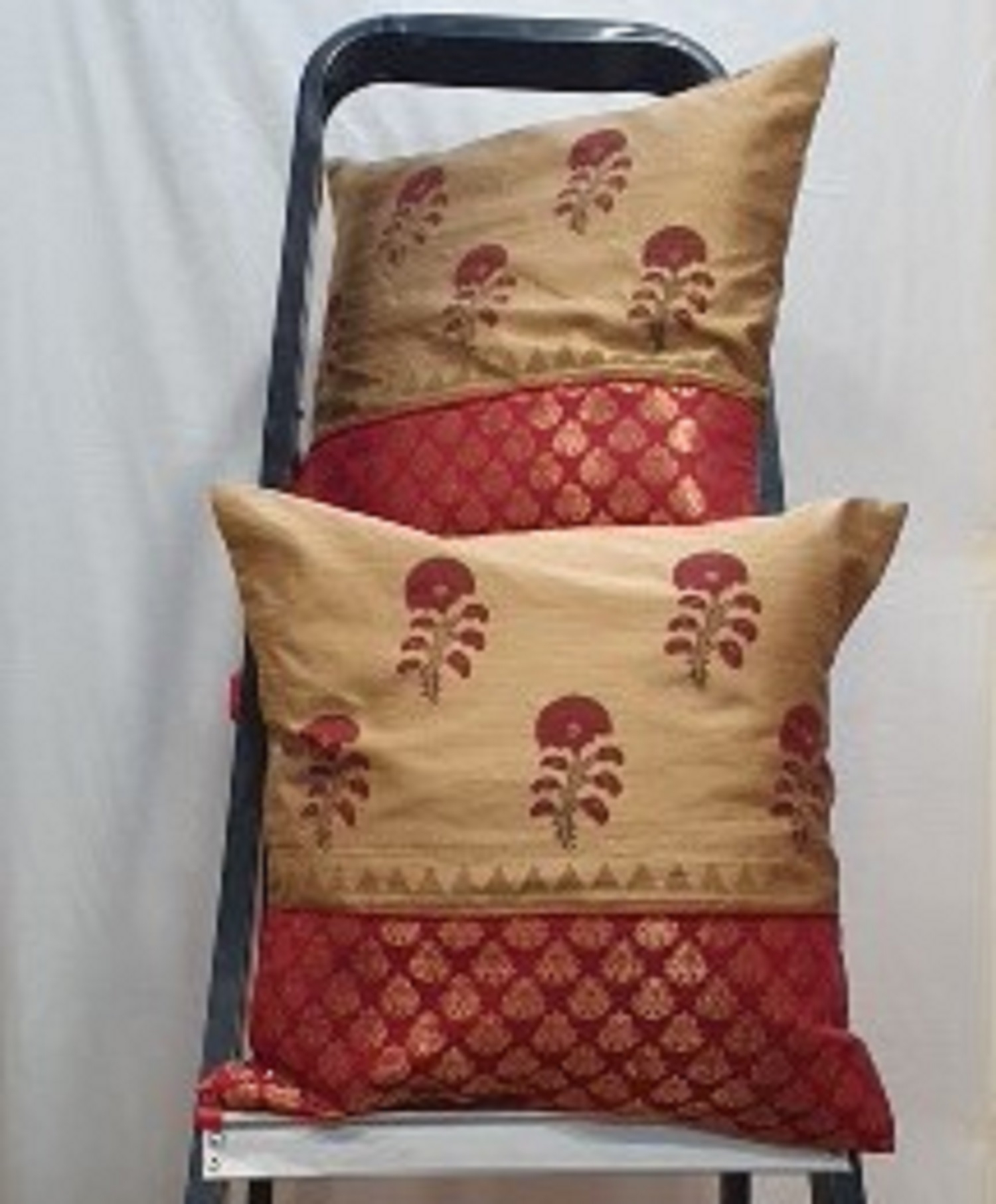 Bring home the richness of traditional Indian craftsmanship with this exquisite handmade cushion cover. Featuring a sophisticated combination of beige and deep red tones, adorned with floral classic border detailing, this cushion cover adds a regal charm to any room. Made from premium quality fabric, this cushion cover offers both elegance and durability. Whether placed on your sofa, bed, or chair, it instantly elevates your space with its ethnic appeal, making it ideal for everyday use or festive decor.