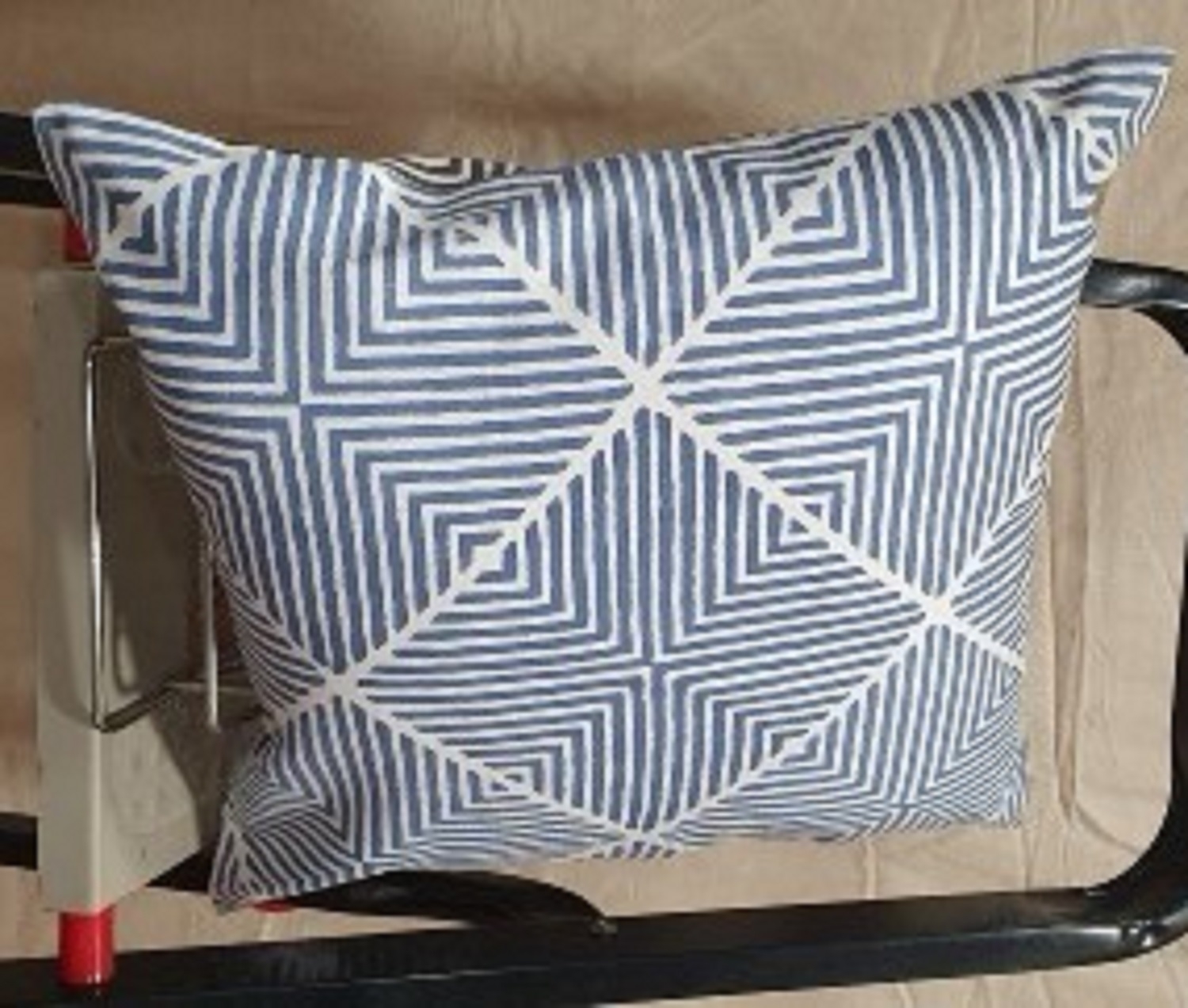 This handcrafted cushion cover is a perfect blend of modern design and traditional technique. Featuring an eye-catching blue and white triangle-based geometric pattern, it is hand block printed on premium cotton fabric. The clean lines and bold design make it an ideal addition to any contemporary or ethnic décor setting-whether it's your living room, study, or bedroom.