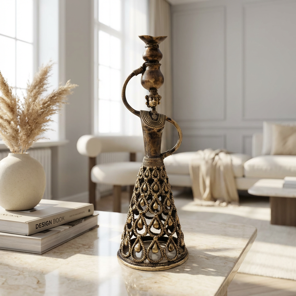 This Dhokra tribal woman figurine holds profound cultural significance, celebrating the strength, grace, and essential role of women in tribal societies. The image of a woman carrying a pot on her head is iconic in Indian culture, representing daily rituals of water collection, domestic responsibility and the nurturing spirit that sustains communities. The elaborate jewelry signifies festive occasions, ceremonies and the cultural pride tribal communities take in their traditional adornments. The openwork skirt is particularly remarkable, the cascading teardrop patterns create visual movement and lightness whilst showcasing extraordinary technical skill, as creating such delicate openwork in the lost-wax process requires exceptional precision. The small bird perched atop the pot adds a whimsical touch and may symbolise freedom, nature or divine blessings. This decorative showpiece works beautifully in living rooms, study rooms, office cabins, reception areas, boutique hotels or art galleries. It serves as a powerful statement about cultural heritage, feminine strength, and artistic excellence. This piece makes the best gift for marriage anniversaries, parents, Mother's Day celebrations, wedding return gifts, birthdays, housewarming ceremonies, office inaugurations, festive occasions like Diwali and Grah Pravesh and as corporate gifts that demonstrate cultural sophistication and appreciation for authentic Indian craftsmanship.