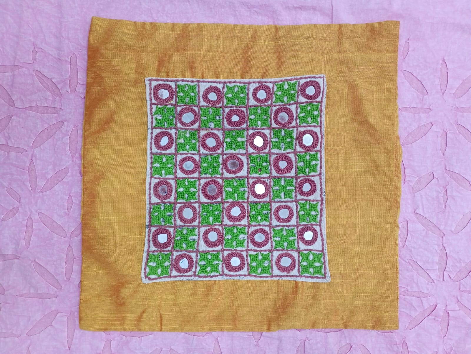 Brighten your home with the vibrant charm of our handcrafted Embroidery and Mirror Work Cushion Cover. Made from luxurious mustard yellow silk fabric, this stunning piece features intricate embroidery and sparkling mirror work, adding a touch of regal elegance to any room.