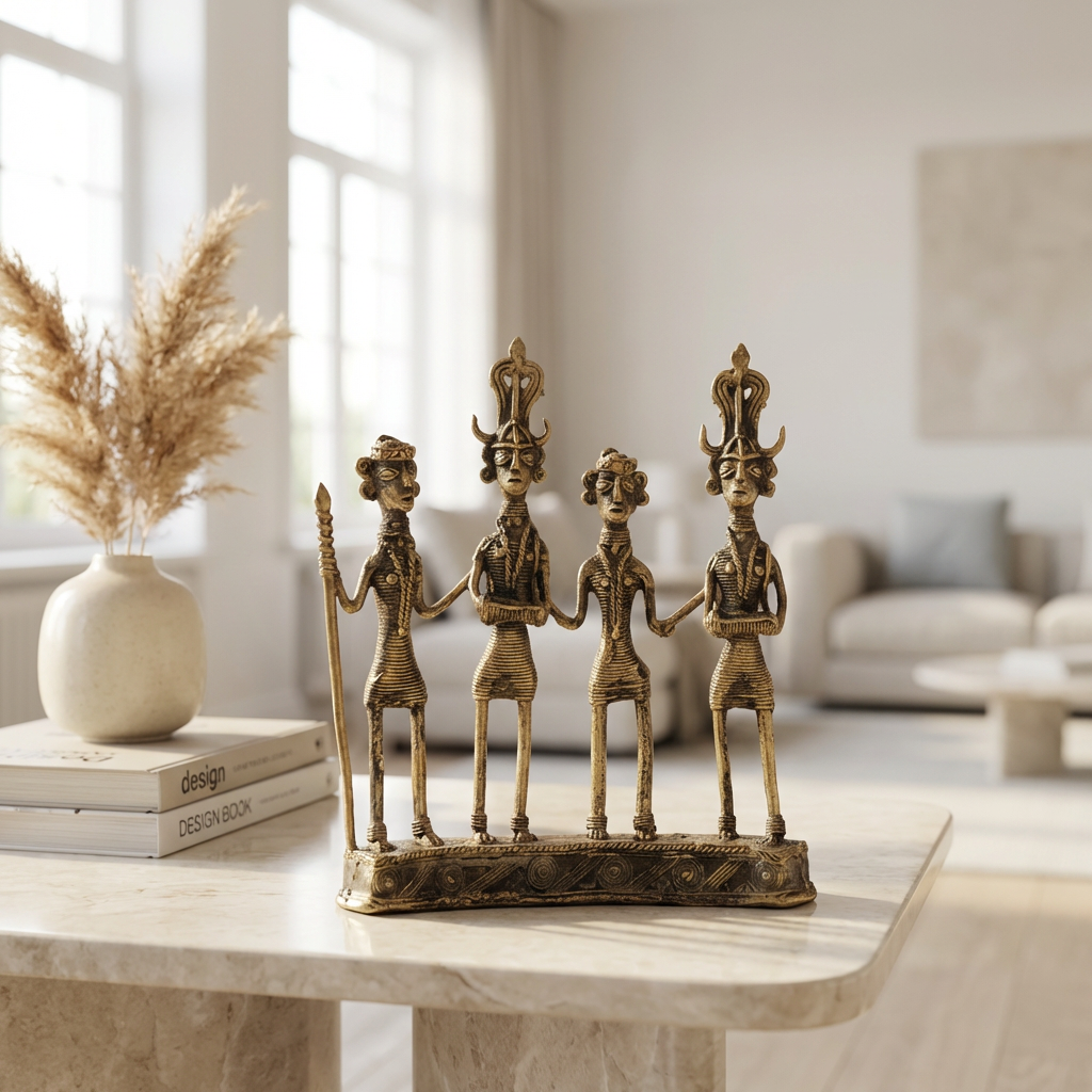 This extraordinary showpiece is created using the Dhokra Damar technique, a 4,000-year-old lost-wax casting method that has been preserved and perfected by tribal artisan communities across India. The Bhareva artisans begin by creating intricate wax models of each figure, paying careful attention to distinctive features like elongated bodies, elaborate headdresses, traditional jewellery and cultural adornments. The four figures stand on a decorative base, their bodies featuring horizontal ridged patterns that suggest traditional tribal ornamentation and clothing. Two central figures wear prominent crowns or headdresses with distinctive curved elements, possibly representing tribal leaders or ceremonial participants. The figures are depicted holding hands in an unbroken chain, symbolising community bonds, collective strength and the interconnectedness that defines tribal societies. Each figure carries unique characteristics; some hold staffs or ceremonial objects, whilst their faces display the distinctive stylized features characteristic of Dhokra art. The antique golden brass finish, with its rich patina and textured surface, gives the piece an ancient, timeless quality that speaks to centuries of artistic tradition and cultural continuity.