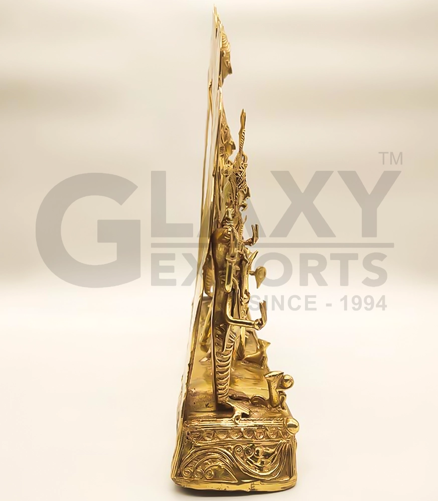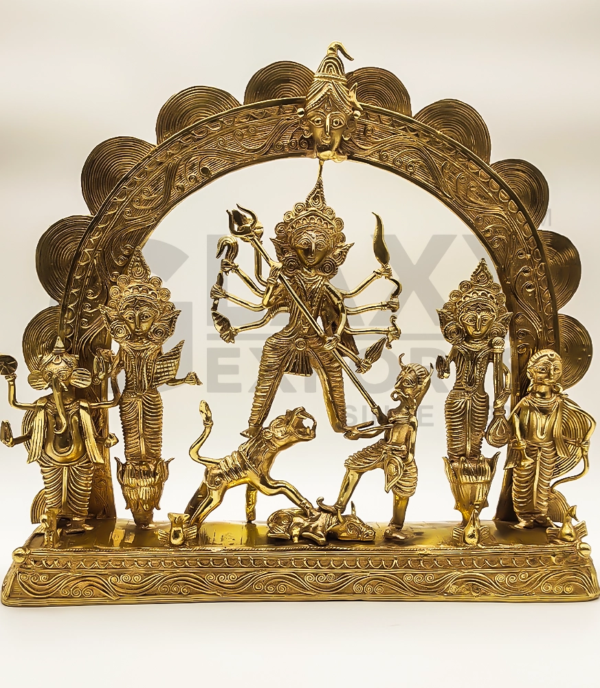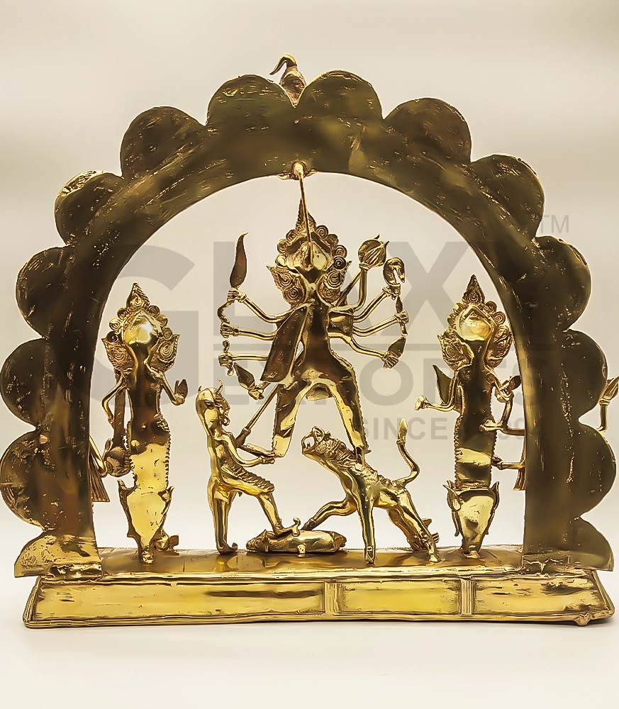 The artisans, working with skill and reverence, carefully craft every curve, pattern and texture. The centrepiece of this idol is Maa Durga, depicted in her powerful, multi-armed form, surrounded by celestial beings, divine attendants and symbolic motifs. The delicate, swirling patterns and rustic textures are shaped with patience and precision, reflecting both the artist’s touch and the spiritual energy embedded in the creation. The antique golden finish adds a sense of timelessness, making this idol not only a piece of art but also a spiritual emblem.