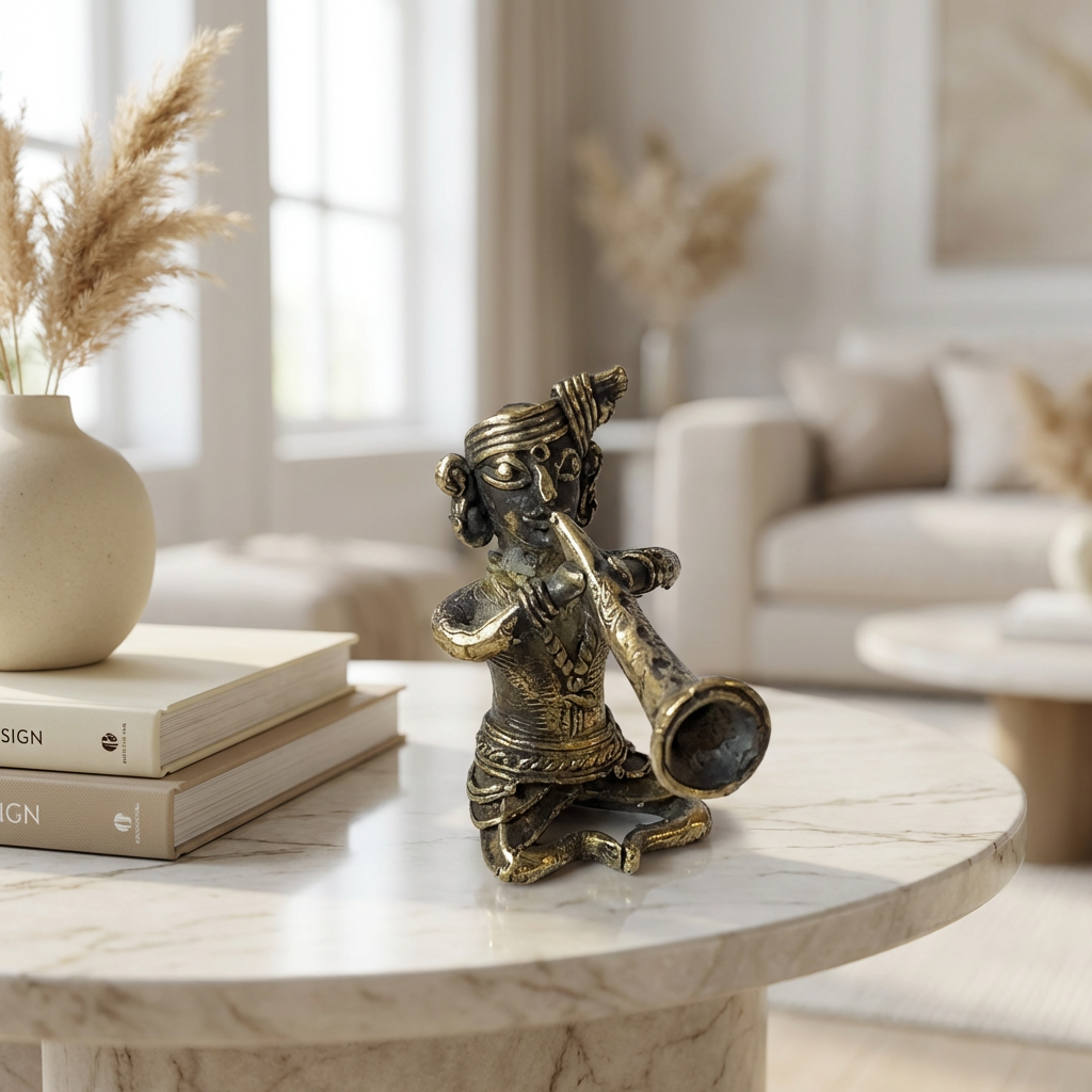 This extraordinary figurine is created using the Dhokra technique, also known as Dhokra Damar casting, a 4,000-year-old lost-wax method that has been perfected and preserved by tribal communities like the Bhareva. The artisans begin by sculpting an intricate wax model of the musician, paying careful attention to every detail, from the elaborate turban (pagdi) wrapped on his head to the delicate positioning of his fingers on the shehnai. The figure is depicted in a dynamic pose, one hand supporting the long shehnai whilst his face shows concentration and perhaps the hint of a smile, suggesting the joy that music brings to celebrations. The musician wears traditional tribal ornamentation: detailed earrings, necklaces and decorative bands on his arms and waist that speak to the ceremonial importance of his role. His lower body features textured patterns suggesting traditional clothing, whilst he appears to be seated or positioned on a decorative base. The elaborate embellishments and perfect form suggest this is no ordinary musician, but perhaps a divine or honored figure who performs during the most auspicious ceremonies. The man's smile and his fingers poised delicately on the shehnai bring this brass figurine to life, capturing a frozen moment of musical expression. After the detailed wax model is complete, it's encased in clay, melted out and replaced with molten brass, a process that destroys the original, making each piece truly unique. The antique golden patina finish adds depth and timeless beauty.